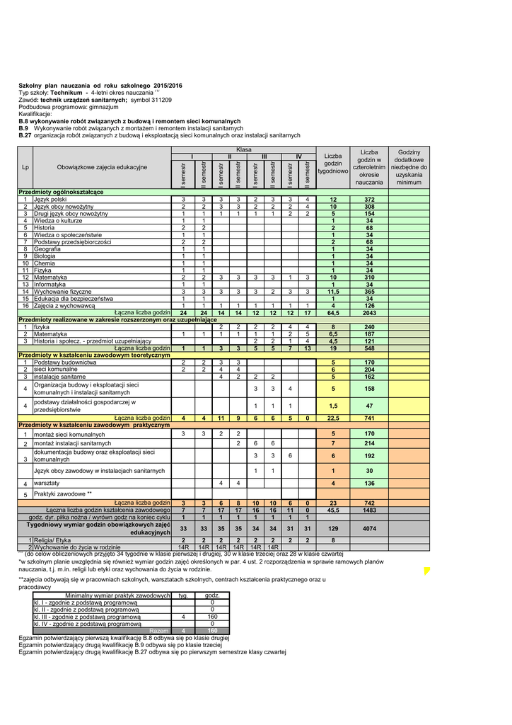 Szkolny plan nauczania od roku szkolnego 2015/2016 Typ szkoły: Technikum - 4-letni okres nauczania /1/ Zawód: technik urządzeń sanitarnych; symbol 311209 Podbudowa programowa: gimnazjum Kwalifikacje: B.8 wykonywanie robót związanych z budową i remontem sieci komunalnych B.9 Wykonywanie robót związanych z montażem i remontem instalacji sanitarnych B.27 organizacja robót związanych z budową i eksploatacją sieci komunalnych oraz instalacji sanitarnych Klasa II semestr I semestr II semestr 3 3 3 2 2 3 1 1 1 1 1 2 2 1 1 2 2 1 1 1 1 1 1 1 1 2 2 3 1 1 3 3 3 1 1 1 1 1 Łączna liczba godzin 24 24 14 Przedmioty realizowane w zakresie rozszerzonym oraz uzupełniające 2 1 fizyka 2 Matematyka 1 1 1 3 Historia i społecz. - przedmiot uzupełniający Łączna liczba godzin 1 1 3 Przedmioty w kształceniu zawodowym teoretycznym 1 Podstawy budownictwa 2 2 3 2 sieci komunalne 2 2 4 3 instalacje sanitarne 4 Organizacja budowy i eksploatacji sieci 4 komunalnych i instalacji sanitarnych 3 3 1 2 2 1 3 2 1 3 2 2 4 4 2 3 3 3 1 3 3 3 2 3 3 1 14 1 12 1 12 1 12 2 1 2 1 2 5 2 1 2 5 4 2 1 7 Lp Obowiązkowe zajęcia edukacyjne I semestr I semestr IV II semestr III I semestr II II semestr I Przedmioty ogólnokształcące 1 Język polski 2 Język obcy nowożytny 3 Drugi język obcy nowożytny 4 Wiedza o kulturze 5 Historia 6 Wiedza o społeczeństwie 7 Podstawy przedsiębiorczości 8 Geografia 9 Biologia 10 Chemia 11 Fizyka 12 Matematyka 13 Informatyka 14 Wychowanie fizyczne 15 Edukacja dla bezpieczeństwa 16 Zajęcia z wychowawcą podstawy działalności gospodarczej w przedsiębiorstwie Łączna liczba godzin Przedmioty w kształceniu zawodowym praktycznym 3 3 4 2 4 1 2 3 montaż sieci komunalnych montaż instalacji sanitarnych dokumentacja budowy oraz eksploatacji sieci komunalnych 4 4 11 9 3 3 2 2 2 Język obcy zawodowy w instalacjach sanitarnych 4 warsztaty 5 Praktyki zawodowe ** 4 Liczba Godziny Liczba godzin w dodatkowe godzin czteroletnim niezbędne do tygodniowo okresie uzyskania nauczania minimum 1 17 12 10 5 1 2 1 2 1 1 1 1 10 1 11,5 1 4 64,5 372 308 154 34 68 34 68 34 34 34 34 310 34 365 34 126 2043 4 5 4 13 8 6,5 4,5 19 240 187 121 548 5 6 5 170 204 162 2 2 3 3 4 5 158 1 1 1 1,5 47 6 6 5 22,5 741 5 170 7 214 6 192 1 30 4 136 6 6 3 3 1 1 0 6 4 Łączna liczba godzin 3 3 6 8 10 10 6 0 23 742 Łączna liczba godzin kształcenia zawodowego 7 7 17 17 16 16 11 0 45,5 1483 godz. dyr. piłka nożna / wyrówn godz na koniec cyklu 1 1 1 1 1 1 1 1 Tygodniowy wymiar godzin obowiązkowych zajęć 33 33 35 35 34 34 31 31 129 4074 edukacyjnych 1 Religia/ Etyka 2 2 2 2 2 2 2 2 8 2 Wychowanie do życia w rodzinie 14R 14R 14R 14R 14R 14R /1/ (do celów obliczeniowych przyjęto 34 tygodnie w klasie pierwszej i drugiej, 30 w klasie trzeciej oraz 28 w klasie czwartej *w szkolnym planie uwzględnia się również wymiar godzin zajęć określonych w par. 4 ust. 2 rozporządzenia w sprawie ramowych planów nauczania, t.j. m.in. religii lub etyki oraz wychowania do życia w rodzinie. **zajęcia odbywają się w pracowniach szkolnych, warsztatach szkolnych, centrach kształcenia praktycznego oraz u pracodawcy godz. Minimalny wymiar praktyk zawodowych tyg. 0 kl. I - zgodnie z podstawą programową 0 kl. II - zgodnie z podstawą programową 160 kl. III - zgodnie z podstawą programową 4 0 kl. IV - zgodnie z podstawą programową 160 Razem 4 Egzamin potwierdzający pierwszą kwalifikację B.8 odbywa się po klasie drugiej Egzamin potwierdzający drugą kwalifikację B.9 odbywa się po klasie trzeciej Egzamin potwierdzający drugą kwalifikację B.27 odbywa się po pierwszym semestrze klasy czwartej