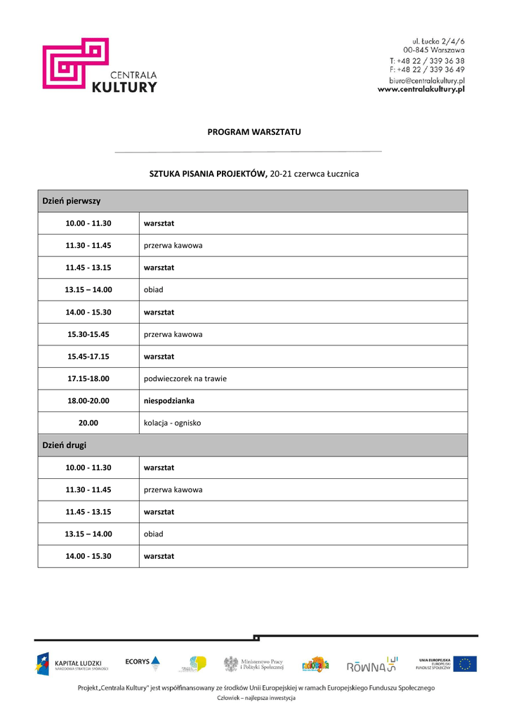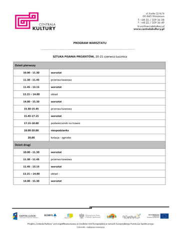 PROGRAM WARSZTATU SZTUKA PISANIA PROJEKTÓW, 20-21 czerwca Łucznica Dzień pierwszy 10.00 - 11.30 warsztat 11.30 - 11.45 przerwa kawowa 11.45 - 13.15 warsztat 13.15 – 14.00 obiad 14.00 - 15.30 warsztat 15.30-15.45 przerwa kawowa 15.45-17.15 warsztat 17.15-18.00 podwieczorek na trawie 18.00-20.00 niespodzianka 20.00 kolacja - ognisko Dzień drugi 10.00 - 11.30 warsztat 11.30 - 11.45 przerwa kawowa 11.45 - 13.15 warsztat 13.15 – 14.00 obiad 14.00 - 15.30 warsztat
