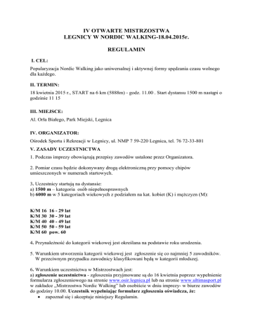 IV OTWARTE MISTRZOSTWA LEGNICY W NORDIC WALKING-18.04.2015r. REGULAMIN I. CEL: Popularyzacja Nordic Walking jako uniwersalnej i aktywnej formy spędzania czasu wolnego dla każdego. II. TERMIN: 18 kwietnia 2015 r., START na 6 km (5888m) - godz. 11.00 . Start dystansu 1500 m nastąpi o godzinie 11 15 III. MIEJSCE: Al. Orła Białego, Park Miejski, Legnica IV. ORGANIZATOR: Ośrodek Sportu i Rekreacji w Legnicy, ul. NMP 7 59-220 Legnica, tel. 76 72-33-801 V. ZASADY UCZESTNICTWA 1. Podczas imprezy obowiązują przepisy zawodów ustalone przez Organizatora. 2. Pomiar czasu będzie dokonywany drogą elektroniczną przy pomocy chipów umieszczonych w numerach startowych. 3. Uczestnicy startują na dystansie: a) 1500 m – kategoria osób niepełnosprawnych b) 6000 m w 5 kategoriach wiekowych z podziałem na kat. kobiet (K) i mężczyzn (M): K/M 16 K/M 30 K/M 40 K/M 50 K/M 60 16 - 29 lat 30 - 39 lat 40 - 49 lat 50 - 59 lat pow. 60 4. Przynależność do kategorii wiekowej jest określana na podstawie roku urodzenia. 5. Warunkiem utworzenia kategorii wiekowej jest zgłoszenie się co najmniej 5 zawodników. W przeciwnym przypadku zawodnicy klasyfikowani będą w kategorii młodszej. 6. Warunkiem uczestnictwa w Mistrzostwach jest: a) zgłoszenie uczestnictwa - zgłoszenia przyjmowane są do 16 kwietnia poprzez wypełnienie formularza zgłoszeniowego na stronie www.osir.legnica.pl lub na stronie www.ultimasport.pl w zakładce „Mistrzostwa Nordic Walking” lub osobiście w dniu imprezy- w biurze zawodów do godziny 10.00. Uczestnik wypełniając formularz zgłoszenia oświadcza, że: zapoznał się i akceptuje niniejszy Regulamin. wyraża zgodę na przetwarzanie swoich danych osobowych przez Ośrodek Sportu i Rekreacji z siedzibą przy ul. Najświętszej Marii Panny 7 59-220 Legnica, zgodnie z ustawą o ochronie danych osobowych z dnia 29 sierpnia 1997r. (Dz.U. 1997 nr 133 poz. 883). wyraża zgodę, aby zdjęcia, nagrania filmowe oraz wywiady z jego osobą, a także wyniki z jego danymi osobowymi mogły być wykorzystane przez prasę, radio i telewizję a także w celach marketingowych Organizatora. ma świadomość, że przysługuje mu prawo wglądu do danych, poprawiania ich. jest zdolny do udziału w imprezie, nie są mu znane żadne powody o charakterze zdrowotnym wykluczające go z udziału oraz że startuje na własną odpowiedzialność b) wniesienie opłaty startowej: - 10 zł osobiście w biurze OSiR przy ul. N.Marii Panny 7, w dniu imprezy w biurze zawodów lub przelewem na konto: 08 1090 2066 0000 0005 4200 0344. Wniesiona opłata startowa nie podlega zwrotowi. c) zgłoszenie się w dniu zawodów z dowodem osobistym do biura Mistrzostw po odbiór numeru startowego do godz. 10.00. Biuro będzie czynne w dniu imprezy od godz. 8.00 i zlokalizowane w Parku Miejskim, Al. Orła Białego (przy Skate Parku) d) w przypadku osób niepełnoletnich dostarczenie pisemnej zgody opiekuna na udział w Mistrzostwach oraz przedłożenie jej w biurze zawodów. 7. Z opłaty startowej zwolnione są osoby startujące w kategorii osób niepełnosprawnych oraz osoby które nie ukończyły 18-tego roku życia. 8. Zgłoszenie zawodników kategorii osób niepełnosprawnych odbywa się wyłącznie osobiście i tylko w dniu zawodów. Uczestnicy startujący w tej kategorii zawodów powinni posiadać podpisaną zgodę opiekuna. Przy zgłoszeniach zbiorowych opiekun grupy powinien dostarczyć listę uczestników potwierdzoną przez instytucję delegującą. 9. Każdy uczestnik zobowiązany jest posiadać własne kije do nordic walking. 10. Podczas rywalizacji sportowej numery startowe powinny być wyraźnie umieszczone na piersi zawodnika. 11. Uczestników Mistrzostw obowiązują zasady fair play aktywnego marszu z kijami (technika nordic walking), niniejszy Regulamin IV Otwartych Mistrzostw Legnicy w NW oraz Przepisy Sportowej Rywalizacji Nordic Walking PSNW 12. Wszystkie numery startowe podlegają zwrotowi. VI. NAGRODY 1. Zwycięzcami we wszystkich kategoriach zostaną uczestnicy, którzy w najkrótszym czasie pokonają trasę 6000 m 2. Zdobywcy miejsc I - III w poszczególnych kategoriach wiekowych wśród kobiet i mężczyzn otrzymają statuetki oraz dyplomy. 3. Zawodnicy, którzy uzyskają najlepszy czas w kat. open wśród kobiet i mężczyzn otrzymają puchary i dyplomy . 4. Puchar i dyplom otrzyma także Najszybsza Legniczanka i Najszybszy Legniczanin. 5. Każdy z uczestników, po przekroczeniu mety, otrzyma pamiątkowy medal. 6. Wszyscy uczestnicy startujący w kategorii osób niepełnosprawnych nagrodzeni zostaną pamiątkowymi medalami. 7. Za najlepsze czasy open (I-III) kobiet i mężczyzn wśród osób niepełnosprawnych wręczone zostaną puchary i dyplomy. 8. Ogłoszenie wyników - po opublikowaniu nieoficjalnych wyników ( zakończeniu sportowej rywalizacji) zawodnicy mają 10 minut na zgłoszenie do Sędziego Głównego protestu. Po zatwierdzeniu oficjalnych wyników nastąpi dekoracja i wręczenie nagród. VII. TRASA 1. Trasa Mistrzostw prowadzić będzie alejami Parku Miejskiego 2. Trasa będzie oznakowana. 3. Na trasie będzie znajdował się punkty odświeżania z wodą VIII. SĘDZIOWANIE 1. Wszyscy sędziowie działają niezależnie od siebie, a ich osąd oparty jest na obserwacji. 2. Sędziowie mają prawo zmieniać miejsce, z którego dokonywana jest ocena prawidłowej techniki nordic walking. . 3. Sędziowie oceniają zgodnie z Regulaminem Mistrzostw oraz Przepisami Sportowej Rywalizacji NW. 4. Otrzymanie żółtej kartki skutkować będzie dodaniem dodatkowych 30 s. do czasu ogólnego. Trzecia żółta kartka oznacza dyskwalifikację zawodnika. O udzieleniu upomnienia/kartki sędzia informuje zawodnika u którego zauważono nieprawidłową technikę / przy braku kontaktu głosowego z zawodnikiem informacja jest przekazana do Sędziego Głównego i Sędzia Główny informuje zawodnika o otrzymaniu upomnienia/kartki. IX. POSTANOWIENIA KOŃCOWE 1.Wszelkie kwestie sporne związane z rywalizacją