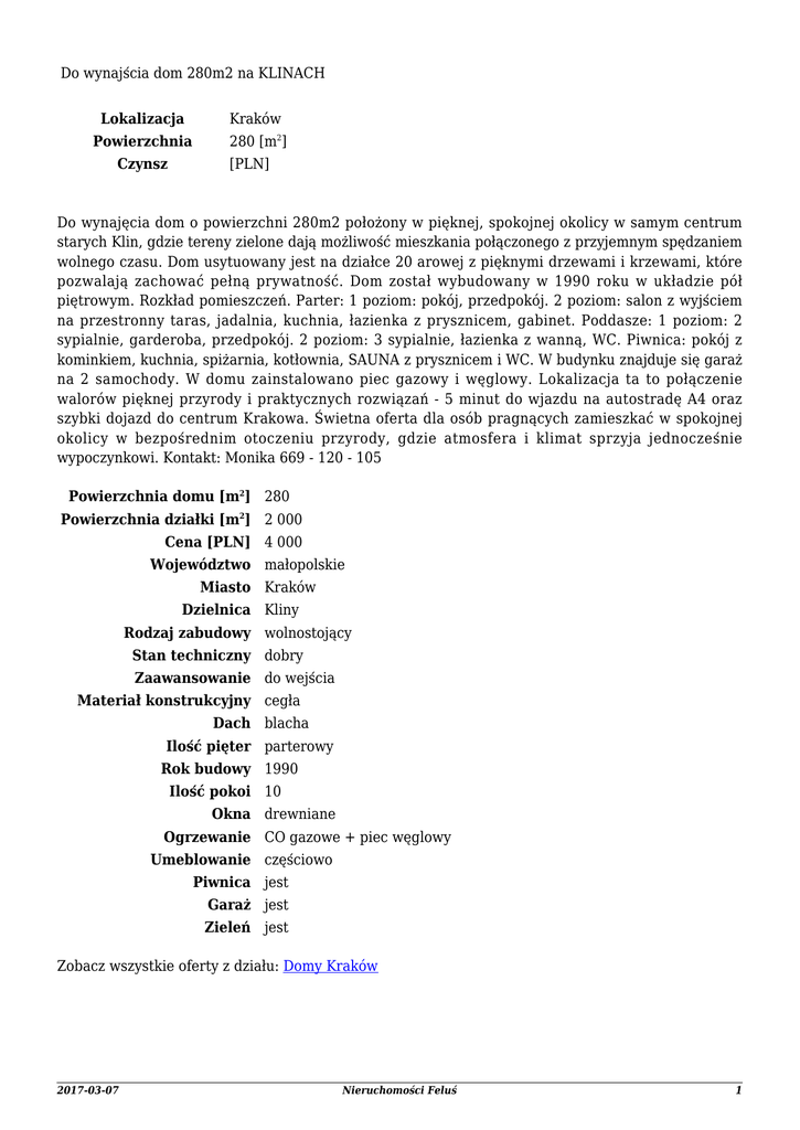 Do wynajścia dom 280m2 na KLINACH Lokalizacja Kraków Powierzchnia 280 [m2] Czynsz [PLN] Do wynajęcia dom o powierzchni 280m2 położony w pięknej, spokojnej okolicy w samym centrum starych Klin, gdzie tereny zielone dają możliwość mieszkania połączonego z przyjemnym spędzaniem wolnego czasu. Dom usytuowany jest na działce 20 arowej z pięknymi drzewami i krzewami, które pozwalają zachować pełną prywatność. Dom został wybudowany w 1990 roku w układzie pół piętrowym. Rozkład pomieszczeń. Parter: 1 poziom: pokój, przedpokój. 2 poziom: salon z wyjściem na przestronny taras, jadalnia, kuchnia, łazienka z prysznicem, gabinet. Poddasze: 1 poziom: 2 sypialnie, garderoba, przedpokój. 2 poziom: 3 sypialnie, łazienka z wanną, WC. Piwnica: pokój z kominkiem, kuchnia, spiżarnia, kotłownia, SAUNA z prysznicem i WC. W budynku znajduje się garaż na 2 samochody. W domu zainstalowano piec gazowy i węglowy. Lokalizacja ta to połączenie walorów pięknej przyrody i praktycznych rozwiązań - 5 minut do wjazdu na autostradę A4 oraz szybki dojazd do centrum Krakowa. Świetna oferta dla osób pragnących zamieszkać w spokojnej okolicy w bezpośrednim otoczeniu przyrody, gdzie atmosfera i klimat sprzyja jednocześnie wypoczynkowi. Kontakt: Monika 669 - 120 - 105 Powierzchnia domu [m2] 280 Powierzchnia działki [m2] 2 000 Cena [PLN] 4 000 Województwo małopolskie Miasto Kraków Dzielnica Kliny Rodzaj zabudowy wolnostojący Stan techniczny dobry Zaawansowanie do wejścia Materiał konstrukcyjny cegła Dach blacha Ilość pięter parterowy Rok budowy 1990 Ilość pokoi 10 Okna drewniane Ogrzewanie CO gazowe + piec węglowy Umeblowanie częściowo Piwnica jest Garaż jest Zieleń jest Zobacz wszystkie oferty z działu: Domy Kraków 2017-03-07 Nieruchomości Feluś 1