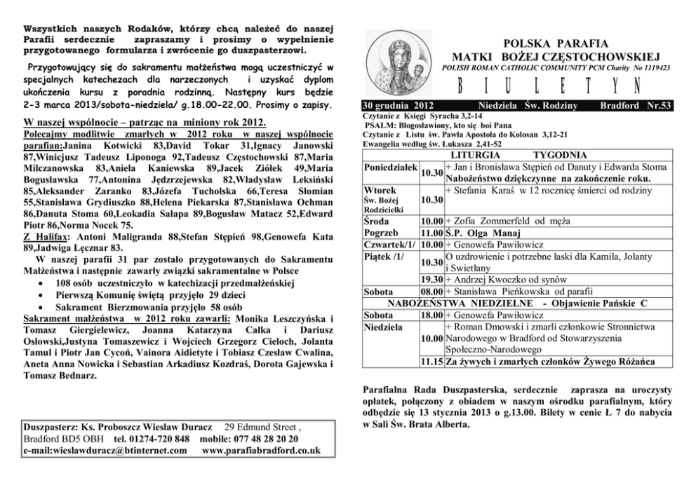 Wszystkich naszych Rodaków, którzy chc nale do naszej Parafii serdecznie zapraszamy i prosimy o wype nienie przygotowanego formularza i zwrócenie go duszpasterzowi. Przygotowuj cy si do sakramentu ma stwa mog uczestniczy w specjalnych katechezach dla narzeczonych i uzyska dyplom uko czenia kursu z poradnia rodzinn . Nast pny kurs b dzie 2-3 marca 2013/sobota-niedziela/ g.18.00-22.00. Prosimy o zapisy. W naszej wspólnocie – patrz c na miniony rok 2012. Polecajmy modlitwie zmar ych w 2012 roku w naszej wspólnocie parafian:Janina Kotwicki 83,David Tokar 31,Ignacy Janowski 87,Winicjusz Tadeusz Liponoga 92,Tadeusz Cz stochowski 87,Maria Milczanowska 83,Aniela Kaniewska 89,Jacek Zió ek 49,Maria Bogus awska 77,Antonina J dzrzejewska 82,W adys aw Leksi ski 85,Aleksander Zaranko 83,Józefa Tucholska 66,Teresa S omian 55,Stanis awa Grydiuszko 88,Helena Piekarska 87,Stanis awa Ochman 86,Danuta Stoma 60,Leokadia Sa apa 89,Bogus aw Matacz 52,Edward Piotr 86,Norma Nocek 75. Z Halifax: Antoni Maligranda 88,Stefan St pie 98,Genowefa Kata 89,Jadwiga L cznar 83. W naszej parafii 31 par zosta o przygotowanych do Sakramentu Ma stwa i nast pnie zawar y zwi zki sakramentalne w Polsce 108 osób uczestniczy o w katechizacji przedma skiej Pierwsz Komuni wi przyj o 29 dzieci Sakrament Bierzmowania przyj o 58 osób Sakrament ma stwa w 2012 roku zawarli: Monika Leszczy ska i Tomasz Giergielewicz, Joanna Katarzyna Ca ka i Dariusz Os owski,Justyna Tomaszewicz i Wojciech Grzegorz Cieloch, Jolanta Tamul i Piotr Jan Cyco , Vainora Aidietyte i Tobiasz Czes aw Cwalina, Aneta Anna Nowicka i Sebastian Arkadiusz Kozdra , Dorota Gajewska i Tomasz Bednarz. Duszpasterz: Ks. Proboszcz Wies aw Duracz 29 Edmund Street , Bradford BD5 OBH tel. 01274-720 848 mobile: 077 48 28 20 20 e-mail:[email protected] www.parafiabradford.co.uk POLSKA PARAFIA MATKI BO EJ CZ STOCHOWSKIEJ POLISH ROMAN CATHOLIC COMMUNITY PCM Charity No 1119423 B I U L E T YN 30 grudnia 2012 Niedziela w. Rodziny Bradford Nr.53 Czytanie z Ksi gi Syracha 3,2-14 PSALM: B ogos awiony, kto si boi Pana Czytanie z Listu w. Paw a Aposto a do Kolosan 3,12-21 Ewangelia wed ug w. ukasza 2,41-52 LITURGIA TYGODNIA + Jan i Bronis awa St pie od Danuty i Edwarda Stoma Poniedzia ek 10.30 Nabo stwo dzi kczynne na zako czenie roku. + Stefania Kara w 12 rocznic mierci od rodziny Wtorek 10.30 w. Bo ej Rodzicielki roda 10.00 + Zofia Zommerfeld od m a Pogrzeb 11.00 .P. Olga Manaj Czwartek/1/ 10.00 + Genowefa Pawi owicz O uzdrowienie i potrzebne aski dla Kamila, Jolanty Pi tek /1/ 10.30 i Swiet any 19.30 + Andrzej Kwoczko od synów Sobota 08.00 + Stanis awa Pie kowska od parafii NABO STWA NIEDZIELNE - Objawienie Pa skie C Sobota 18.00 + Genowefa Pawi owicz + Roman Dmowski i zmarli cz onkowie Stronnictwa Niedziela 10.00 Narodowego w Bradford od Stowarzyszenia Spo eczno-Narodowego 11.15 Za ywych i zmar ych cz onków ywego Ró ca Parafialna Rada Duszpasterska, serdecznie zaprasza na uroczysty op atek, po czony z obiadem w naszym o rodku parafialnym, który odb dzie si 13 stycznia 2013 o g.13.00. Bilety w cenie 7 do nabycia w Sali w. Brata Alberta. Lektorzy - Sobota 05.01.2013 g.18.00 - J. B k Niedziela 06.01.2013 g. 10.00 - E.Jagielski g. 11.15 – Ró aniec Dy ur przedstawiciela PRD Sali w. Brata Alberta, sobota i niedziela 05-06.01.2013- M.E. K czkowscy OFIARY Na potrzeby parafii – E.D. Albrycht £100; A. Zo ubak /dekoracje/ £20. Na kwiaty – £ Taca dla parafii – 23.12.2012 - £ 484.43 Gift Aid 11.11.2012 - £ 104. Je eli kto z Parafian pragnie z ofiar czekiem/na dowolny cel parafialny/, prosimy go wypisa na –P.C.M. BRADFORD PARISH. Wszystkim ofiarodawcom sk adamy serdeczne podzi kowanie za z one ofiary na nasze cele parafialne. Bóg zap . *** OG OSZENIA DUSZPASTERSKIE *** 1. Dzisiejsza, ostatnia niedziela ko cz cego si 2012 roku, jest wi tem wi tej Rodziny z Nazaretu: Jezusa, Maryi i Józefa. Jest to bardzo stosowny moment, aby baczniej spojrze na nasze rodziny. Wpatruj c si w ikon wi tej Rodziny, atwiej zrozumiemy nasze powo anie do ycia w rodzinie. Ona jest wzorem dla naszych rodzin. Pami tajmy, e zadaniem ka dego chrze cijanina jest przede wszystkim troska o w asne zbawienie. Dla wszystkich powo anych do ycia ma skiego i rodzinnego ta troska wyra a si poprzez dobre i przyk adne, godne ycie w rodzinie i poprzez rodzin . Pro my Boga, aby w tych nie atwych czasach, przy tylu zagro eniach i celowych atakach ró norakich wrogów nasze rodziny stawa y si prawdziwym domowym Ko cio em. Pami tajmy, e kochaj ce si i przyk adnie yj ce polskie rodziny maj by sol dla ziemi w doczesnej pielgrzymce wiary. Zawieraj c autentyczn przyja ze wi Rodzin , uczmy si sztuki budowania wi zi opartych na prawdziwej mi ci. 2. Zbli amy si do ko ca roku kalendarzowego 2012. Podobnie jak wszystkie ostatnie lata by brzemienny w wydarzenia na gruncie Ko cio a powszechnego i naszej lokalnej wspólnoty, w naszej Ojczy nie i w naszych rodzinach. Warto pochyli si nad rado ciami, sukcesami, ale tak e nad tymi najtrudniejszymi momentami i do wiadczeniami. Wydaje si bowiem, e poza chwilowymi odruchami jedno ci i solidarno ci ci gle nie potrafimy wyci ga w ciwych wniosków z kolejnych lekcji historii i z kolejnych dopustów Bo ych. 3. Jutro podczas specjalnego nabo stwa dzi kczynno-przeb agalnego w naszym ko ciele, które b dziemy celebrowali o godzinie 10.30, podzi kujemy Bogu – Dobremu Ojcu w Niebie za miniony czas, za dobro, którego my w tym czasie doznali. Przeprosimy za wszelkie b dy i odej cia od mi ci. B dziemy równie prosi o dalsze b ogos awie stwo dla nas, naszych rodzin i naszej Ojczyzny. W tym czasie warto zapyta siebie: jak wygl da moje ycie, jak wygl da moja relacja z Panem Bogiem, czy i na ile wype niam moje chrze cija skie zobowi zanie dawania wiadectwa wiary wobec bli nich? Za publiczne od piewanie hymnu „Ciebie, Boga, wys awiamy” podczas tego nabo stwa b dzie mo na uzyska odpust zupe ny. 4. W nadchodz cym tygodniu przypada pierwszy czwartek miesi ca – dzie , w którym adorujemy Naj wi 