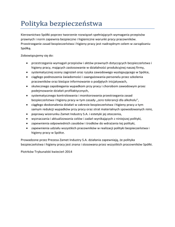 Polityka bezpieczeństwa Kierownictwo Spółki poprzez tworzenie rozwiązań spełniających wymagania przepisów prawnych i norm zapewnia bezpieczne i higieniczne warunki pracy pracowników. Przestrzeganie zasad bezpieczeństwa i higieny pracy jest nadrzędnym celem w zarządzaniu Spółką. Zobowiązujemy się do: przestrzegania wymagań przepisów i aktów prawnych dotyczących bezpieczeństwa i higieny pracy, mających zastosowanie w działalności produkcyjnej naszej firmy, systematycznej oceny zagrożeń oraz ryzyka zawodowego występującego w Spółce, ciągłego podnoszenia świadomości i zaangażowania personelu przez szkolenia pracowników oraz bieżące informowanie o podjętych inicjatywach, skutecznego zapobiegania wypadkom przy pracy i chorobom zawodowym przez podejmowanie działań profilaktycznych, systematycznego kontrolowania i monitorowania przestrzegania zasad bezpieczeństwa i higieny pracy w tym zasady „zero tolerancji dla alkoholu”, ciągłego doskonalenia działań w zakresie bezpieczeństwa i higieny pracy a tym samym redukcji wypadków przy pracy oraz strat materialnych spowodowanych nimi, poprawy wizerunku Zamet Industry S.A. i estetyki jej otoczenia, wyznaczania i aktualizowania celów i zadań wynikających z niniejszej polityki, zapewnienia odpowiednich zasobów i środków do wdrażania tej polityki, zapewnienia udziału wszystkich pracowników w realizacji polityki bezpieczeństwa i higieny pracy w Spółce. Prowadzone przez Prezesa Zamet Industry S.A. działania zapewniają, że polityka bezpieczeństwa i higieny pracy jest znana i stosowana przez wszystkich pracowników Spółki. Piotrków Trybunalski kwiecień 2014
