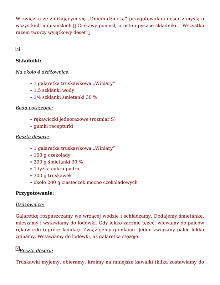 W związku ze zbliżającym się „Dniem dziecka” przygotowałam deser z myślą o wszystkich milusińskich Ciekawy pomysł, proste i pyszne składniki… Wszystko razem tworzy wyjątkowy deser Składniki: Na około 4 dżdżownice: 1 galaretka truskawkowa „Winiary” 1,5 szklanki wody 1/4 szklanki śmietanki 30 % Będą potrzebne: rękawiczki jednorazowe (rozmiar S) gumki recepturki Reszta deseru: 1 galaretka truskawkowa „Winiary” 100 g czekolady 200 g śmietanki 30 % 1 łyżka cukru pudru 300 g truskawek około 200 g ciasteczek mocno czekoladowych Przygotowanie: Dżdżownice: Galaretkę rozpuszczamy we wrzącej wodzie i schładzamy. Dodajemy śmietankę, mieszamy i wstawiamy do lodówki. Gdy lekko zacznie tężeć, wlewamy do palców rękawiczki (oprócz kciuka). Związujemy gumkami. Jeden związany palec lekko zginamy. Wstawiamy do lodówki, aż galaretka stężeje. Reszta deseru: Truskawki myjemy, obieramy, kroimy na mniejsze kawałki (kilka zostawiamy do dekoracji) i przekładamy do salaterek. Galaretkę robimy według przepisu na opakowaniu i zalewamy nią truskawki. Wstawiamy do lodówki, aż galaretka stężeje. Śmietankę ubijamy z cukrem pudrem i rozsmarowujemy ją na galaretce. Wierzch posypujemy startymi na drobnych oczkach, ciasteczkami. Rękawiczki nacinamy i delikatnie wyjmujemy zawartość. Na jednym galaretkowym palcu nacinamy buzię i wtykamy w nią starte ciasteczka. Z czekolady robimy oczka. W deserze robimy nacięcia i wpychamy w nie poszczególne części dżdżownicy. Roztopioną czekoladą rysujemy na folii aluminiowej płotek. Schładzamy go, delikatnie odrywamy i ustawiamy w deserze. Całość dekorujemy truskawkami. Smacznego Dlaczego udawany ? Bo wygląda jak prawdziwy naleśnik, a zrobiony jest z galaretki Wszyscy domownicy się nabrali i bardzo im smakowało, więc mój eksperyment mogę uznać za udany. Polecam go szczególnie na zbliżający się „Dzień dziecka”, na pewno dzieci będą zaskoczone i zadowolone z takiego deseru. Składniki: Z podanego przepisu wyjdzie 5-6 naleśników. 1 galaretka truskawkowa „Winiary” 1 galaretka cytrynowa „Winiary” 300 g truskawek 250 ml śmietanki 30% 500 ml mleka 250 g serka mascarpone 1 łyżka cukru pudru 1/2 tabliczki mlecznej czekolady Przygotowanie: 1. Pół galaretki truskawkowej rozpuszczamy w 1 szklance wrzącej wody, przelewamy do salaterki lub głębokiego talerza i schładzamy. 2. Do garnuszka wlewamy śmietankę, mleko i zagotowujemy. Wyłączamy gaz, wsypujemy całą galaretkę cytrynową i pół galaretki truskawkowej. Energicznie mieszamy, aż żelatyna się rozpuści. Studzimy. Rozkładamy na stole folie spożywczą i wylewamy małymi porcjami (tężejącą !) galaretkę, tworząc naleśniki. Nie ruszamy ich! Dopiero gdy trochę stężeją, wkładamy do lodówki. 3. 4. 5. 6. Serek mascarpone mieszamy z cukrem pudrem. Truskawki myjemy, obieramy i kroimy na ćwiartki. Galaretkę truskawkową kroimy w kostkę. Udawane naleśniki wyjmujemy z lodówki. Na każdego z nich kładziemy serek mascarpone, pokrojoną galaretkę i truskawki. Delikatnie zwijamy, powoli odrywając folię. 7. Roztapiamy czekoladę i polewamy naleśniczki. Dekorujemy truskawkami, posypujemy cukrem pudrem. Smacznego Efektowna filiżanka z białej czekolady wypełniona pysznym musem truskawkowym… Tak podany deser na pewno zachwyci gości Składniki: Filiżanki (4 szt.): 3 tabliczki białej czekolady (lub gotowej polewy czekoladowej) czerwony barwnik spożywczy foremki silikonowe (opcjonalnie po serkach, jogurtach) Mus truskawkowy: 1 galaretka truskawkowa „Winiary” 400 g truskawek 125 ml śmietanki 30% Przygotowanie: Filiżanki: Trzy połamane tabliczki czekolady rozpuszczamy w kąpieli wodnej (tzn. czekoladę umieszczamy w miseczce nad parą wodną). Zdejmujemy miseczkę. Pozostałą czekoladę drobniutko siekamy lub ścieramy na tarce i wsypujemy do rozpuszczonej, ciepłej czekolady. Dodajemy barwnik spożywczy i wszystko mieszamy, aż składniki się połączą. Ochładzamy w ten sposób ciepłą czekoladę, dzięki temu będzie trwalsza i bardziej błyszcząca. Jeżeli czekolada ostygnie, należy ją ponownie delikatnie podgrzać (Nie przegrzać!). Lekko tężejącą czekoladą smarujemy wewnątrz foremki silikonowe (warstwa ma mieć około 3 mm) i schładzamy. Jeżeli czekoladowe ścianki są za cienkie, czynność należy powtórzyć. 4 truskawki maczamy w czekoladzie, posypujemy cukrowymi koralikami i schładzamy. Resztę czekolady przekładamy do małego foliowego woreczka, obcinamy narożnik, rysujemy uchwyty filiżanek i ozdoby na folii aluminiowej. Schładzamy. Rada: Jeśli nie posiadacie silikonowych foremek, możecie użyć plastikowych po serkach lub jogurtach, z tym że najpierw trzeba je oblać wewnątrz cienką warstwą tężejącej żelatyny i schłodzić. Dopiero wówczas można wysmarować je czekoladą (nie ciepłą, bo żelatyna się rozpuści) i wstawić do lodówki. Przygotowane w ten sposób filiżanki, zanurzamy na chwilę w bardzo ciepłej wodzie. Żelatyna się rozpuści, będzie można je wyciągnąć i delikatnie wytrzeć chusteczką. Sposób ten jest bardziej czasochłonny i filiżanki nie wychodzą idealne, ale da się je wyrównać nożykiem Mus truskawkowy: Do rondelka wlewamy śmietankę i doprowadzamy do wrzenia. Zdejmujemy z ognia, wsypujemy galaretkę i energicznie mieszamy, aż się rozpuści. Schładzamy. Umyte i obrane truskawki miksujemy (4 zostawiamy do dekoracji). Dodajemy do nich galaretkę i wszystko mieszamy. Przelewamy do czekoladowych filiżanek i wstawiamy do lodówki, do czasu, aż mus stężeje. Gotowe filiżanki wyjmujemy z foremek i odrobiną czekolady doklejamy uchwyty. Ponownie wstawiamy na chwilę do lodówki. Wyjmujemy, przekładamy na talerzyki i dekorujemy truskawkami i czekoladowymi wzorkami. Smacznego Dzisiaj domowe ruskie pierogi, o niebo lepsze od kupnych… Jeśli znajdziecie trochę czasu, naprawdę warto je zrobić. Składniki: Z podanego przepisu 