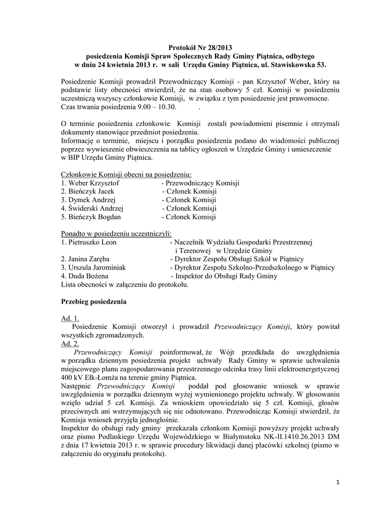 Protokół Nr 28/2013 posiedzenia Komisji Spraw Społecznych Rady Gminy Piątnica, odbytego w dniu 24 kwietnia 2013 r. w sali Urzędu Gminy Piątnica, ul. Stawiskowska 53. Posiedzenie Komisji prowadził Przewodniczący Komisji - pan Krzysztof Weber, który na podstawie listy obecności stwierdził, że na stan osobowy 5 czł. Komisji w posiedzeniu uczestniczą wszyscy członkowie Komisji, w związku z tym posiedzenie jest prawomocne. Czas trwania posiedzenia 9.00 – 10.30. . O terminie posiedzenia członkowie Komisji zostali powiadomieni pisemnie i otrzymali dokumenty stanowiące przedmiot posiedzenia. Informację o terminie, miejscu i porządku posiedzenia podano do wiadomości publicznej poprzez wywieszenie obwieszczenia na tablicy ogłoszeń w Urzędzie Gminy i umieszczenie w BIP Urzędu Gminy Piątnica. Członkowie Komisji obecni na posiedzeniu: 1. Weber Krzysztof - Przewodniczący Komisji 2. Bieńczyk Jacek - Członek Komisji 3. Dymek Andrzej - Członek Komisji 4. Świderski Andrzej - Członek Komisji 5. Bieńczyk Bogdan - Członek Komisji Ponadto w posiedzeniu uczestniczyli: 1. Pietruszko Leon - Naczelnik Wydziału Gospodarki Przestrzennej i Terenowej w Urzędzie Gminy 2. Janina Zaręba - Dyrektor Zespołu Obsługi Szkół w Piątnicy 3. Urszula Jarominiak - Dyrektor Zespołu Szkolno-Przedszkolnego w Piątnicy 4. Duda Bożena - Inspektor do Obsługi Rady Gminy Lista obecności w załączeniu do protokołu. Przebieg posiedzenia Ad. 1. Posiedzenie Komisji otworzył i prowadził Przewodniczący Komisji, który powitał wszystkich zgromadzonych. Ad. 2. Przewodniczący Komisji poinformował, że Wójt przedkłada do uwzględnienia w porządku dziennym posiedzenia projekt uchwały Rady Gminy w sprawie uchwalenia miejscowego planu zagospodarowania przestrzennego odcinka trasy linii elektroenergetycznej 400 kV Ełk-Łomża na terenie gminy Piątnica. Następnie Przewodniczący Komisji poddał pod głosowanie wniosek w sprawie uwzględnienia w porządku dziennym wyżej wymienionego projektu uchwały. W głosowaniu wzięło udział 5 czł. Komisji. Za wnioskiem opowiedziało się 5 czł. Komisji, głosów przeciwnych ani wstrzymujących się nie odnotowano. Przewodnicząc Komisji stwierdził, że Komisja wniosek przyjęła jednogłośnie. Inspektor do obsługi rady gminy przekazała członkom Komisji powyższy projekt uchwały oraz pismo Podlaskiego Urzędu Wojewódzkiego w Białymstoku NK-II.1410.26.2013 DM z dnia 17 kwietnia 2013 r. w sprawie procedury likwidacji danej placówki szkolnej (pismo w załączeniu do oryginału protokołu). 1 Czł. Komisji Jacek Bieńczyk stwierdził, że drogą pantoflową dotarła do niego informacja, że obecna tutaj p. dyrektor Jarominiak zdejmuje krzyże w szkole. Ludzie przychodzili do mnie i pytali co się dzieje, bo ksiądz coś mówił, ale ja nic nie wiem. Dopiero jak wyszli przed kościół, to niektórzy wiedzieli, że dyrektor zdejmuje krzyże. W związku z tym – jako radny udałem się do Zespołu Szkolno-Przedszkolnego i chciałem się zapytać jak to wygląda u źródła. Byłe na I piętrze w Przedszkolu, gdzie zaprowadziła mnie p. dyrektor i nie wiem, czy wszędzie ale krzyże wiszą. Z krzyżami jest tak, jeżeli społeczność danej klasy chce powiesić, to wiesza, ale nie ma obowiązku wieszania. Chodzi teraz tylko wyłącznie o to, czy dyrekcja zdejmowała krzyże, czy nie. Dlatego był mój wniosek by poprosić na dzisiejsze posiedzenie p. dyrektor, by wszystkim wyjaśniła i na pewno będę wnioskował do przewodniczącego Rady, aby to oświadczenie trafiło pod obrady sesji Rady. Na wniosek Przewodniczącego Komisji, Komisja postanowiła jednogłośnie uwzględnić w porządku posiedzenia w pkt 3. Złożenie oświadczenia przez Dyrektora Zespołu SzkolnoPrzedszkolnego w Piątnicy. Następnie Przewodniczący Komisji przedstawił porządek dzienny posiedzenia o poniższej treści: 1. Otwarcie posiedzenia. 2. Przyjęcie porządku dziennego posiedzenia. 3. Złożenie oświadczenia przez Dyrektora Zespołu Szkolno-Przedszkolnego w Piątnicy. 4. Rozpatrzenie na sesję Rady Gminy projektów uchwał w sprawie: 1/ likwidacji Szkoły Podstawowej w Żelechach; 2/ przystąpienia do sporządzenia zmiany Studium uwarunkowań i kierunków zagospodarowania przestrzennego gminy Piątnica; 3/ uchwalenia miejscowego planu zagospodarowania przestrzennego odcinka trasy linii elektroenergetycznej 400 k Ełk-Łomża na terenie gminy Piątnica. 5. Wolne wnioski. Ad. 3. W tym punkcie głos zabrali: Dyrektor Zespołu Obsługi Szkół w Piątnicy stwierdziła, że jest zaskoczona, pomimo że do niej dotarły takie informacje. Nigdy żadnej akcji zdejmowania krzyży w szkole nie było, a przeciwnie ja sama byłam inicjatorką wieszania symboli religijnych i nigdy akcji wieszania ani zdejmowania nie było. Zastanawiałam się skąd się coś takiego mogło wziąć i doszłam do wniosku, że być może tę sprawę wywołały moje słowa na radzie pedagogicznej, które wydaje mi się, że były zrozumiałe. Dla osoby, która chce inaczej to zrozumieć, może też. Na potwierdzenie tego, że nigdy takiej akcji nie było, do sekretariatu szkoły wpłynęło oświadczenie od wszystkich nauczycieli szkoły. Następnie odczytała oświadczenie w tej sprawie z dnia 22 kwietnia 2013 r. (oświadczenie w załączeniu do oryginału protokołu). We wszystkich remontowanych przeze mnie salach wiszą modlitwy – aniele stróżu …, które kiedyś konsultowałam z proboszczem, czy one mają charakter religijny? Ksiądz powiedział – absolutnie w młodszych klasach. Także inicjatorką wieszania tych modlitw byłam ja. Zrobiło to wszystko na mnie duże wrażenie i sama nie wiem z czego muszę się tłumaczyć. Czł. Komisji Jacek Bieńczyk wnioskował o przekazanie oświadczenia Przewodniczącemu Rady, celem odczytania na najbliższej sesji Rady Gminy. Następnie stwierdził, że swego czasu współpracował z p. Jaromiak i nigdy nie było takiej sytuacji żeby ktoś zdejm