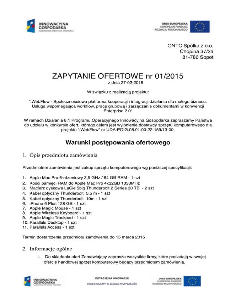ONTC Spółka z o.o. Chopina 37/2a 81-786 Sopot ZAPYTANIE OFERTOWE nr 01/2015 z dnia 27-02-2015 W związku z realizacją projektu: "iWebFlow - Społecznościowa platforma kooperacji i integracji działania dla małego biznesu. Usługa wspomagająca workflow, pracę grupową i zarządzanie dokumentami w konwencji Enterprise 2.0" W ramach Działania 8.1 Programu Operacyjnego Innowacyjna Gospodarka zapraszamy Państwa do udziału w konkursie ofert, którego celem jest wyłonienie dostawcy sprzętu komputerowego dla projektu "iWebFlow" nr UDA-POIG.08.01.00-22-159/13-00. Warunki postępowania ofertowego 1. Opis przedmiotu zamówienia Przedmiotem zamówienia jest zakup sprzętu komputerowego wg poniższej specyfikacji: 1. Apple Mac Pro 6-rdzeniowy 3,5 GHz / 64 GB RAM - 1 szt 2. Kości pamięci RAM do Apple Mac Pro 4x32GB 1333MHz 3. Macierz dyskowa LaCie 5big Thunderbolt 2 Series 30 TB - 2 szt 4. Kabel optyczny Thunderbolt 5,5 m - 1 szt 5. Kabel optyczny Thunderbolt 10m - 1 szt 6. iPhone 6 Plus 128 GB - 1 szt 7. Apple Magic Mouse - 1 szt 8. Apple Wireless Keyboard - 1 szt 9. Apple Magic Trackpad - 1 szt 10. Parallels Desktop - 1 szt 11. Parallels Access - 1 szt Termin dostarczenia przedmiotu zamówienia do 15 marca 2015 2. Informacje ogólne 1. Do składania ofert Zamawiający zaprasza wszystkie firmy, które posiadają w swojej ofercie handlowej sprzęt komputerowy będący przedmiotem zamówienia. Niniejsze postępowanie nie podlega przepisom ustawy z dnia 29 stycznia 2004 r. – Prawo zamówień publicznych. 3. Zleceniodawca nie dopuszcza możliwości składania ofert częściowych. 4. Zleceniodawca nie dopuszcza możliwości składania ofert wariantowych. 2. 3. Kryteria wyboru dostawcy Przy wyborze najkorzystniejszej oferty wzięte zostaną pod uwagę następujące kryteria • cena 100% W wyniku porównania otrzymanych ofert cenowych zostanie wybrany ostateczny dostawca. 4. Oczekiwania wobec przedstawionych ofert Oferta powinna zawierać: • nazwę i adres oferenta, • cenę netto wykonania usługi • termin ważności oferty 5. Przygotowanie, ważność i termin składania ofert Oferty należy przygotować w języku polskim. Wszystkie ceny należy podawać jako wartości netto oraz brutto. Ceny powinny być wyrażone w PLN. W celu uzyskania szczegółowych, dodatkowych informacji dotyczących zapytania ofertowego i przedmiotu zamówienia prosimy o kontakt z Panem Piotrem Struzik tel 602 23 84 12, e-mail [email protected]. Ostateczny termin składania ofert - 6 marzec 2015 Odpowiedzi na zapytanie ofertowe należy składać na adres: W formie papierowej: ONTC spółka z o.o. Chopina 37/2a 81-786 Sopot W formie elektronicznej: [email protected]