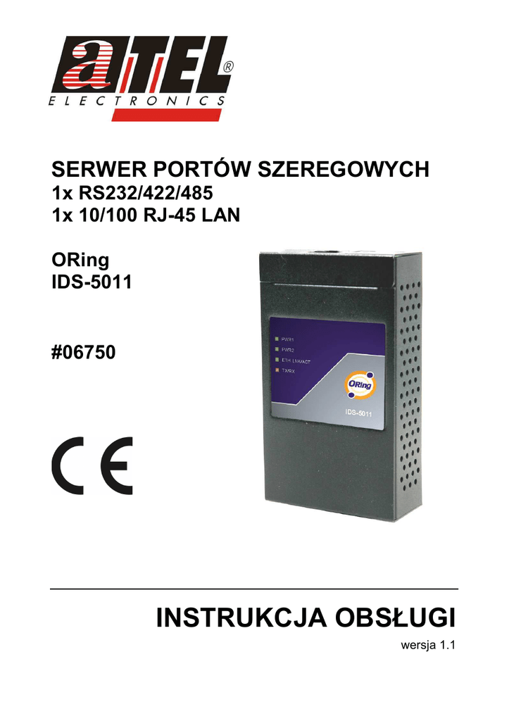 hgjfdsl SERWER PORTÓW SZEREGOWYCH 1x RS232/422/485 1x 10/100 RJ-45 LAN ORing IDS-5011 #06750 INSTRUKCJA OBSŁUGI wersja 1.1 IDS-5011 Spis treści Wstęp ...................................................................................................................................... 3 Właściwości ............................................................................................................................. 3 Bezpieczeństwo uŜytkowania .................................................................................................. 3 1. Zawartość opakowania ........................................................................................................ 4 2. Zasady bezpieczeństwa ...................................................................................................... 4 3. Budowa urządzenia ............................................................................................................. 5 3.1 Panel przedni ................................................................................................................. 5 3.2 Diody LED panelu przedniego ........................................................................................ 5 3.3 Panel górny .................................................................................................................... 6 3.4 Panel dolny .................................................................................................................... 6 3.5 Panel tylny ..................................................................................................................... 7 4. Instalacja ............................................................................................................................ 7 4.1 MontaŜ na szynie DIN .................................................................................................... 7 4.2 MontaŜ ścienny .............................................................................................................. 8 4.3 Instalacja okablowania ................................................................................................... 8 5. Konfiguracja i zarządzanie urządzeniem .............................................................................. 8 5.1 Konfiguracja ................................................................................................................... 8 5.2 Aplikacja DS-Tool........................................................................................................... 8 5.2 Zarządzanie z poziomu przeglądarki internetowej ........................................................ 10 5.3 Zarządzanie z poziomu konsoli .................................................................................... 11 6. Składowanie zuŜytego sprzętu........................................................................................... 11 7. Parametry techniczne ........................................................................................................ 11 2 IDS-5011 Wstęp Urządzenie IDS-5011 to nowoczesny, redundantny serwer wyposaŜony 1 port szeregowy RS232/422/485 i 1 port LAN 10/100M. By ułatwić uŜytkownikowi sprawną transmisję i dbać jej bezpieczeństwo w serwerach IDS-5011 wbudowano funkcje redundantne. W razie zerwania połączenia, serwer umoŜliwia automatyczne przełączenie do innego portu LAN w czasie mniejszym niŜ 10 ms, co gwarantuje ciągłość transmisji. Urządzenie zapewnia redundantne wejścia zasilania, a takŜe moŜliwość uŜycia go jako węzła NAT. Zarządzanie serwerem ułatwia aplikacja DS-Tool. Właściwości • • • • • • redundantne, dualne porty Ethernet: czas regeneracji < 10 ms; zarządzanie chronione dzięki protokołom HTTPS i SSH; zawiadamianie o zdarzeniach przez Sysloga, Email, pułapki SNMP i pager; tłumaczenie adresów sieciowych NAT; uniwersalne tryby: Virtual Com, Serial Tunnel, TCP Server, TCP Client, UDP; kompatybilność z róŜnymi systemami operacyjnymi Windows: NT/2000/XP/2003/VISTA. Bezpieczeństwo uŜytkowania Urządzenie zostało zaprojektowane i wyprodukowane z najwyŜszą starannością o bezpieczeństwo osób instalujących i uŜytkujących. Dla zapewnienia bezpieczeństwa pracy, naleŜy stosować się do wszelkich wskazań zawartych w tej instrukcji jak i instrukcjach obsługi urządzeń towarzyszących (np. komputera PC). Przed przystąpieniem do instalacji urządzenia naleŜy dokładnie przeczytać całość tej instrukcji, w szczególności zaś punkty poświęcone bezpieczeństwu. NaleŜy zapewnić bezpieczne warunki pracy urządzenia (np. uŜywać tylko ekranowanych przewodów do połączenia z komputerem lub innym urządzeniem peryferyjnym). Dokonanie przez uŜytkownika jakichkolwiek własnych zmian w urządzeniu moŜe spowodować utratę moŜliwości jego legalnego uŜytkowania. Urządzenie zostało poddane obowiązkowej ocenie zgodności i spełnienia zasadnicze wymagania zawarte w europejskich Dyrektywach Nowego Podejścia. Produkt jest oznakowany znakiem CE. 3 IDS-5011 1. Zawartość opakowania • • • • • • serwer portów szeregowych IDS-5011, zestaw do montaŜu, zaślepka na porty RJ-45, 3 pinowe złącze terminal block, skrócona instrukcja obsługi w języku angielskim, niniejsza instrukcja obsługi. 2. Zasady bezpieczeństwa Urządzenie jest zgodne z przepisami w zakresie bezpieczeństwa uŜytkowania urządzeń elektrycznych. NaleŜy przestrzegać następujących zaleceń: • gniazdo sieciowe musi być uziemione zgodnie z obowiązującymi przepisami; • przed przeniesieniem lub wykonywaniem innych operacji technicznych urządzenie naleŜy odłączyć od zasilania; • nie stosować uszkodzonych lub zuŜytych przewodów zasilania, gdyŜ powodują one znaczne zagroŜenie dla bezpieczeństwa uŜytkownika; • prace instalacyjne muszą być wykonywane przez odpowiednio przeszkolony personel techniczny; • nie stosować urządzenia w miejscach występow