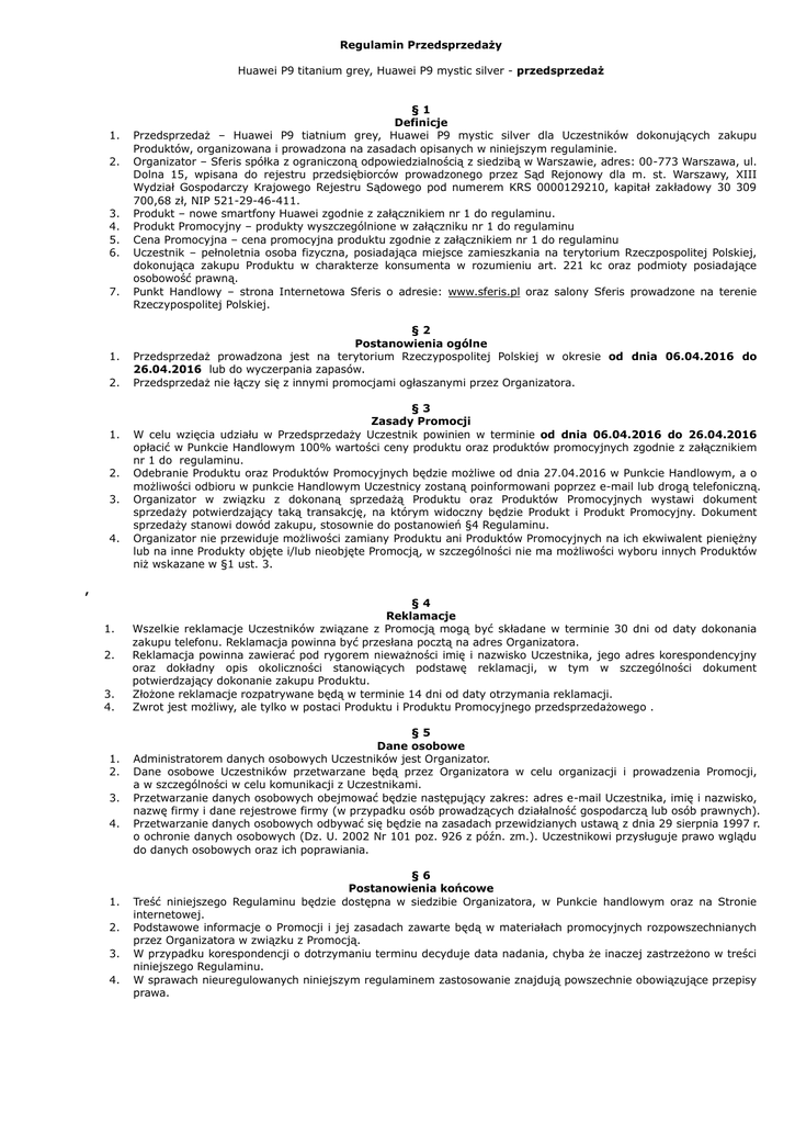 Regulamin Przedsprzedaży Huawei P9 titanium grey, Huawei P9 mystic silver - przedsprzedaż 1. 2. 3. 4. 5. 6. 7. 1. 2. 1. 2. 3. 4. , 1. 2. 3. 4. 1. 2. 3. 4. 1. 2. 3. 4. §1 Definicje Przedsprzedaż – Huawei P9 tiatnium grey, Huawei P9 mystic silver dla Uczestników dokonujących zakupu Produktów, organizowana i prowadzona na zasadach opisanych w niniejszym regulaminie. Organizator – Sferis spółka z ograniczoną odpowiedzialnością z siedzibą w Warszawie, adres: 00-773 Warszawa, ul. Dolna 15, wpisana do rejestru przedsiębiorców prowadzonego przez Sąd Rejonowy dla m. st. Warszawy, XIII Wydział Gospodarczy Krajowego Rejestru Sądowego pod numerem KRS 0000129210, kapitał zakładowy 30 309 700,68 zł, NIP 521-29-46-411. Produkt – nowe smartfony Huawei zgodnie z załącznikiem nr 1 do regulaminu. Produkt Promocyjny – produkty wyszczególnione w załączniku nr 1 do regulaminu Cena Promocyjna – cena promocyjna produktu zgodnie z załącznikiem nr 1 do regulaminu Uczestnik – pełnoletnia osoba fizyczna, posiadająca miejsce zamieszkania na terytorium Rzeczpospolitej Polskiej, dokonująca zakupu Produktu w charakterze konsumenta w rozumieniu art. 221 kc oraz podmioty posiadające osobowość prawną. Punkt Handlowy – strona Internetowa Sferis o adresie: www.sferis.pl oraz salony Sferis prowadzone na terenie Rzeczypospolitej Polskiej. §2 Postanowienia ogólne Przedsprzedaż prowadzona jest na terytorium Rzeczypospolitej Polskiej w okresie od dnia 06.04.2016 do 26.04.2016 lub do wyczerpania zapasów. Przedsprzedaż nie łączy się z innymi promocjami ogłaszanymi przez Organizatora. §3 Zasady Promocji W celu wzięcia udziału w Przedsprzedaży Uczestnik powinien w terminie od dnia 06.04.2016 do 26.04.2016 opłacić w Punkcie Handlowym 100% wartości ceny produktu oraz produktów promocyjnych zgodnie z załącznikiem nr 1 do regulaminu. Odebranie Produktu oraz Produktów Promocyjnych będzie możliwe od dnia 27.04.2016 w Punkcie Handlowym, a o możliwości odbioru w punkcie Handlowym Uczestnicy zostaną poinformowani poprzez e-mail lub drogą telefoniczną. Organizator w związku z dokonaną sprzedażą Produktu oraz Produktów Promocyjnych wystawi dokument sprzedaży potwierdzający taką transakcję, na którym widoczny będzie Produkt i Produkt Promocyjny. Dokument sprzedaży stanowi dowód zakupu, stosownie do postanowień §4 Regulaminu. Organizator nie przewiduje możliwości zamiany Produktu ani Produktów Promocyjnych na ich ekwiwalent pieniężny lub na inne Produkty objęte i/lub nieobjęte Promocją, w szczególności nie ma możliwości wyboru innych Produktów niż wskazane w §1 ust. 3. §4 Reklamacje Wszelkie reklamacje Uczestników związane z Promocją mogą być składane w terminie 30 dni od daty dokonania zakupu telefonu. Reklamacja powinna być przesłana pocztą na adres Organizatora. Reklamacja powinna zawierać pod rygorem nieważności imię i nazwisko Uczestnika, jego adres korespondencyjny oraz dokładny opis okoliczności stanowiących podstawę reklamacji, w tym w szczególności dokument potwierdzający dokonanie zakupu Produktu. Złożone reklamacje rozpatrywane będą w terminie 14 dni od daty otrzymania reklamacji. Zwrot jest możliwy, ale tylko w postaci Produktu i Produktu Promocyjnego przedsprzedażowego . §5 Dane osobowe Administratorem danych osobowych Uczestników jest Organizator. Dane osobowe Uczestników przetwarzane będą przez Organizatora w celu organizacji i prowadzenia Promocji, a w szczególności w celu komunikacji z Uczestnikami. Przetwarzanie danych osobowych obejmować będzie następujący zakres: adres e-mail Uczestnika, imię i nazwisko, nazwę firmy i dane rejestrowe firmy (w przypadku osób prowadzących działalność gospodarczą lub osób prawnych). Przetwarzanie danych osobowych odbywać się będzie na zasadach przewidzianych ustawą z dnia 29 sierpnia 1997 r. o ochronie danych osobowych (Dz. U. 2002 Nr 101 poz. 926 z późn. zm.). Uczestnikowi przysługuje prawo wglądu do danych osobowych oraz ich poprawiania. §6 Postanowienia końcowe Treść niniejszego Regulaminu będzie dostępna w siedzibie Organizatora, w Punkcie handlowym oraz na Stronie internetowej. Podstawowe informacje o Promocji i jej zasadach zawarte będą w materiałach promocyjnych rozpowszechnianych przez Organizatora w związku z Promocją. W przypadku korespondencji o dotrzymaniu terminu decyduje data nadania, chyba że inaczej zastrzeżono w treści niniejszego Regulaminu. W sprawach nieuregulowanych niniejszym regulaminem zastosowanie znajdują powszechnie obowiązujące przepisy prawa. ZAŁĄCZNIK NR 1 DO REGULAMINU SMARTFON INDEX DAX CENA BRUTTO 001HUAW000369 Smartfon Huawei P9 Titanium Grey 2399,00 PLN 001HUAW000374 Smartfon Huawei P9 Mystic Silver SMARTFON 2399,00 PLN INDEX DAX CENA BRUTTO Smartfon Huawei P9 Titanium Grey 001HUAW000408 2399,00 Smartfon Huawei P9 Mystic Silver 001HUAW000407 2399,00 PRODUKTY PROMOCYJNE INDEX DAX Smartwatch Huawei Watch srebrny + pasek skórzany czarny (PPS) 001HUAW000412 CENA BRUTTO 800,00