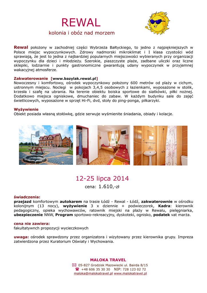 REWAL kolonia i obóz nad morzem Rewal położony w zachodniej części Wybrzeża Bałtyckiego, to jedno z najpiękniejszych w Polsce miejsc wypoczynkowych. Zdrowy nadmorski mikroklimat i I klasa czystości wód sprawiają, że jest to jedna z najbardziej popularnych miejscowości wybieranych przy organizacji wypoczynku dla dzieci i młodzieży. Szerokie, piaszczyste plaże, zadbane uliczki oraz liczne sklepiki, lodziarnie i punkty gastronomiczne gwarantują udany wypoczynek w przyjemnej wakacyjnej atmosferze. Zakwaterowanie [www.bazylak.rewal.pl] Nowoczesny i komfortowy, ośrodek wypoczynkowy położony 600 metrów od plaży w cichym, ustronnym miejscu. Noclegi w pokojach 3,4,5 osobowych z łazienkami, wyposażone w stolik, krzesła i szafę na ubrania. Na terenie obiektu boiska sportowe do siatkówki, piłki nożnej. Dodatkowo miejsca ogniskowe, dmuchaniec do zabaw. W każdym budynku sale do zajęć świetlicowych, wyposażone w sprzęt Hi-Fi, dvd, stoły do ping-ponga, piłkarzyki. Wyżywienie Obiekt posiada własną stołówkę, gdzie serwuje wyśmienite śniadania, obiady i kolacje. 12-25 lipca 2014 cena: 1.610,-zł świadczenia: przejazd komfortowym autokarem na trasie Łódź - Rewal - Łódź, zakwaterownie w ośrodku kolonijnym (13 nocy), wyżywienie 3 x dziennie + podwieczorek, Kadra: kierownik pedagogiczny, opieka wychowawców, ratownik miejski na plaży w Rewalu, pielęgniarka, ubezpieczenie NNW, Program sportowo-rekreacyjny, dyskoteki, ognisko, podatek vat marża. cena nie zawiera: fakultatywnch propozycji wycieczkowych uwaga: ośrodek sprawdzony przez organizatora i wizytowany przez kierownika grupy. Impreza zatwierdzona przez Kuratorium Oświaty i Wychowania. MALOKA TRAVEL 05-827 Grodzisk Mazowiecki ul. Bairda 8/15 +48 606 35 30 30 NIP: 728 123 02 72 [email protected] www.malokatravel.pl PROGRAM POBYTU 1 dzień zbiórka w Łodzi. Przejazd do Rewala w/g ustalonej trasy przejazdu, zakwaterowanie w pokojach. Spotkanie organizacyjne: podział na grupy, przedstawienie wychowawców. Pierwszym świadczeniem jest obiadokolacja w dniu przyjazdu 2–13 dzień każdego dnia posiłki: śniadanie, obiad + podwieczorek, kolacja w trakcie wycieczki całodziennej (śniadanie + suchy prowiant, obiadokolacja ) • • • • • • • • • • • • • • • • plażowanie i kąpiele w morzu pod opieką ratownika miejskiego gry terenowe "rzeżby na piasku" plażowe zabawy zespołowe olimpiada sportowa na wesoło, czyli konkurencje tradycyjne i niekonwencjonalne dyskoteki i zajęcia wieczorne neptunalia czyli chrzest morski z Neptunem i Prozerpiną turnieje, gry zespołowe i konkursy czar par czyli śluby kolonijne czas na modę - kolonijny pokaz mody konkursy plastyczne ogniska z programem integracyjnym zabawy z wykorzystaniem elementów pedagogiki zabawy wycieczka piesza do Trzęsacza półdniowa wycieczka autokarowa do Kołobrzegu całodniowa wycieczka autokarowa: Wyspa Wolin [osada Słowian i Wikingów], Turkusowe Jeziorko, Międzyzdroje z Promenadą Gwiazd WYCIECZKI dodatkowo płatne ➢ Fakultatywna wycieczka do Niechorza. Przejazd kolejką wąskotorową + zwiedzanie latarnii morskiej – koszt 25 zł/os. ➢ Fakultatywna wycieczka do parku linowego w Pobierowie – koszt 40 zł/os. UWAGA !!! O ilości i intensywności zajęć będą decydowali wychowawcy w zależności od warunków pogodowych i kondycji Uczestników podczas trwania kolonii. 14 dzień śniadanie + suchy prowiant na drogę, wyjazd w kierunku Łodzi, przyjazd w miejsce wyjazdowe do Łodzi ok godz. 20.00. MALOKA TRAVEL 05-827 Grodzisk Mazowiecki ul. Bairda 8/15 +48 606 35 30 30 NIP: 728 123 02 72 [email protected] www.malokatravel.pl
