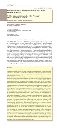 ARTYKUŁY Chrońmy Przyr. Ojcz. 67 (6): 483–493, 2011 Orzeł przedni Aquila chrysaetos w polskiej części Karpat w latach 2008–2011 Golden Eagle Aquila chrysaetos in the Polish part of the Carpathians in 2008–2011 MARIAN STÓJ1, BOGUSŁAW KOZIK2, BARTOSZ KWARCIANY3 Komitet Ochrony Orłów Region Podkarpacki 38–200 Jasło, ul. Podzamcze 1a e-mail: [email protected] 1 2 Pieniński Park Narodowy 34–450 Krościenko nad Dunajcem, ul. Jagiellońska 107 b e-mail: [email protected] Komitet Ochrony Orłów e-mail: [email protected] 3 Słowa kluczowe: orzeł przedni, Aquila chrysaetos, Karpaty, parametry rozrodcze. W latach 2008–2011 na obszarze około 8860 km2 polskich Karpat stwierdzono występowanie 27 par orła przedniego Aquila chrysaetos (zagęszczenie 0,30 pary/100 km2 pow. całkowitej), a populacja wykazywała fluktuację w stosunku do wyników z dwóch poprzednich okresów badań: niewielką tendencję wzrostową w porównaniu do lat 1993–1996, a malejącą w stosunku do lat 1997– –2007. W Karpatach Wschodnich zaobserwowano 13 par, a w Karpatach Zachodnich 14. Średni sukces gniazdowy dla czteroletnich badań wyniósł 63%, liczba piskląt na parę przystępującą do lęgu – 0,68, a liczba młodych na parę z udanym lęgiem – 1,08. Parametry rozrodu karpackiej populacji były jednak zmienne w poszczególnych latach. Straty całkowite (20 przypadków, 37% lęgów) były wynikiem m.in. niekorzystnych warunków pogodowych oraz działalności człowieka. Wysoki sukces gniazdowy (78,6 i 76,5%) orły przednie odniosły w latach 2008 i 2011, a niski (27,3%) w 2010 roku. Sukces gniazdowy zależał głównie od warunków atmosferycznych, dostępu do ofiar, kurczenia się łowisk na skutek zalesień oraz powstawania niekontrolowanej, rozproszonej zabudowy. Po wejściu Polski do Unii Europejskiej, dzięki dopłatom bezpośrednim dla rolników nastąpił powrót do użytkowania gruntów w górach poprzez koszenie i wypasanie łąk, co w konsekwencji przyczynia się do poprawy stanu łowisk orła przedniego i dobrze rokuje na utrzymanie karpackiej populacji tego gatunku w przyszłości. SUMMARY The paper summarizes the results of monitoring of the golden eagle carried out in the Polish part of the Carpathians (ca. 8860 km2) in 2008–2011. Many small populations of the golden eagle in Europe are threatened with extinction. Also in Poland, it is included among high risk species, highly threatened with extinction. In 1993–1996 the occurrence of 21–24 pairs was confirmed and in the subsequent years (1997–2007), the number of breeding pairs was assessed at 29–32. In 2008–2011, the presence of 27 territorial pairs was confirmed in the studied area, including 25 pairs with a known nest. Seven pairs were nesting in the Sanocko-Turczańskie Mts, six pairs in the Western Bieszczady Mts and six pairs in Beskid Niski (Mts), two pairs in Gorce (Mts), and one pair in Beskid Sądecki (Mts), the SpiskoGubałowski Foothills, Pieniny (Mts) and the Tatras. Single pairs without a known nest were also observed in Beskid Żywiecki (Mts) and Beskid Wyspowy (Mts). The report on the monitoring results includes also four pairs from the borderland home ranges, which also made nests on the other side of the border – 2 pairs in Ukraine (Bieszczady Mts, Sanocko-Turczańskie Mts) and 2 pairs in Slovakia (Beskid Sądecki Mts, Pieniny Mts). Nearly half of the golden eagle population occurs in the Eastern Carpathians, with the density of 0.52 pair/100 km2. Golden eagles in the Polish Carpathians prefer fir and fir-beech forest stands located in the vicinity of extensive deforested and semi-open lands. They nest in areas located near the summit, between 400 and 1450 m asl., in small ground depressions sheltered from wind, but usually with a good view over the surroundings. Altogether, 45 nests were inspected in 25 home ranges, including 41 nests (91.1%) on a fir tree Abies alba, and one nest (2.2%) on the European black pine Pinus nigra, one nest (2.2%) on larch Larix decidua, one nest (2.2%) on beech Fagus sylvatica, and one nest (2.2%) on the rock. The average height of a nesting tree was 35 m (range 21–41 m, N = 38), and its average perimeter (measured at 1.3 m) – 258 cm (range 147–380 cm, N = 38). On average a nest was placed 25 m (range 11–35 m, N = 38) above the ground. The outer diameter of nests was ca. 132 cm (range 110–200 cm, N = 35), the inner diameter was 53 cm (range 45–80 cm, N = 35), the height of a nest 80 cm (range 30–200 cm, N = 35), a the depth of a nesting basin 10 cm (range 8–15 cm, N = 16). Individual pairs had from 1 to 5 nests in their home ranges. During four monitored seasons (2008–2011), 63% (N = 54 clutches) of incubations were successful, altogether 37 young birds left their nests during that time. The average number of nestlings per breeding pair was 0.68, and 1.08 per pair with a successful incubation. High nesting success (78.6 and 76.5%) was recorded in 2008 and 2011, and low nesting success in 2010 – when only 3 nestlings per 11 breeding pairs left a nest (27.3%). Twenty cases of complete clutch losses were recorded. Among those with a known cause, the following were confirmed: water soaking and hypothermia of nestlings (2 cases), abandonment of nests during incubation of eggs as a result of forest works (2 cases), predation (1 case), sliding down of a nest during incubation of eggs (1 case), suspected theft of eggs by man (1 case), poisoning of a breeding pair (1 case). The nesting success in 2008–2011 (on average 63%) was lower than the result in 1993–1996 (on average 68%), and slightly higher than the nesting success (62.3%) in 1997–2007. After accession of Poland to the EU, owing to direct subsidies for farmers and agri-environmental programmes, actions aiming at the reduction of succession have been undertaken, and extensive farming has been resumed, which gives hope for the long-term preservation of areas that are hunting grounds of 