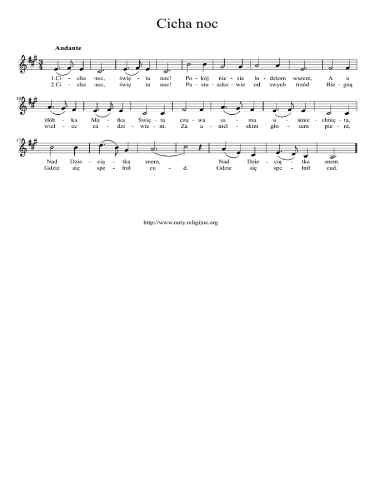 Cicha noc Andante 43 1.Ci 2.Ci cha cha 10 żłób wiel ka ce 17 Nad Gdzie Dzie się noc, noc, Ma za cią spe świę świę tka dzi tka łnił ta ta Świę wie noc! noc! ta ni. snem, cu Po Pa czu Za d. kój stu nie szko wa a sa niel Nad Gdzie http://www.nuty.religijne.org sie wie lu od ma skim Dzie się dziom wszem, swych trzód u gło cią spe śmie sem tka łnił A Bie u gną chnię pie snem. cud. ta, ni,