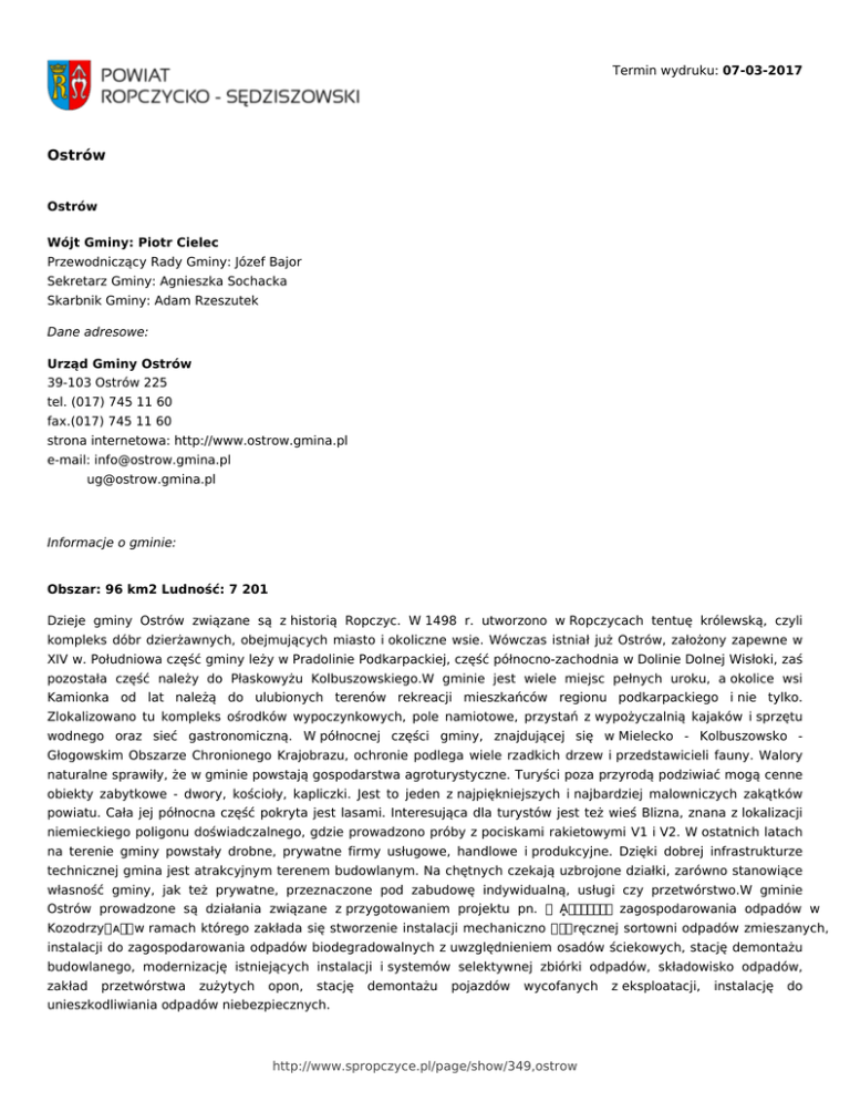Termin wydruku: 07-03-2017 Ostrów Ostrów Wójt Gminy: Piotr Cielec Przewodniczący Rady Gminy: Józef Bajor Sekretarz Gminy: Agnieszka Sochacka Skarbnik Gminy: Adam Rzeszutek Dane adresowe: Urząd Gminy Ostrów 39-103 Ostrów 225 tel. (017) 745 11 60 fax.(017) 745 11 60 strona internetowa: http://www.ostrow.gmina.pl e-mail: [email protected] [email protected] Informacje o gminie: Obszar: 96 km2 Ludność: 7 201 Dzieje gminy Ostrów związane są z historią Ropczyc. W 1498 r. utworzono w Ropczycach tentuę królewską, czyli kompleks dóbr dzierżawnych, obejmujących miasto i okoliczne wsie. Wówczas istniał już Ostrów, założony zapewne w XIV w. Południowa część gminy leży w Pradolinie Podkarpackiej, część północno-zachodnia w Dolinie Dolnej Wisłoki, zaś pozostała część należy do Płaskowyżu Kolbuszowskiego.W gminie jest wiele miejsc pełnych uroku, a okolice wsi Kamionka od lat należą do ulubionych terenów rekreacji mieszkańców regionu podkarpackiego i nie tylko. Zlokalizowano tu kompleks ośrodków wypoczynkowych, pole namiotowe, przystań z wypożyczalnią kajaków i sprzętu wodnego oraz sieć gastronomiczną. W północnej części gminy, znajdującej się w Mielecko - Kolbuszowsko Głogowskim Obszarze Chronionego Krajobrazu, ochronie podlega wiele rzadkich drzew i przedstawicieli fauny. Walory naturalne sprawiły, że w gminie powstają gospodarstwa agroturystyczne. Turyści poza przyrodą podziwiać mogą cenne obiekty zabytkowe - dwory, kościoły, kapliczki. Jest to jeden z najpiękniejszych i najbardziej malowniczych zakątków powiatu. Cała jej północna część pokryta jest lasami. Interesująca dla turystów jest też wieś Blizna, znana z lokalizacji niemieckiego poligonu doświadczalnego, gdzie prowadzono próby z pociskami rakietowymi V1 i V2. W ostatnich latach na terenie gminy powstały drobne, prywatne firmy usługowe, handlowe i produkcyjne. Dzięki dobrej infrastrukturze technicznej gmina jest atrakcyjnym terenem budowlanym. Na chętnych czekają uzbrojone działki, zarówno stanowiące własność gminy, jak też prywatne, przeznaczone pod zabudowę indywidualną, usługi czy przetwórstwo.W gminie Ostrów prowadzone są działania związane z przygotowaniem projektu pn. Ḁ娀愀欁䈀愀搀 Kozodrzy ᴀⰀ w ramach którego zakłada się stworzenie instalacji mechaniczno ጀ ręcznej sortowni odpadów zmieszanych, zagospodarowania odpadów w instalacji do zagospodarowania odpadów biodegradowalnych z uwzględnieniem osadów ściekowych, stację demontażu budowlanego, modernizację istniejących instalacji i systemów selektywnej zbiórki odpadów, składowisko odpadów, zakład przetwórstwa zużytych opon, stację demontażu pojazdów wycofanych unieszkodliwiania odpadów niebezpiecznych. http://www.spropczyce.pl/page/show/349,ostrow z eksploatacji, instalację do publikacja: 20-08-2015 , aktualizacja: 01-09-2015, autor: Barbara Jemioło-Róg Galeria zdjęć http://www.spropczyce.pl/page/show/349,ostrow