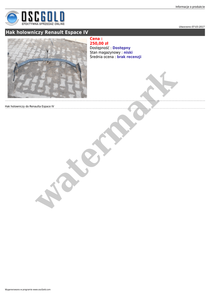 Informacje o produkcie Utworzono 07-03-2017 Hak holowniczy Renault Espace IV Cena : 250,00 zł w at Hak holowniczy do Renaulta Espace IV er m ar k Dostępność : Dostępny Stan magazynowy : niski Średnia ocena : brak recenzji Wygenerowano w programie www.oscGold.com