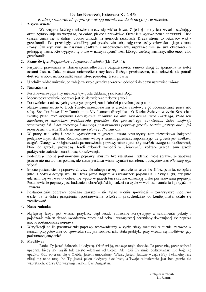 Ks. Jan Bartoszek, Katecheza X / 2015: Realne postanowienie poprawy – drogą odrodzenia duchowego (streszczenie). 1. Z życia wzięte: We wnętrzu każdego człowieka toczy się wielka bitwa. Z jednej strony jest wysoko szybujący orzeł. Symbolizuje on wszystko, co dobre, piękne i prawdziwe. Orzeł lata wysoko ponad chmurami. Choć czasem zniża się w doliny, buduje gniazda na górskich szczytach. Druga strona to pełzający wąż grzechotnik. Ten przebiegły, zdradliwy gad przedstawia sobą najgorsze cechy człowieka - jego ciemne strony. Ów wąż żywi się naszymi upadkami i niepowodzeniami, usprawiedliwia się swą obecnością w pełzającej masie. Kto wygrywa tę bitwę w naszym życiu? Ten, którego częściej karmimy, albo orzeł, albo grzechotnik. 2. Pismo Święte: Przypowieść o faryzeuszu i celniku (Łk 18,9-14): Faryzeusz przekonany o własnej sprawiedliwości i bezgrzeszności, zamyka drogę do spojrzenia na siebie oczami Jezusa. Taka postawa uniemożliwia uzyskanie Bożego przebaczenia, taki człowiek nie potrafi dostrzec w sobie nieuporządkowania, które powoduje grzech pychy. U celnika widać uniżenie, on żałuje za swoje grzechy szczerze i odchodzi do domu usprawiedliwiony. 3. Rozważanie: 4. Postanowienie poprawy nie może być pustą deklaracją składaną Bogu. Mocne postanowienie poprawy jest ściśle związane z decyzją woli. Do uwolnienia od różnych grzesznych przywiązań i słabości potrzebna jest pokora. Należy pamiętać, że to Duch Święty, przekonuje nas o grzechu i motywuje do podejmowania pracy nad sobą. Św. Jan Paweł II w Dominum et Vivificantem (Encyklika - O Duchu Świętym w życiu Kościoła i świata) pisał: Pod wpływem Pocieszyciela dokonuje się owo nawrócenie serca ludzkiego, które jest nieodzownym warunkiem przebaczenia grzechów. Bez prawdziwego nawrócenia, które obejmuje wewnętrzny żal, i bez szczerego i mocnego postanowienia poprawy grzechy zostają „zatrzymane”, jak mówi Jezus, a z Nim Tradycja Starego i Nowego Przymierza. W pracy nad sobą i próbie wychodzenia z grzechu często towarzyszy nam niewłaściwa kolejność podejmowanych działań. Rozpoczynamy walkę z samym grzechem, zapominając, że grzech jest skutkiem czegoś. Dlatego w podejmowaniu postanowienia poprawy istotne jest, aby zwrócić uwagę na okoliczności, które do grzechu prowadzą. Jeżeli człowiek wchodzi w okoliczności rodzące grzech, sam grzech praktycznie staje się nieuniknioną konsekwencją. Podejmując mocne postanowienie poprawy, musimy być realistami i zdawać sobie sprawę, że zapewne jeszcze nie raz zło nas pokona, ale nasza postawa winna wyrażać świadome i zdecydowane: Nie chcę tego więcej. Mocne postanowienie poprawy dotyczy aktualnego naszego nastawienia serca i woli bez pytania, co będzie jutro. Chodzi o decyzję woli tu i teraz przed Bogiem w sakramencie pojednania. Obawy i lęki, czy jutro uda nam się wytrwać w dobru, nie wpaść w grzech ten sam, nie oznaczają braku postanowienia poprawy. Postanowienie poprawy jest budzeniem chrześcijańskiej nadziei na życie w wolności sumienia i przyjaźni z Jezusem. Postanowieniu poprawy powinna zawsze – nie tylko w dniu spowiedzi – towarzyszyć modlitwa o siłę, by te dobre pragnienia i postanowienia, z którymi przychodzimy do konfesjonału, udało się zrealizować. Nasze zadania: Najlepszą lekcją jest własny przykład, stąd każdy sumiennie korzystający z sakramentu pokuty i pojednania winien dawać świadectwo pracy nad sobą i wewnętrznej przemiany dokonującej się poprzez mocne postanowienie poprawy. Weryfikacji na ile postanowienie poprawy wprowadzamy w życie, służy rachunek sumienia, zarówno w ramach przygotowania do spowiedzi św., jak również jako stała praktyka przy wieczornej modlitwie, gdy podsumowujemy dzień. 5. Modlitwa: Panie, Ty jesteś dobrocią i słodyczą. Okaż mi ją, znosząc moją słabość. To przez nią, przez słabość upadam, kiedy me myśli tak często oddalam od Ciebie. Ale jeśli Ty mnie podtrzymasz, nie boję się upadku. Gdy opieram się o Ciebie, jestem umocniony. Wiem, jestem jeszcze wciąż słaby i chwiejny, ale zlituj się nade mną, bo Ty jesteś pełen słodyczy i czułości, a Twoje miłosierdzie jest bez granic dla wszystkich, którzy Cię wzywają. Amen. Św. Augustyn. Króluj nam Chryste! ks. Roman