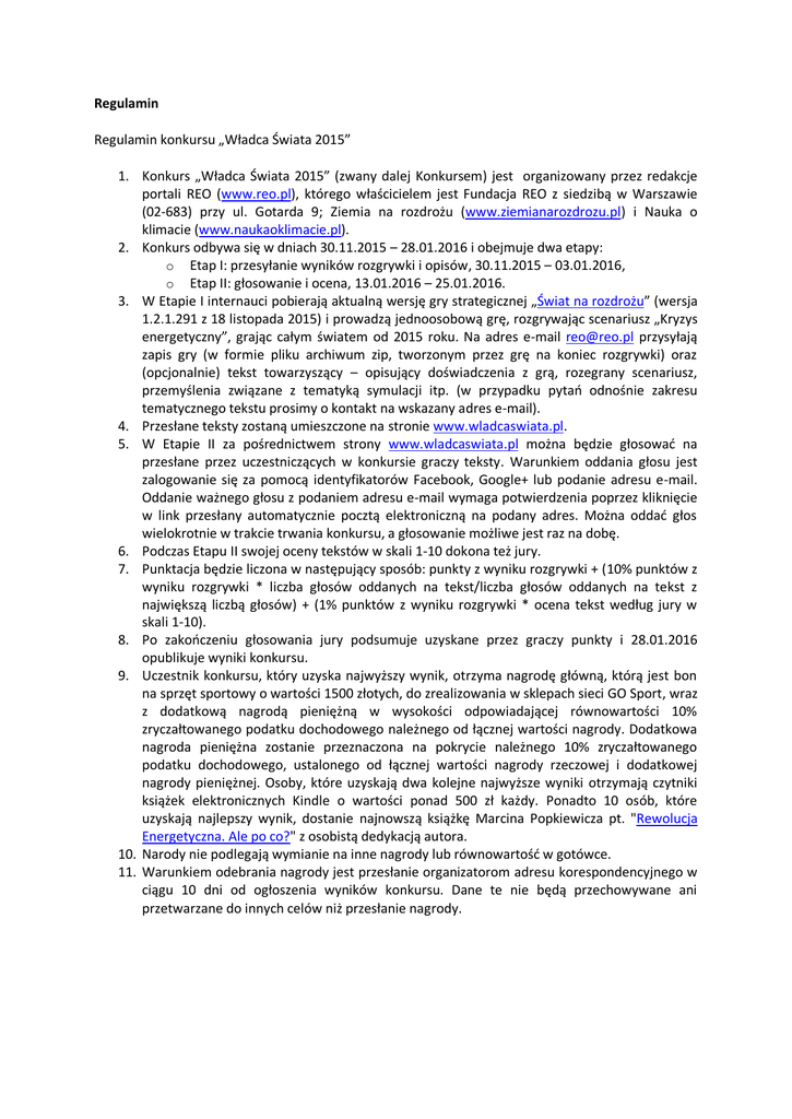 Regulamin Regulamin konkursu „Władca Świata 2015” 1. Konkurs „Władca Świata 2015” (zwany dalej Konkursem) jest organizowany przez redakcje portali REO (www.reo.pl), którego właścicielem jest Fundacja REO z siedzibą w Warszawie (02-683) przy ul. Gotarda 9; Ziemia na rozdrożu (www.ziemianarozdrozu.pl) i Nauka o klimacie (www.naukaoklimacie.pl). 2. Konkurs odbywa się w dniach 30.11.2015 – 28.01.2016 i obejmuje dwa etapy: o Etap I: przesyłanie wyników rozgrywki i opisów, 30.11.2015 – 03.01.2016, o Etap II: głosowanie i ocena, 13.01.2016 – 25.01.2016. 3. W Etapie I internauci pobierają aktualną wersję gry strategicznej „Świat na rozdrożu” (wersja 1.2.1.291 z 18 listopada 2015) i prowadzą jednoosobową grę, rozgrywając scenariusz „Kryzys energetyczny”, grając całym światem od 2015 roku. Na adres e-mail [email protected] przysyłają zapis gry (w formie pliku archiwum zip, tworzonym przez grę na koniec rozgrywki) oraz (opcjonalnie) tekst towarzyszący – opisujący doświadczenia z grą, rozegrany scenariusz, przemyślenia związane z tematyką symulacji itp. (w przypadku pytań odnośnie zakresu tematycznego tekstu prosimy o kontakt na wskazany adres e-mail). 4. Przesłane teksty zostaną umieszczone na stronie www.wladcaswiata.pl. 5. W Etapie II za pośrednictwem strony www.wladcaswiata.pl można będzie głosować na przesłane przez uczestniczących w konkursie graczy teksty. Warunkiem oddania głosu jest zalogowanie się za pomocą identyfikatorów Facebook, Google+ lub podanie adresu e-mail. Oddanie ważnego głosu z podaniem adresu e-mail wymaga potwierdzenia poprzez kliknięcie w link przesłany automatycznie pocztą elektroniczną na podany adres. Można oddać głos wielokrotnie w trakcie trwania konkursu, a głosowanie możliwe jest raz na dobę. 6. Podczas Etapu II swojej oceny tekstów w skali 1-10 dokona też jury. 7. Punktacja będzie liczona w następujący sposób: punkty z wyniku rozgrywki + (10% punktów z wyniku rozgrywki * liczba głosów oddanych na tekst/liczba głosów oddanych na tekst z największą liczbą głosów) + (1% punktów z wyniku rozgrywki * ocena tekst według jury w skali 1-10). 8. Po zakończeniu głosowania jury podsumuje uzyskane przez graczy punkty i 28.01.2016 opublikuje wyniki konkursu. 9. Uczestnik konkursu, który uzyska najwyższy wynik, otrzyma nagrodę główną, którą jest bon na sprzęt sportowy o wartości 1500 złotych, do zrealizowania w sklepach sieci GO Sport, wraz z dodatkową nagrodą pieniężną w wysokości odpowiadającej równowartości 10% zryczałtowanego podatku dochodowego należnego od łącznej wartości nagrody. Dodatkowa nagroda pieniężna zostanie przeznaczona na pokrycie należnego 10% zryczałtowanego podatku dochodowego, ustalonego od łącznej wartości nagrody rzeczowej i dodatkowej nagrody pieniężnej. Osoby, które uzyskają dwa kolejne najwyższe wyniki otrzymają czytniki książek elektronicznych Kindle o wartości ponad 500 zł każdy. Ponadto 10 osób, które uzyskają najlepszy wynik, dostanie najnowszą książkę Marcina Popkiewicza pt. "Rewolucja Energetyczna. Ale po co?" z osobistą dedykacją autora. 10. Narody nie podlegają wymianie na inne nagrody lub równowartość w gotówce. 11. Warunkiem odebrania nagrody jest przesłanie organizatorom adresu korespondencyjnego w ciągu 10 dni od ogłoszenia wyników konkursu. Dane te nie będą przechowywane ani przetwarzane do innych celów niż przesłanie nagrody.