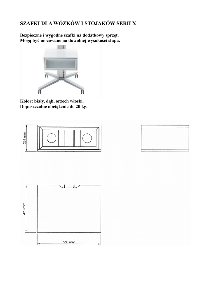 SZAFKI DLA WÓZKÓW I STOJAKÓW SERII X Bezpieczne i wygodne szafki na dodatkowy sprzęt. Mogą być mocowane na dowolnej wysokości słupa. Kolor: biały, dąb, orzech włoski. Dopuszczalne obciąŜenie do 20 kg.
