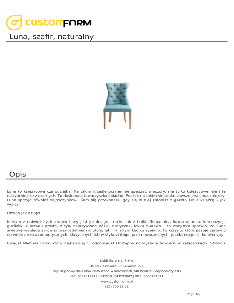 Luna, szafir, naturalny Opis Luna to księżycowa czarodziejka. Na takim krześle przyjemnie spędzać wieczory, nie tylko księżycowe, ale i te najczarniejsze z czarnych. To doskonała towarzyszka śniadań. Posiłek na takim siedzisku zawsze jest smaczniejszy. Luna sprzyja również wypoczynkowi. Sam się przekonasz, gdy się w niej zatopisz z gazetą lub z książką – jak wolisz. Design jak z bajki. Jednym z największych atutów Luny jest jej design, trochę jak z bajki. Niebanalna forma oparcia, kompozycja guzików, z przodu proste, z tyłu zakrzywione nóżki, eteryczna, lekka budowa – to wszystko sprawia, że Luna świetnie wygląda zarówno przy jadalnianym stole, jak i w miłym kąciku sypialni. To krzesło, które pasuje zarówno do wnętrz nieco romantycznych, klasycznych lub w stylu vintage, jak i nowoczesnych, przełamując ich konwencję. Uwaga! Wybierz kolor, który najbardziej Ci odpowiada! Dostępna kolorystyka tapicerki w załącznikach: "Próbnik ----------------------------------------------------------------------------------------------------------------------------------LARB Sp. z o.o. S.K.A. 40-862 Katowice, ul. Gliwicka 275 Sąd Rejonowy dla Katowice-Wschód w Katowicach, VIII Wydział Gospodarczy KRS NIP: 6342817919 | REGON: 243235887 | KRS: 0000457871 www.customform.pl (32) 700 18 01 Page 1/2 tkanin - I, II, III grupa cenowa”. Cena uzależniona jest od rodzaju wybranej tkaniny. Drewniane elementy wykończenia produktu możemy wykonać w kolorach: naturalny - jasne drewno, orzech ciemne drewno, biały oraz czarny. Specyfikacja Wysokość 98/s.49 cm Szerokość 55 cm Głębokość 64 cm Głębokość siedziska 45 cm Wykończenie tkanina skład: 52% PES + 48% ACR Siedzisko tkanina Podstawa drewno Dodatkowe zdjęcia ----------------------------------------------------------------------------------------------------------------------------------LARB Sp. z o.o. S.K.A. 40-862 Katowice, ul. Gliwicka 275 Sąd Rejonowy dla Katowice-Wschód w Katowicach, VIII Wydział Gospodarczy KRS NIP: 6342817919 | REGON: 243235887 | KRS: 0000457871 www.customform.pl (32) 700 18 01 Page 2/2 Powered by TCPDF (www.tcpdf.org)