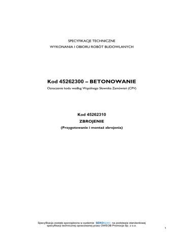 SPECYFIKACJE TECHNICZNE WYKONANIA I OBIORU ROBÓT BUDOWLANYCH Kod 45262300 – BETONOWANIE Oznaczenie kodu według Wspólnego Słownika Zamówień (CPV) Kod 45262310 ZBROJENIE (Przygotowanie i montaŜ zbrojenia) Specyfikacja została sporządzona w systemie SEKOspec SEKOspec na podstawie standardowej specyfikacji technicznej OWEOB opracowanej Promocjaprzez Sp. zOWEOB o.o. 2005Promocja Sp. z o.o. 1 SPIS TREŚCI 1. WSTĘP ................................................................................................................................................ 3 1.1. Przedmiot ST ................................................................................................................................ 3 1.2. Zakres stosowania ST ................................................................................................................ 3 1.3. Zakres robót objętych ST ......................................................................................................... 3 1.4. Określenia podstawowe ............................................................................................................ 3 1.5. Ogólne wymagania dotyczące robót ...................................................................................... 3 2. MATERIAŁY ...................................................................................................................................... 3 3. SPRZĘT ............................................................................................................................................... 5 4. TRANSPORT .................................................................................................................................... 5 5. WYKONANIE ROBÓT ................................................................................................................. 5 6. KONTROLA JAKOŚCI ROBÓT ................................................................................................. 7 7. OBMIAR ROBÓT ............................................................................................................................ 8 8. ODBIÓR ROBÓT ............................................................................................................................ 8 9. PODSTAWA PŁATNOŚCI ........................................................................................................... 9 10. PRZEPISY ZWIĄZANE ............................................................................................................... 9 Specyfikacja została sporządzona w systemie SEKOspec SEKOspec na podstawie standardowej specyfikacji technicznej OWEOB opracowanej Promocjaprzez Sp. zOWEOB o.o. 2005Promocja Sp. z o.o. 2 1. WSTĘP 1.1. Przedmiot ST Przedmiotem niniejszej standardowej specyfikacji technicznej (ST) są wymagania dotyczące wykonania iodbioru zbrojenia betonu w konstrukcjach Ŝelbetowych wykonywanych na mokro wbudynkach oraz obiektach budownictwa inŜynieryjnego. 1.2. Zakres stosowania ST Specyfikacja techniczna (ST) stanowi podstawę opracowania szczegółowej specyfikacji technicznej (SST) stosowanej jako dokument przetargowy i kontraktowy przy zlecaniu irealizacji robót wymienionych w pkt. 1.1. Znaczy to, iŜ projektant sporządzający dokumentację projektową i odpowiednie szczegółowe specyfikacje techniczne wykonania i odbioru robót budowlanych moŜe wprowadzać do niniejszej standardowej specyfikacji zmiany, uzupełnienia lub uściślenia, odpowiednie dla przewidzianych projektem robót, uwzględniające wymagania Zamawiającego oraz konkretne warunki realizacji robót, które są niezbędne do określania ich standardu i jakości. Odstępstwa od wymagań podanych w niniejszej specyfikacji mogą mieć miejsce tylko wprzypadkach małych prostych robót i konstrukcji drugorzędnych o niewielkim znaczeniu, dla których istnieje pewność, Ŝe podstawowe wymagania będą spełnione przy zastosowaniu metod wykonania na podstawie doświadczenia i przy przestrzeganiu zasad sztuki budowlanej. 1.3. Zakres robót objętych ST Ustalenia zawarte w niniejszej Specyfikacji mają zastosowanie przy wykonywaniu zbrojenia konstrukcji budynków oraz obiektów budownictwa inŜynieryjnego. Roboty, których dotyczy Specyfikacja, obejmują wszystkie czynności mające na celu wykonanie robót związanych z: – przygotowaniem zbrojenia, – montaŜem zbrojenia, – kontrolą jakości robót i materiałów. Zakres robót obejmuje elementy konstrukcyjne fundamentów, podpór, murów, konstrukcje szkieletowe, płyty, belki, podciągi, gzymsy oraz konstrukcje związane z wyposaŜeniem i obsługą obiektów. 1.4. Określenia podstawowe Określenia podane w niniejszej Specyfikacji są zgodne z odpowiednimi normami oraz określeniami podanymi w ST Kod CPV 45000000-7 „Wymagania ogólne”. Pręty stalowe wiotkie – pręty stalowe o przekroju kołowym Ŝebrowane o średnicy do 40 mm. Zbrojenie niespręŜajace – zbrojenie konstrukcji betonowej niewprowadzające do niej napręŜeń w sposób czynny. 1.5. Ogólne wymagania dotyczące robót Wykonawca robót jest odpowiedzialny za jakość ich wykonania oraz za zgodność z dokumentacją projektową, ST i poleceniami Inspektora nadzoru. Ogólne wymagania dotyczące robót podano w ST Kod CPV 45000000-7. 2. MATERIAŁY Ogólne wymagania dotyczące materiałów, ich pozyskiwania i składowania podano w ST Kod CPV 45000000-7 „Wymagania ogólne” pkt 2. Specyfikacja została sporządzona w systemie SEKOspec SEKOspec na podstawie standardowej specyfikacji technicznej OWEOB opracowanej Promocjaprzez Sp. zOWEOB o.o. 2005Promocja Sp. z o.o. 3 2.1. Stal zbrojeniowa 2.1.1. Asortyment stali zbrojeniowej Do zbrojenia konstrukcji Ŝelbetowych prętami wiotkimi w obiektach budowlanych objętych zakresem kontraktu stosuje się stal klas i gatunków wg dokumentacji projektowej, wg normy PN-H-84023/6: AIIIN, gatunku RB500 W/BSt500S-O.T.B. oraz stal klasy AI, gatunku St3SX-b. 2.1.2. Właśc