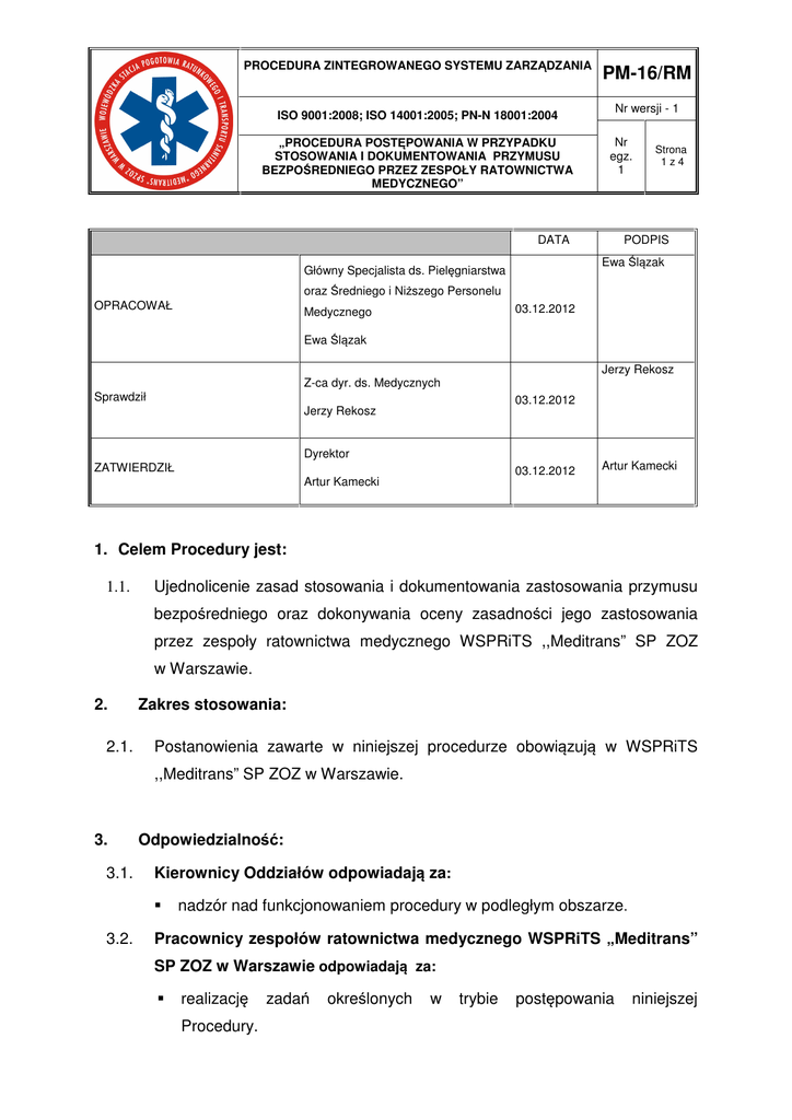 PROCEDURA ZINTEGROWANEGO SYSTEMU ZARZĄDZANIA PM-16/RM Nr wersji - 1 ISO 9001:2008; ISO 14001:2005; PN-N 18001:2004 „PROCEDURA POSTĘPOWANIA W PRZYPADKU STOSOWANIA I DOKUMENTOWANIA PRZYMUSU BEZPOŚREDNIEGO PRZEZ ZESPOŁY RATOWNICTWA MEDYCZNEGO” Nr egz. 1 DATA Strona 1z4 PODPIS Ewa Ślązak Główny Specjalista ds. Pielęgniarstwa oraz Średniego i Niższego Personelu OPRACOWAŁ 03.12.2012 Medycznego Ewa Ślązak Jerzy Rekosz Z-ca dyr. ds. Medycznych Sprawdził 03.12.2012 Jerzy Rekosz Dyrektor ZATWIERDZIŁ 03.12.2012 Artur Kamecki Artur Kamecki 1. Celem Procedury jest: 1.1. Ujednolicenie zasad stosowania i dokumentowania zastosowania przymusu bezpośredniego oraz dokonywania oceny zasadności jego zastosowania przez zespoły ratownictwa medycznego WSPRiTS ,,Meditrans” SP ZOZ w Warszawie. 2. 2.1. Zakres stosowania: Postanowienia zawarte w niniejszej procedurze obowiązują w WSPRiTS ,,Meditrans” SP ZOZ w Warszawie. 3. 3.1. Odpowiedzialność: Kierownicy Oddziałów odpowiadają za: 3.2. nadzór nad funkcjonowaniem procedury w podległym obszarze. Pracownicy zespołów ratownictwa medycznego WSPRiTS „Meditrans” SP ZOZ w Warszawie odpowiadają za: realizację Procedury. zadań określonych w trybie postępowania niniejszej PROCEDURA ZINTEGROWANEGO SYSTEMU ZARZĄDZANIA PROCEDURA POSTĘPOWANIA W PRZYPADKU STOSOWANIA I DOKUMENTOWANIA PRZYMUSU BEZPOŚREDNIEGO PRZEZ ZESPOŁY RATOWNICTWA MEDYCZNEGO 4. 4.1. PM-16/RM Wersja 1 Strona 2z4 Terminologia: WSPRiTS „Meditrans”- Wojewódzka Stacja Pogotowia Ratunkowego i Transportu Sanitarnego „Meditrans” Samodzielny Publiczny Zakład Opieki Zdrowotnej w Warszawie. 4.2. Zespół Ratownictwa Medycznego – wyróżniamy następujące rodzaje zespołów ratownictwa medycznego: zespoły specjalistyczne „S” - w skład których wchodzą co najmniej trzy osoby uprawnione do wykonywania medycznych czynności ratunkowych, w tym lekarz systemu oraz pielęgniarka systemu lub ratownik medyczny (Dz.U.06.191.1410 ), zespoły podstawowe „P” - w skład których wchodzą co najmniej dwie osoby uprawnione do wykonywania medycznych czynności ratunkowych, w tym pielęgniarka systemu lub ratownik medyczny (Dz.U.06.191.1410 ). 5. Tryb postępowania: Procedura została opracowana zgodnie z ustawą o ochronie zdrowia psychicznego z dnia 19 sierpnia 1994 roku / Dz.U.z 1994 Nr 111 poz.535/ oraz rozporządzeniem Ministra Zdrowia z dnia 28 czerwca 2012 roku w sprawie stosowania i dokumentowania zastosowania przymusu bezpośredniego oraz dokonywania oceny zasadności jego zastosowania /Dz.U. z 2012 poz. 740/. 5.1. Przymus bezpośredni wobec osób z zaburzeniami psychicznymi, można stosować tylko wtedy , gdy osoby te : • dopuszczają się zamachu przeciwko; życiu lub zdrowiu własnemu lub innej osoby, lub bezpieczeństwu publicznemu, lub • w sposób gwałtowny niszczą lub uszkadzają przedmioty znajdujące się w ich otoczeniu. PROCEDURA ZINTEGROWANEGO SYSTEMU ZARZĄDZANIA PM-16/RM PROCEDURA POSTĘPOWANIA W PRZYPADKU STOSOWANIA I DOKUMENTOWANIA PRZYMUSU BEZPOŚREDNIEGO PRZEZ ZESPOŁY RATOWNICTWA MEDYCZNEGO 5.2. Jeśli nie jest możliwe uzyskanie Wersja 1 Strona 3z4 natychmiastowej decyzji lekarza, o zastosowaniu przymusu bezpośredniego w formie unieruchomienia decyzję podejmuje i kierujący akcją medycznych czynności ratunkowych. 5.3. O zastosowaniu przymusu bezpośredniego zlecający go niezwłocznie zawiadamia: 5.4. Dyspozytora medycznego, Lekarza Koordynatora Medycznego Centrum Dyspozytorskiego (LKM). Lekarz Koordynator Medyczny Centrum Dyspozytorskiego umieszcza informację o zastosowaniu przymusu bezpośredniego przez zespół RM w raporcie LKM z uwzględnieniem daty, godziny, numeru zespołu oraz numeru wyjazd. Raport Lekarza Koordynatora Medycznego przekazywany jest Dyrektorowi WSPRiTS ,,Meditrans” następnego dnia rano. 5.5. Zastosowanie przymusu bezpośredniego przez zespoły ratownictwa medycznego polega na przytrzymaniu lub unieruchomieniu pacjenta. 5.6. Przymus bezpośredni stosuje się nie dłużej niż przez czas niezbędny do uzyskania pomocy lekarskiej, a w przypadku gdy jej uzyskanie jest utrudnione, na czas niezbędny do przewiezienia osoby do zakładu psychiatrycznej opieki zdrowotnej lub szpitala wskazanego przez dyspozytora medycznego. 5.7. Każdy przypadek zastosowania przymusu bezpośredniego i uprzedzenia o możliwości jego zastosowania odnotowuje się w dokumentacji medycznej. 5.8. Po zastosowaniu przymusu bezpośredniego w formie unieruchomienia kierujący akcją prowadzenia medycznych czynności ratunkowych wypełnia druk zawiadomienia o zastosowaniu przymusu bezpośredniego. 5.9. Druk zawiadomienia o zastosowaniu przymusu bezpośredniego stanowi załącznik nr 1 do niniejszej procedury. 5.10. Zawiadomienie o zastosowaniu przymusu bezpośredniego wypełniane jest w dwóch egzemplarzach. Jeden przekazywany jest razem z Kartą Medycznych Czynności Ratunkowych lekarzowi podmiotu leczniczego, do którego została przewieziona osoba z zaburzeniami psychicznymi, drugi PROCEDURA ZINTEGROWANEGO SYSTEMU ZARZĄDZANIA PM-16/RM PROCEDURA POSTĘPOWANIA W PRZYPADKU STOSOWANIA I DOKUMENTOWANIA PRZYMUSU BEZPOŚREDNIEGO PRZEZ ZESPOŁY RATOWNICTWA MEDYCZNEGO egzemplarz dołączony zostaje do Karty Wersja 1 Medycznych Strona 4z4 Czynności Ratunkowych pozostającej w WSPRiTS ,,Meditrans”. 5.11. Dział Statystyki Medycznej i Realizacji Świadczeń Zdrowotnych prowadzi rejestr przypadków zastosowania przymusu bezpośredniego, którego wzór stanowi załącznik nr2. 5.12. W Karcie Medycznych Czynności Ratunkowych należy opisać objawy i okoliczności zaburzonego zachowania , reakcje na działania zespołu RM oraz informacje o przeszłości medycznej chorego w tym o przyjmowanych lekach. 5.13. Osobie z zaburzeniami psychicznymi, wobec której jest stosowany przymus bezpośredni w formie unieruchomienia, należy odebrać przedmioty, które mogą być niebezpieczne dla życia lub zdrowia tej osoby lub innych osób, w szczególności pr