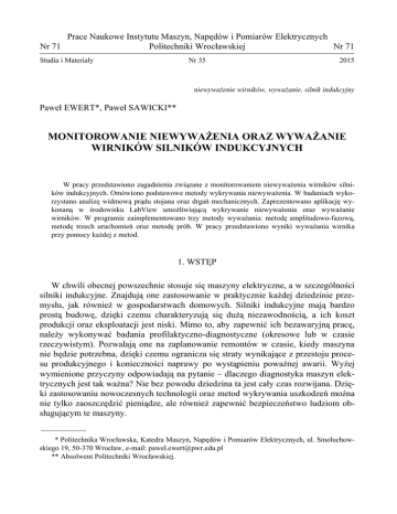 Prace Naukowe Instytutu Maszyn, Napędów i Pomiarów Elektrycznych Nr 71 Politechniki Wrocławskiej Nr 71 Studia i Materiały Nr 35 2015 niewyważenie wirników, wyważanie, silnik indukcyjny Paweł EWERT*, Paweł SAWICKI** MONITOROWANIE NIEWYWAŻENIA ORAZ WYWAŻANIE WIRNIKÓW SILNIKÓW INDUKCYJNYCH W pracy przedstawiono zagadnienia związane z monitorowaniem niewyważenia wirników silników indukcyjnych. Omówiono podstawowe metody wykrywania niewyważenia. W badaniach wykorzystano analizę widmową prądu stojana oraz drgań mechanicznych. Zaprezentowano aplikację wykonaną w środowisku LabView umożliwiającą wykrywanie niewyważenia oraz wyważanie wirników. W programie zaimplementowano trzy metody wyważania: metodę amplitudowo-fazową, metodę trzech uruchomień oraz metodę prób. W pracy przedstawiono wyniki wyważania wirnika przy pomocy każdej z metod. 1. WSTĘP W chwili obecnej powszechnie stosuje się maszyny elektryczne, a w szczególności silniki indukcyjne. Znajdują one zastosowanie w praktycznie każdej dziedzinie przemysłu, jak również w gospodarstwach domowych. Silniki indukcyjne mają bardzo prostą budowę, dzięki czemu charakteryzują się dużą niezawodnością, a ich koszt produkcji oraz eksploatacji jest niski. Mimo to, aby zapewnić ich bezawaryjną pracę, należy wykonywać badania profilaktyczno-diagnostyczne (okresowe lub w czasie rzeczywistym). Pozwalają one na zaplanowanie remontów w czasie, kiedy maszyna nie będzie potrzebna, dzięki czemu ogranicza się straty wynikające z przestoju procesu produkcyjnego i konieczności naprawy po wystąpieniu poważnej awarii. Wyżej wymienione przyczyny odpowiadają na pytanie – dlaczego diagnostyka maszyn elektrycznych jest tak ważna? Nie bez powodu dziedzina ta jest cały czas rozwijana. Dzięki zastosowaniu nowoczesnych technologii oraz metod wykrywania uszkodzeń można nie tylko zaoszczędzić pieniądze, ale również zapewnić bezpieczeństwo ludziom obsługującym te maszyny. __________ * Politechnika Wrocławska, Katedra Maszyn, Napędów i Pomiarów Elektrycznych, ul. Smoluchowskiego 19, 50-370 Wrocław, e-mail: [email protected] ** Absolwent Politechniki Wrocławskiej. 141 2. NIEWYWAŻENIE WIRNIKÓW 2.1. INFORMACJE WSTĘPNE Niewyważenie jest to taki stan, w jakim znajduje się element wirujący, kiedy rozkład jego masy jest nierównomierny względem osi obrotu. Powoduje to powstawanie niezrównoważonych sił i momentów odśrodkowych, które wywołują reakcje dynamiczne na łożyskach, co skutkuje powstawaniem drgań i hałasu, a także prowadzi do ich uszkodzeń [1], [4]. Istnieją cztery rodzaje niewyważenia: • Niewyważenie statyczne – występuje, gdy oś wirnika i jego główna oś bezwładności są względem siebie przesunięte równolegle. • Niewyważenie quasi-statyczne – występuje, gdy oś wirnika i jego centralna oś bez-władności przecinają się w punkcie innym niż środek ciężkości wirnika. • Niewyważenie momentowe – występuje, gdy oś wirnika i jego centralna oś bezwładności przecinają się w punkcie odpowiadającym środkowi ciężkości wirnika. • Niewyważenie dynamiczne – połączenie niewyważenia statycznego i momentowego. Najczęstszymi przyczynami powstawania niewyważenia są: • niepoprawny montaż, • wady materiałowe, • błędy konstrukcyjne. Niewyważenie nie dotyczy jedynie wirników silników elektrycznych. Zjawisko to jest powszechne wszędzie tam, gdzie odbywa się ruch obrotowy elementów, na przykład: koła samochodów, śruby okrętów, czy też bębny pralek [4]. 2.2. METODY WYKRYWANIA NEWYWAŻENIA WIRNIKÓW Do wykrywania niewyważenia wirników najczęściej stosuje się analizę widmową prądu stojana lub drgań mechanicznych. Przemieszczanie się wirnika oraz drgania temu towarzyszące w stanie niewyważenia powodują asymetrię szczeliny powietrznej, a przez to również nierównomierny naciąg magnetyczny. Efektem tego jest zwiększony udział harmonicznych obrotowych określonych następującą zależnością [3]: fs ± fr (1) gdzie: fs – częstotliwość znamionowa prądu stojana, fr – częstotliwość obrotowa. Jak widać na rys. 1 częstotliwości fs ± fr dla wirnika wyważonego nieznacznie wyróżniają się sponad poziomu szumów, natomiast w przypadku wirnika niewyważonego można zauważyć wyraźny wzrost amplitud charakterystycznych częstotliwości. 142 Rys. 1. Przykładowe widma FFT prądu stojana z wirnikiem wyważonym (po lewej stronie) oraz niewyważonym (po prawej stronie) Podczas ruchu obrotowego niezrównoważona masa powoduje powstawanie siły odśrodkowej odpowiadającej za przemieszczanie się wirnika. Przemieszczenie to powoduje powstawanie drgań, które przenoszone są na łożyska. Częstotliwość tych drgań jest równa [3]: kf r = n 60 (2) gdzie: fr – częstotliwość obrotowa, k – 1, 2, 3, ..., n – prędkość obrotowa. Rys. 2. Przykładowe widma FFT przyspieszenia drgań mechanicznych dla silnika z wirnikiem wyważonym (po lewej stronie) oraz niewyważonym (po prawej stronie) Na rysunku 2 można zauważyć, że udział częstotliwości obrotowej jak i jej krotności w przedstawionym fragmencie widma drgań silnika z wyważonym wirnikiem jest niewielki. W przypadku wirnika niewyważonego widać wyraźny wzrost amplitud obserwowanych charakterystycznych częstotliwości. 2.3. METODY WYWAŻANIA WIRNIKÓW Istnieje wiele metod wyważania wirników, jednak wykorzystują one te same wielkości takie jak amplituda drgań, czy kąt fazowy. Różnią się od siebie dokładnością, poziomem skomplikowania obliczeń oraz przede wszystkim czasem potrzebnym na 143 wykonanie wyważania. W opracowanej w środowisku LabView aplikacji do wykrywania niewyważenia oraz wyważania wirników zaimplementowano trzy najpopularniejsze metody: 1. Metodę trzech uruchomień [2], [4] – metoda ta należy do grupy metod amplitudowych, gdzie do wyznaczania wartości i kąta niewyważenia wymagany