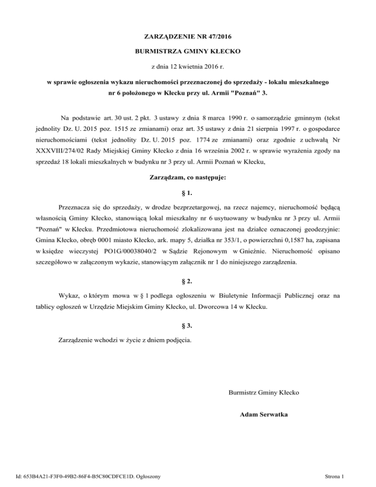 ZARZĄDZENIE NR 47/2016 BURMISTRZA GMINY KŁECKO z dnia 12 kwietnia 2016 r. w sprawie ogłoszenia wykazu nieruchomości przeznaczonej do sprzedaży - lokalu mieszkalnego nr 6 położonego w Kłecku przy ul. Armii "Poznań" 3. Na podstawie art. 30 ust. 2 pkt. 3 ustawy z dnia 8 marca 1990 r. o samorządzie gminnym (tekst jednolity Dz. U. 2015 poz. 1515 ze zmianami) oraz art. 35 ustawy z dnia 21 sierpnia 1997 r. o gospodarce nieruchomościami (tekst jednolity Dz. U. 2015 poz. 1774 ze zmianami) oraz zgodnie z uchwałą Nr XXXVIII/274/02 Rady Miejskiej Gminy Kłecko z dnia 16 września 2002 r. w sprawie wyrażenia zgody na sprzedaż 18 lokali mieszkalnych w budynku nr 3 przy ul. Armii Poznań w Kłecku, Zarządzam, co następuje: § 1. Przeznacza się do sprzedaży, w drodze bezprzetargowej, na rzecz najemcy, nieruchomość będącą własnością Gminy Kłecko, stanowiącą lokal mieszkalny nr 6 usytuowany w budynku nr 3 przy ul. Armii "Poznań" w Kłecku. Przedmiotowa nieruchomość zlokalizowana jest na działce oznaczonej geodezyjnie: Gmina Kłecko, obręb 0001 miasto Kłecko, ark. mapy 5, działka nr 353/1, o powierzchni 0,1587 ha, zapisana w księdze wieczystej PO1G/00038040/2 w Sądzie Rejonowym w Gnieźnie. Nieruchomość opisano szczegółowo w załączonym wykazie, stanowiącym załącznik nr 1 do niniejszego zarządzenia. § 2. Wykaz, o którym mowa w § 1 podlega ogłoszeniu w Biuletynie Informacji Publicznej oraz na tablicy ogłoszeń w Urzędzie Miejskim Gminy Kłecko, ul. Dworcowa 14 w Kłecku. § 3. Zarządzenie wchodzi w życie z dniem podjęcia. Burmistrz Gminy Kłecko Adam Serwatka Id: 653B4A21-F3F0-49B2-86F4-B5C80CDFCE1D. Ogłoszony Strona 1 Załącznik nr 1 do Zarządzenia Burmistrza Gminy Kłecko nr 47/2016 z dnia 12 kwietnia 2016 r. WYKAZ nieruchomości przeznaczonej do sprzedaży – lokalu mieszkalnego nr 6 położonego w Kłecku przy ul. Armii „Poznań” 3. Oznaczenie Oznaczenie Powierzchnia nieruchomości nieruchomości Lp. nieruchowg. księgi wg. ewidencji mości wieczystej gruntów 1 1 2 PO1G/ 00038040/2 3 Działka nr 353/1 4 0,1587 ha Opis nieruchomości Forma sprzedaży Cena Wysokość opłat i terminy wnoszenia 5 6 7 8 Nieruchomość stanowi lokal mieszkalny nr 6, usytuowany w budynku nr 3, położonym w Kłecku przy ul. Armii 76.442,00 zł „Poznań”. Znajduje się na działce nr 353/1, przeznaczonej w wartość lokalu Studium Uwarunkowań i Kierunków Zagospodarowania wraz z pomieszPrzestrzennego pod tereny mieszkaniowe i siedliska. Działka czeniem zabudowana jest budynkiem mieszkalnym wielorodzinnym, w Sprzedaż przynależnym którym wyodrębniono 18 lokali mieszkalnych wraz z w drodze + Zgodnie z pomieszczeniami przynależnymi - piwnicami. Przedmiotowy bezprzetar4.527,00 zł - protokołem lokal nr 6 w budynku nr 3 usytuowany jest na II pietrze i składa gowej wartość uzgodnień się z trzech pokoi, kuchni, łazienki, WC i przedpokoju o na rzecz ułamkowej 2 powierzchni użytkowej mieszkalnej 63,07 m . Lokal posiada najemcy części gruntu balkon. Do lokalu przynależy piwnica o powierzchni użytkowej 2 8,18 m . Łączna powierzchnia użytkowa mieszkalna i RAZEM przynależna wynosi 71,25 m2. Do lokalu przynależy udział 80.969,00 zł wynoszący 7125/128450 części w częściach wspólnych nieruchomości oraz w gruncie – dz. nr 353//1. Warunki zmiany ceny 9 Termin złożenia wniosku przez osoby, którym przysługuje pierwszeństwo w nabyciu 10 Obowiązuje 6 tygodni od dnia cena ustalona ogłoszenia wykazu przez - do 27.05.2016 rzeczoznawcę (pierwszeństwo w majątkowego nabyciu na podstawie – art. 34 ust. 1 pkt 1 i 2 przysługująca ustawy o gospodarce bonifikata nieruchomościami + (Dz. U. z 2015 r. obowiązująca poz. 1774) stawka VAT Burmistrz Gminy Kłecko Adam Serwatka Id: 653B4A21-F3F0-49B2-86F4-B5C80CDFCE1D. Ogłoszony Strona 2