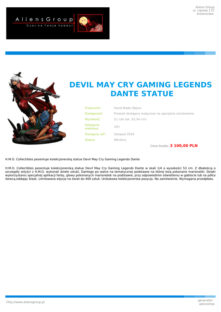 Aliens Group ul. Lipowa 17C Inowrocław DEVIL MAY CRY GAMING LEGENDS DANTE STATUE Producent: Hand Made Object Dostępność: Produkt dostępny wyłącznie na specjalne zamówienie Wysokość: 21 cali (ok. 53,34 cm) Kategoria wiekowa: 18+ Dostępny od*: listopad 2016 Status: Wkrótce Cena brutto: 3 100,00 PLN H.M.O. Collectibles pezentuje kolekcjonerską statue Devil May Cry Gaming Legends Dante H.M.O. Collectibles pezentuje kolekcjonerską statue Devil May Cry Gaming Legends Dante w skali 1/4 o wysokości 53 cm. Z dbałością o szczegóły artyści z H.M.O. wykonali dzieło sztuki, Dantego po walce na tematycznej podstawie na której leżą pokonane marionetki. Dzięki wykorzystaniu specjalnej aplikacji farby, głowy pokonanych marionetek na podstawie, przy odpowiednim oświetleniu w gablocie lub na półce świecą.oddając blask. Limitowana edycja na świat do 400 sztuk. Unikatowa kolekcjonerska pozycja. Na zamówienie. Wymagana przedpłata. http://www.aliensgroup.pl generator: aptusshop