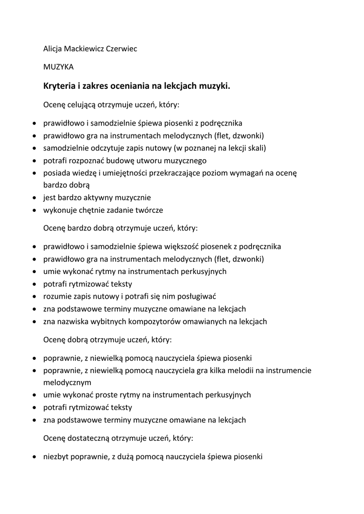 Alicja Mackiewicz Czerwiec MUZYKA Kryteria i zakres oceniania na lekcjach muzyki. Ocenę celującą otrzymuje uczeń, który: prawidłowo i samodzielnie śpiewa piosenki z podręcznika prawidłowo gra na instrumentach melodycznych (flet, dzwonki) samodzielnie odczytuje zapis nutowy (w poznanej na lekcji skali) potrafi rozpoznać budowę utworu muzycznego posiada wiedzę i umiejętności przekraczające poziom wymagań na ocenę bardzo dobrą jest bardzo aktywny muzycznie wykonuje chętnie zadanie twórcze Ocenę bardzo dobrą otrzymuje uczeń, który: prawidłowo i samodzielnie śpiewa większość piosenek z podręcznika prawidłowo gra na instrumentach melodycznych (flet, dzwonki) umie wykonać rytmy na instrumentach perkusyjnych potrafi rytmizować teksty rozumie zapis nutowy i potrafi się nim posługiwać zna podstawowe terminy muzyczne omawiane na lekcjach zna nazwiska wybitnych kompozytorów omawianych na lekcjach Ocenę dobrą otrzymuje uczeń, który: poprawnie, z niewielką pomocą nauczyciela śpiewa piosenki poprawnie, z niewielką pomocą nauczyciela gra kilka melodii na instrumencie melodycznym umie wykonać proste rytmy na instrumentach perkusyjnych potrafi rytmizować teksty zna podstawowe terminy muzyczne omawiane na lekcjach Ocenę dostateczną otrzymuje uczeń, który: niezbyt poprawnie, z dużą pomocą nauczyciela śpiewa piosenki niezbyt poprawnie, z dużą pomocą nauczyciela gra kilka melodii na instrumencie melodycznym wykonuje najprostsze rytmy na instrumentach perkusyjnych niestarannie prowadzi zeszyt zna niektóre terminy muzyczne omawiane na lekcjach Ocenę dopuszczającą otrzymuje uczeń, który: niedbale śpiewa piosenki niedbale gra na instrumentach melodycznych niechętnie podejmuje działania muzyczne myli terminy muzyczne dysponuje tylko fragmentaryczną wiedzą Ocenę niedostateczną otrzymuje uczeń, który: nie opanował w stopniu elementarnym nie opanował materiału nie nabył umiejętności wskazanych w programie nauczania wykazuje negatywny stosunek do przedmiotu nie bierze udziału w działaniach twórczych nie wykazuje żadnej chęci do poprawy swojej oceny nie prowadzi zeszytu przedmiotowego