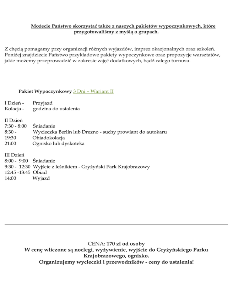 Możecie Państwo skorzystać także z naszych pakietów wypoczynkowych, które przygotowaliśmy z myślą o grupach. Z chęcią pomagamy przy organizacji różnych wyjazdów, imprez okazjonalnych oraz szkoleń. Poniżej znajdziecie Państwo przykładowe pakiety wypoczynkowe oraz propozycje warsztatów, jakie możemy przeprowadzić w zakresie zajęć dodatkowych, bądź całego turnusu. Pakiet Wypoczynkowy 3 Dni – Wariant II I Dzień Kolacja - Przyjazd godzina do ustalenia II Dzień 7:30 - 8:00 8:30 19:30 21:00 Śniadanie Wycieczka Berlin lub Drezno - suchy prowiant do autokaru Obiadokolacja Ognisko lub dyskoteka III Dzień 8:00 - 9:00 9:30 - 12:30 12:45 -13:45 14:00 Śniadanie Wyjście z leśnikiem - Gryżyński Park Krajobrazowy Obiad Wyjazd CENA: 170 zł od osoby W cenę wliczone są noclegi, wyżywienie, wyjście do Gryżyńskiego Parku Krajobrazowego, ognisko. Organizujemy wycieczki i przewodników - ceny do ustalenia!