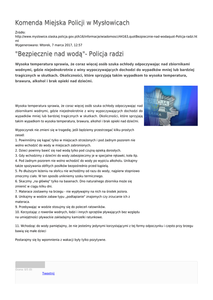 Komenda Miejska Policji w Mysłowicach Źródło: http://www.myslowice.slaska.policja.gov.pl/k16/informacje/wiadomosci/44163,quotBezpiecznie-nad-wodaquot-Policja-radzi.ht ml Wygenerowano: Wtorek, 7 marca 2017, 12:57 "Bezpiecznie nad wodą"- Policja radzi Wysoka temperatura sprawia, że coraz więcej osób szuka ochłody odpoczywając nad zbiornikami wodnymi, gdzie niejednokrotnie z winy wypoczywających dochodzi do wypadków mniej lub bardziej tragicznych w skutkach. Okoliczności, które sprzyjają takim wypadkom to wysoka temperatura, brawura, alkohol i brak opieki nad dziećmi. Wysoka temperatura sprawia, że coraz więcej osób szuka ochłody odpoczywając nad zbiornikami wodnymi, gdzie niejednokrotnie z winy wypoczywających dochodzi do wypadków mniej lub bardziej tragicznych w skutkach. Okoliczności, które sprzyjają takim wypadkom to wysoka temperatura, brawura, alkohol i brak opieki nad dziećmi. Wypoczynek nie zmieni się w tragedię, jeśli będziemy przestrzegać kilku prostych zasad: 1. Powinniśmy się kąpać tylko w miejscach strzeżonych i pod żadnym pozorem nie wolno wchodzić do wody w miejscach zabronionych. 2. Dzieci powinny bawić się nad wodą tylko pod czujną opieką dorosłych. 3. Gdy wchodzimy z dziećmi do wody zabezpieczmy je w specjalne rękawki, koła itp. 4. Pod żadnym pozorem nie wolno wchodzić do wody po wypiciu alkoholu. Unikajmy także spożywania obfitych posiłków bezpośrednio przed kąpielą. 5. Po dłuższym leżeniu na słońcu nie wchodźmy od razu do wody, najpierw stopniowo zmoczmy ciało. W ten sposób unikniemy szoku termicznego. 6. Skaczmy „na główkę" tylko na basenach. Dno naturalnego zbiornika może się zmienić w ciągu kilku dni. 7. Materace zostawmy na brzegu - nie wypływajmy na nich na środek jeziora. 8. Unikajmy w wodzie zabaw typu „podtapianie" znajomych czy zrzucanie ich z materaca. 9. Przebywając w wodzie stosujmy się do poleceń ratowników. 10. Korzystając z rowerów wodnych, łodzi i innych sprzętów pływających bez względu na umiejętności pływackie zakładajmy kamizelki ratunkowe. 11. Wchodząc do wody pamiętajmy, że nie jesteśmy jedynymi korzystającymi z tej formy odpoczynku i często przy brzegu bawią się małe dzieci Postarajmy się by wpomnienia z wakacji były tylko pozytywne. Ocena: 0/5 (0) Tweetnij