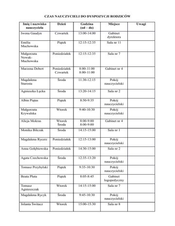 CZAS NAUCZYCIELI DO DYSPOZYCJI RODZICÓW Imię i nazwisko nauczyciela Dzień Godzina (od – do) Miejsce Czwartek 13:00-14:00 Gabinet dyrektora Emilia Muchowska Piątek 12:15-12:35 Sala nr 11 Małgorzata NowakMuchowska Poniedziałek 12:15-12:35 Sala nr 7 Marzena Debert Poniedziałek Czwartek 8:00-11:00 8:00-11:00 Gabinet nr 4 Magdalena Starosta Środa 11:30-12:15 Pokój nauczycielski Agnieszka Łęcka Środa 13:20-14:15 Sala nr 2 Albin Piątas Piątek 8:50-9:35 Pokój nauczycielski Małgorzata Krywalska Wtorek 9:40-10:30 Pokój nauczycielski Alicja Mokras Wtorek Środa 8:00-9:00 8:00-9:00 Gabinet nr 4 Środa 14:15-15:00 Sala nr 1 Magdalena Rycerz Poniedziałek 12:15-13:00 Pokój nauczycielski Anna Gołębiowska Poniedziałek 14:30-15:00 Sala nr 2 Agata Czechowska Środa 12:35-13:20 Pokój nauczycielski Tomasz Przybylski Piątek 9:35-10:30 Pokój nauczycielski Beata Pluta Piątek 8:05-8:45 Gabinet logopedyczny Tomasz Agnieszczak Wtorek 14:15-15:00 Sala nr 7 Środa 9:45-10:30 Pokój nauczycielski Wtorek 15:00-15:30 Sala nr 8 Iwona Gaudyn Monika Bilczak Magdalena Rycyk Jolanta Świtacz Uwagi