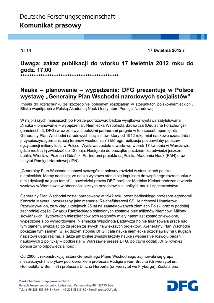 Deutsche Forschungsgemeinschaft Komunikat prasowy