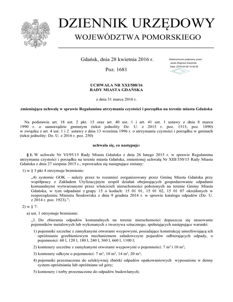 DZIENNIK URZĘDOWY WOJEWÓDZTWA POMORSKIEGO Gdańsk, dnia 28 kwietnia 2016 r. Elektronicznie podpisany przez: Jacek Zbigniew Karpiński Poz. 1681 Data: 2016-04-28 14:42:55 UCHWAŁA NR XXI/588/16 RADY MIASTA GDAŃSKA z dnia 31 marca 2016 r. zmieniająca uchwałę w sprawie Regulaminu utrzymania czystości i porządku na terenie miasta Gdańska Na podstawie art. 18 ust. 2 pkt. 15 oraz art. 40 ust. 1 i art. 41 ust. 1 ustawy z dnia 8 marca 1990 r. o samorządzie gminnym (tekst jednolity Dz. U. z 2015 r. poz. 1515, poz. 1890) w związku z art. 4 ust. 1 i 2 ustawy z dnia 13 września 1996 r. o utrzymaniu czystości i porządku w gminach (tekst jednolity: Dz. U. z 2016 r. poz. 250) uchwala się, co następuje: § 1. W uchwale Nr VI/95/15 Rady Miasta Gdańska z dnia 26 lutego 2015 r. w sprawie Regulaminu utrzymania czystości i porządku na terenie miasta Gdańska, zmienionej uchwałą Nr XIII/350/15 Rady Miasta Gdańska z dnia 27 sierpnia 2015 r., wprowadza się następujące zmiany: 1) w § 3 pkt 4 otrzymuje brzmienie: „4) systemie GOK – należy przez to rozumieć zorganizowany przez Gminę Miasta Gdańska przy współpracy z Zakładem Utylizacyjnym zespół działań obejmujących gospodarowanie odpadami komunalnymi wytwarzanymi przez właścicieli nieruchomości położonych na terenie Gminy Miasta Gdańska, w tym odpadami z grupy 15 o kodach: 15 01 01, 15 01 02, 15 01 07 określonych w rozporządzeniu Ministra Środowiska z dnia 9 grudnia 2014 r. w sprawie katalogu odpadów (Dz. U. z 2014 r. poz. 1923).”; 2) w § 7: a) ust. 1 otrzymuje brzmienie: „1. Do zbierania odpadów komunalnych na terenie nieruchomości dopuszcza się stosowanie pojemników metalowych lub wykonanych z tworzywa sztucznego, spełniających następujące warunki: 1) pojemniki szczelne z zamykanymi otworami wsypowymi, posiadające konstrukcję umożliwiającą ich opróżnianie grzebieniowym mechanizmem załadowczym pojazdów odbierających odpady, o pojemności: 60 l, 120 l, 180 l, 240 l, 360 l, 660 l, 1100 l; 2) kontenery szczelne z zamykanymi otworami wsypowymi o pojemności: 7 m3 i 10 m3; 3) kontenery odkryte o pojemności: 7 m3, 10 m3, 14 m3, 20 m3; 4) pojemniki przeznaczone do selektywnej zbiórki odpadów opakowaniowych wyposażone w denny system opróżniania lub opróżniane od góry; 5) kontenery i torby przeznaczone do odpadów budowlanych; Dziennik Urzędowy Województwa Pomorskiego –2– Poz. 1681 6) pojemniki specjalne do gromadzenia zużytych olejów, odpadów niebezpiecznych, leków oraz tekstyliów i zużytej odzieży; 7) pojemniki półpodziemne (częściowo zagłębione w ziemi) i naziemne oraz szczelne zbiorniki podziemne, z wyprowadzoną na powierzchnię terenu komorą wrzutową, dostosowane do opróżniania samochodem wyposażonym w urządzenie dźwigowe HDS; 8) pojemniki przystosowane do zgniatania i zagęszczania odpadów komunalnych (tzw. „prasokontenery”) wyłącznie na odpady suche i zmieszane, posiadające konstrukcję umożliwiającą ich opróżnienie hakowym mechanizmem załadowczym pojazdów odbierających odpady, o pojemności: 1 m3, 5 m3, 8 m3, 10 m3, 12 m3, 16 m3 i 20 m3.”, b) ust. 3 otrzymuje brzmienie: „3. Pojemniki, o których mowa w ust. 1 pkt 1, powinny spełniać wymagania Polskiej Normy PN-EN 840 lub posiadać deklarację zgodności wystawioną przez producenta zgodnie z ustawą z dnia 30 sierpnia 2002 r. o systemie oceny zgodności (Dz. U. z 2004 r., Nr 204, poz. 2087 z późn. zm.).”; 3) § 10 otrzymuje brzmienie: „§ 10. 1. Właściciele nieruchomości są zobowiązani do: 1) wyznaczenia i odpowiedniego przygotowania we własnym zakresie i na własny koszt punktu gromadzenia odpadów z uwzględnieniem selektywnego zbierania odpadów, określonego w § 4 ust. 2 pkt 1-3, 2) zapewnienia pracownikom przedsiębiorcy odbierającego odpady w ramach systemu GOK swobodnego dostępu do wszystkich pojemników zlokalizowanych w punkcie gromadzenia odpadów, w szczególności przekazania przedsiębiorcy odbierającemu odpady komunalne niezbędnej ilości kluczy, pilotów i kodów dostępu do drzwi i bram; 3) zapewnienia czystości i właściwego stanu sanitarnego punktu gromadzenia odpadów. 2. Jeżeli nie zapewniono swobodnego dostępu do pojemników zlokalizowanych w punkcie gromadzenia odpadów, o którym mowa w ust. 1 pkt 2, pojemniki należy wystawiać w dniu odbioru odpadów przed wejściem na teren nieruchomości. 3. W przypadku krótkotrwałego zwiększenia ilości odpadów mokrych, suchych, szkła lub niesegregowanych powstających na terenie nieruchomości zamieszkałych, dopuszcza się zbieranie powstałej nadwyżki odpadów w workach, o których mowa w § 7 ust. 2.”; 4) uchyla się § 12. 5) § 13 otrzymuje brzmienie: „§ 13. Właściciele nieruchomości, na których prowadzona jest działalność gastronomiczna lub handlowa w branży spożywczej, w tym w czasie imprez, oprócz zbierania odpadów komunalnych w pojemnikach zlokalizowanych w punkcie gromadzenia odpadów, zobowiązani są odpowiednio do: 1) ustawienia na zewnątrz lokalu lub obiektu wystarczającej liczby pojemników na odpady i ich opróżniania do pojemników zlokalizowanych w punkcie gromadzenia odpadów z częstotliwością zapobiegającą przepełnieniu oraz sprzątania otoczenia lokalu ze śmieci związanych z prowadzoną działalnością handlową lub gastronomiczną, bez względu na to, czy obok znajduje się pojemnik na odpady usytuowany na terenach, o których mowa w § 11 Regulaminu; 2) gromadzenia zużytych olejów jadalnych używanych w procesach technologicznych w szczelnych pojemnikach dostarczanych przez odbierających oleje, a ich wywóz udokumentować dowodem przekazania odpadów.”; 6) § 16 otrzymuje brzmienie: „§ 16. Do odbioru przeterminowanych leków służą specjalnie zabezpieczone i odpowiednio oznakowane pojemniki, ustawione w aptekach.”; 7) § 22 otrzymuje brzmienie: Dziennik Urzędowy Województwa Pomorskiego –3– Poz. 1681 „§ 22. Właściciele nier