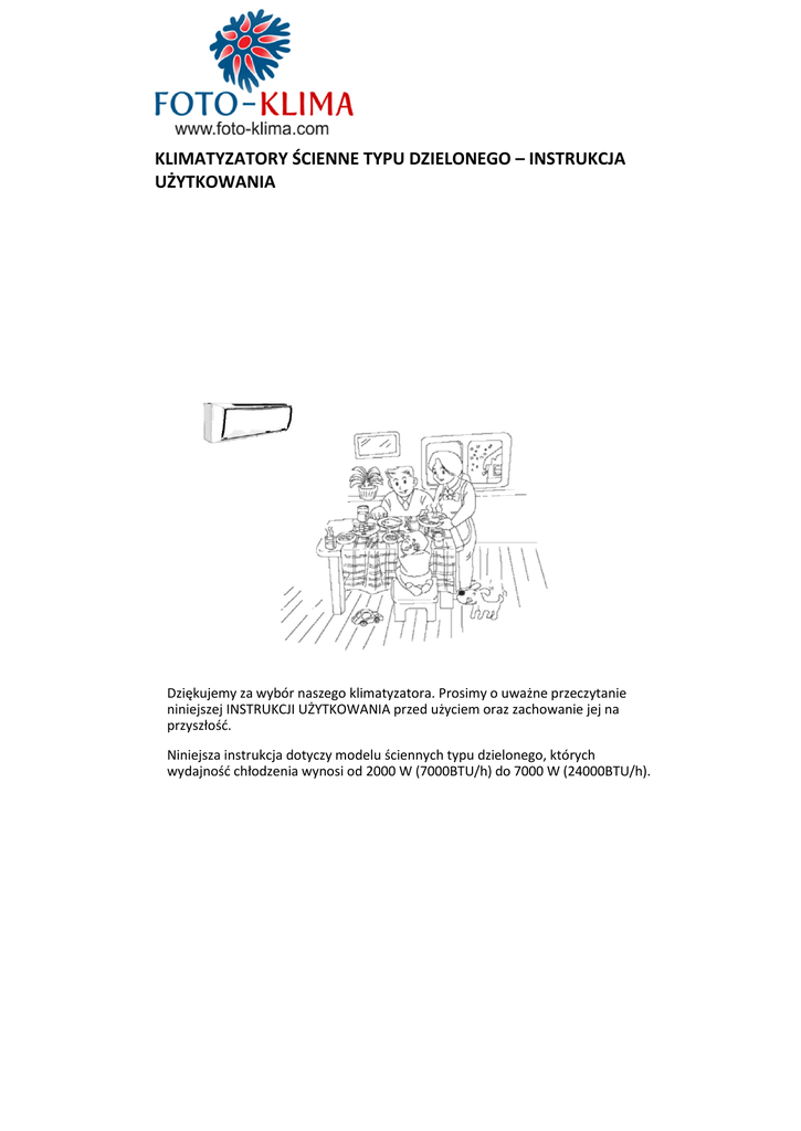 FOTO-KLIMA www.foto-klima.pl KLIMATYZATORY ŚCIENNE TYPU DZIELONEGO – INSTRUKCJA UŻYTKOWANIA Dziękujemy za wybór naszego klimatyzatora. Prosimy o uważne przeczytanie niniejszej INSTRUKCJI UŻYTKOWANIA przed użyciem oraz zachowanie jej na przyszłośd. Niniejsza instrukcja dotyczy modelu ściennych typu dzielonego, których wydajnośd chłodzenia wynosi od 2000 W (7000BTU/h) do 7000 W (24000BTU/h). SPIS TREŚCI Spis treści .......................................................................................................... 1 Względy bezpieczeostwa ..................................................................................... 2 Nazwy części ...................................................................................................... 4 Serwis i konserwacja ......................................................................................... 7 Rozwiązywanie problemów................................................................................ 8 Parametry wydajności ........................................................................................ 10 WZGLĘDY BEZPIECZEOSTWA Przed użyciem należy dokładnie przeczytad i zrozumied niniejsze względy bezpieczeostwa. Podane pozycje są bardzo ważne i należy ich przestrzegad. Poniższe rysunki mają jedynie charakter informacyjny. Niektóre modele o wydajności chłodzenia powyżej 4600 W (17000 BTU/h) mają przewód zasilający bez wtyczki. Jako punkt odniesienia należy więc traktowad obiekty rzeczywiste. Absolutnie nie Koniecznie UWAGA Klimatyzator musi byd uziemiony. Niepełne uziemienie może powodowad porażenia. Nie ciągnąd za przewód zasilania podczas tych obsługi. Może to spowodowad pożar. W celu odłączenia wtyczki należy wyłączyd urządzenie i ciągnąd za wtyczkę. Nie przedłużad przewodu zasilania przez podłączanie innych przewodów ani przedłużaczy. Nie podłączad innych obciążeo do gniazda zasilania. Nie uszkadzad przewodu, ani nie łączyd go. Stawianie ciężkich przedmiotów na przewodzie, zbliżanie gorących obiektów, lub połączenia mogą powodowad porażenia i pożar. Nie wystawiad organizmu na długotrwałe działanie zimnego lub gorącego powietrza; nie chłodzid ani nie ogrzewad pomieszczenia zbyt mocno. Może to wpłynąd na kondycję fizyczną i spowodowad problemy zdrowotne. Urządzenie nie jest przeznaczone do użycia przez dzieci lub osoby niedołężne bez nadzoru. gdy urządzenie nie jest przez dłuższy czas używane, należy wyciągnąd wtyczkę lub wyłączyd zasilanie. (Zbierający się brud może spowodowad pożar) W celu uniknięcia porażeo należy zainstalowad przerywacz upływu uziemienia o znamionowej wartości. Nie umieszczad urządzeo spalinowych w miejscach przepływu powietrza, gdyż może to powodowad niekompletne spalanie. WZGLĘDY BEZPIECZEOSTWA Do czyszczenia nie używad następujących substancji: rozpuszczalników, insektycydów, palnych substancji w sprayu, mogących powodowad uszkodzenie urządzenia. Urządzenia wewnętrznego nie spryskiwad wodą. Podczas dłuższego używania klimatyzatora zamknąd okna i drzwi; jeśli w pomieszczeniu jest duszno, można na chwilę otworzyd drzwi lub okno, aby wpuścid trochę świeżego powietrza. Jeśli pojawi się anomalia, jak np. zapach spalania, należy natychmiast wyłączyd urządzenie i wyłącznik. Nie instalowad klimatyzatora w miejscach wycieków palnych gazów. Jeśli nastąpi przypadkowy upływ elektryczny z urządzenia, może to łatwo wywoład pożar lub wybuch. Nie używad urządzenia do specjalnych celów. Nie używad go do przechowywania precyzyjnych urządzeo, żywności, farb, itp. przedmiotów, które wymagają określonej wilgotności i temperatury dla zachowania jakości. Nie otwierad okien i drzwi podczas pracy urządzenia w trybie chłodzenia/osuszania przez dłuższy czas, gdy wilgotnośd przekracza 80%. W przeciwnym razie z urządzenia może kapad woda. Nie wkładad palców, prętów ani innych przedmiotów do kratek wylotowych i wlotowych. Pracujący wentylator może spowodowad obrażenia. Produkt ten nie może byd wyrzucany razem z odpadami domowymi. Musi zostad usunięty w autoryzowanej jednostce recyklingu urządzeo elektrycznych i elektronicznych. Urządzenie musi byd instalowane zgodnie z obowiązującymi w danym kraju przepisami. Urządzenie nie może byd instalowane w pralni. Urządzenie musi byd zainstalowane 2,3 m nad posadzką. Urządzenie musi byd umieszczone tak, aby korek był dostępny. Dla niektórych modeli o wydajności chłodzenia ponad 4600 W (17000BTU/h) należy zastosowad wyłącznik wielobiegunowy o odległości rozłączenia co najmniej 3 mm, oraz wyłącznik różnicowo-prądowy, o wartości ponad 10 mA. 1. URZĄDZENIE ZEWNĘTRZNE I WEWNĘTRZNE Wlot powietrza NAZWY CZĘŚCI Rura połączeniowa Filtr Przedni panel Wlot powietrza Przewód odpływowy Wylot powietrza Otwór odpływowy Wyświetlacz Klapka Lewa/prawa klapka (obsługa ręczna) UWAGA Wygląd urządzeo może byd inny dla niektórych modeli. 2.MODELE WYŚWIETLACZA Ilustracja pokazuje wszystkie wyświetlacze dla modeli, opisanych w instrukcji. Podczas użytkowania jako punkt odniesienia należy traktowad obiekty rzeczywiste. A: KONTROLKI WSKAZUJĄCE Kontrolka czasu Kontrolka czasu Kontrolka nocna Kontrolka pracy Kontrolka pracy Kontrolka nocna Kontrolka pracy Kontrolka czasu Kontrolka nocna Odbiornik sygnału pilota B: IKONA + KONTROLKA WSKAZUJĄCA Wyświetlacz temperatury i czasu Kontrolka czasu Kontrolka nocna Kontrolka pracy Kontrolka czasu LUB Kontrolka nocna Kontrolka pracy NAZWY CZĘŚCI C:OKNO WYŚWIETLACZA a. Wyświetlacz po prawej stronie urządzenia wewnętrznego. Podczas użytkowania włączane będą tylko odpowiednie ikony. Wyświetlacz temp. i czasu Temperatura wnętrza Prędkośd wentylatora Tryb nocny Tryb osuszania Tryb ogrzewania elektr. Tryb czasu Tryb pompy ciepła Tryb automatyczny Tryb chłodzenia. Tryb nawiewu b. Wyświetlacz na środku urządzenia wewnętrz