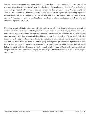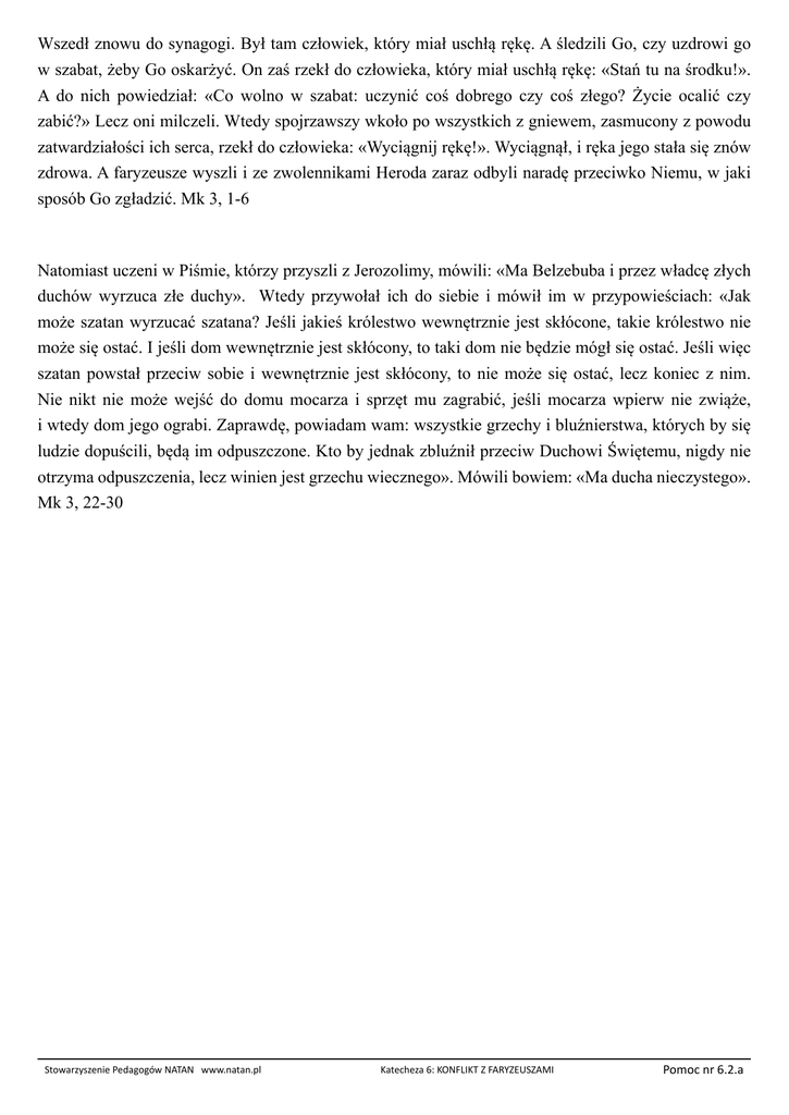 Wszedł znowu do synagogi. Był tam człowiek, który miał uschłą rękę. A śledzili Go, czy uzdrowi go w szabat, żeby Go oskarżyć. On zaś rzekł do człowieka, który miał uschłą rękę: «Stań tu na środku!». A do nich powiedział: «Co wolno w szabat: uczynić coś dobrego czy coś złego? Życie ocalić czy zabić?» Lecz oni milczeli. Wtedy spojrzawszy wkoło po wszystkich z gniewem, zasmucony z powodu zatwardziałości ich serca, rzekł do człowieka: «Wyciągnij rękę!». Wyciągnął, i ręka jego stała się znów zdrowa. A faryzeusze wyszli i ze zwolennikami Heroda zaraz odbyli naradę przeciwko Niemu, w jaki sposób Go zgładzić. Mk 3, 1-6 Natomiast uczeni w Piśmie, którzy przyszli z Jerozolimy, mówili: «Ma Belzebuba i przez władcę złych duchów wyrzuca złe duchy». Wtedy przywołał ich do siebie i mówił im w przypowieściach: «Jak może szatan wyrzucać szatana? Jeśli jakieś królestwo wewnętrznie jest skłócone, takie królestwo nie może się ostać. I jeśli dom wewnętrznie jest skłócony, to taki dom nie będzie mógł się ostać. Jeśli więc szatan powstał przeciw sobie i wewnętrznie jest skłócony, to nie może się ostać, lecz koniec z nim. Nie nikt nie może wejść do domu mocarza i sprzęt mu zagrabić, jeśli mocarza wpierw nie zwiąże, i wtedy dom jego ograbi. Zaprawdę, powiadam wam: wszystkie grzechy i bluźnierstwa, których by się ludzie dopuścili, będą im odpuszczone. Kto by jednak zbluźnił przeciw Duchowi Świętemu, nigdy nie otrzyma odpuszczenia, lecz winien jest grzechu wiecznego». Mówili bowiem: «Ma ducha nieczystego». Mk 3, 22-30 Stowarzyszenie Pedagogów NATAN www.natan.pl Katecheza 6: KONFLIKT Z FARYZEUSZAMI Pomoc nr 6.2.a