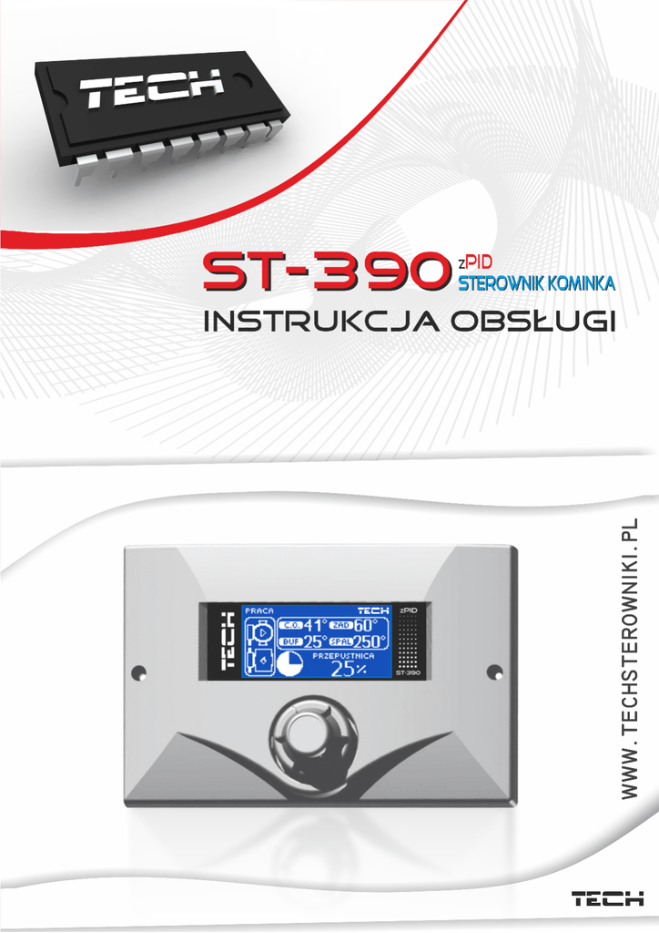 ST – 390 instrukcja obsługi UWAGA! URZĄDZENIE ELEKTRYCZNE POD NAPIĘCIEM! Przed dokonaniem jakichkolwiek czynności związanych z zasilaniem (podłączanie przewodów, instalacja urządzenia, itp.) należy upewnić się, że regulator nie jest podłączony do sieci! Montażu powinna dokonać osoba posiadająca odpowiednie uprawnienia elektryczne zgodnie ze szczegółowymi przepisami kraju przeznaczenia Przed uruchomieniem sterownika należy dokonać pomiaru skuteczności zerowania silników elektrycznych, oraz pomiaru izolacji przewodów elektrycznych. -2- TECH TECH Deklaracja zgodności nr 47/2011 My, firma TECH, ul. St. Batorego 14, 34-120 Andrychów, deklarujemy z pełną odpowiedzialnością, że produkowany przez nas termoregulator ST-390 230V, 50Hz spełnia wymagania Rozporządzenia Ministra Gospodarki Pracy i Polityki Społecznej. (Dz.U. Nr 155, poz. 1089) z dnia 21 sierpnia 2007 r., wdrażającego postanowienia Dyrektywy Niskonapięciowej (LVD) 2006/95/WE z dnia 16.01.2007 r. Sterownik ST-390 przeszedł pozytywnie badania kompatybilności EMC przy podłączeniu optymalnych obciążeń. Do ocen zgodności zastosowano normy zharmonizowane PN-EN 60730-2-9:2006. Współwłaściciele: Paweł Jura, Janusz Master -3- TECH I. Opis Regulator temperatury ST–390 z przepustnicą przeznaczony jest do sterowania procesem spalania w domowym kominku grzewczym. Regulator ten steruje pracą pompy obiegowej, przepustnicą oraz wyjściem beznapięciowym (sterowanie dodatkowym urządzeniem). Sterowanie odbywa się przy pomocy gałki impulsatora. Kręcąc gałką podczas głównego widoku ekranu zmienia się temperaturę zadaną kominka. Po naciśnięciu impulsatora przechodzi się do menu sterownika. Użytkownik przemieszcza się w funkcjach menu oraz zmienia wartość wybranego parametru kręcąc gałką. Wciskając gałkę zatwierdza się wybraną funkcję lub zmianę wartości nastawy. Aby opuścić menu lub przejść do wyższego poziomu należy wybrać pozycję wyjście. Widok ekranu głównego: STAN STEROWNIKA AKTUALNA TEMP. CO POMPA AKTYWNA ZADANA TEMP. CO DODATKOWE ŹRÓDŁO CIEPŁA AKTYWNE TEMPERATURA SPALIN STOPIEŃ OTWARCIA PRZEPUSTNICY TEMPERATURA BUFORA PROCENTOWY STOPIEŃ OTWARCIA PRZEPUSTNICY -5- ST – 390 instrukcja obsługi Pojęcia podstawowe: Rozpalanie – cykl ten rozpoczyna się w momencie załączenia w menu sterownika funkcji rozpalanie i trwa do czasu, gdy temperatura C.O. osiągnie wartość co najmniej 40oC (fabrycznie ustawiony próg rozpalania), pod warunkiem, że temperatura ta nie spadnie poniżej tej wartości przez 4 minuty (fabrycznie ustawiony czas rozpalania). Jeżeli warunki te zostaną spełnione, regulator przejdzie do trybu pracy a na wyświetlaczu pojawi się napis PRACA. W przypadku, gdy od załączenia funkcji rozpalanie sterownik nie osiągnie odpowiednich parametrów przejścia w tryb pracy w ciągu 30 minut, na wyświetlaczu pojawi się komunikat „Rozpalanie nieudane”. W takim przypadku należy rozpocząć cykl rozpalania od początku. Praca – po zakończeniu rozpalania regulator przechodzi w cykl pracy. Jest to podstawowy stan funkcjonowania regulatora, w którym przepustnica pracuje automatycznie według algorytmu zPID, oscylując wokół zadanej przez użytkownika temperatury. W menu użytkownika zamiast funkcji rozpalanie pojawi się pozycja zał/wył przepustnicę. Przepustnicę można w razie potrzeby wyłączyć (na przykład podczas dokładania opału), wtedy przepustnica zamyka się całkowicie. Tryb nadzoru – tryb ten uruchomi się automatycznie, jeżeli w cyklu pracy temperatura wzrośnie o 5oC powyżej zadanej. W takim przypadku, aby obniżyć temperaturę wody obiegowej, sterownik zamyka całkowicie przepustnicę. Wygaszanie – jeżeli temperatura CO spadnie o 2 oC poniżej progu rozpalania i nie wzrośnie powyżej tej wartości przez 10 minut (fabrycznie ustawiony czas wygaszania), to regulator przejdzie w stan wygaszania. Po tym czasie przepustnica zamknie się całkowicie a na wyświetlaczu pojawi się komunikat „Wygaszony”. -6- TECH W przypadku zaniku napięcia termoregulator przestaje pracować a przepustnica zamyka się całkowicie (dzięki wbudowanemu kondensatorowi o dużej pojemności). Po ponownym pojawieniu się zasilania sterownik powraca do pracy przy wcześniej ustawionych parametrach dzięki wbudowanej pamięci. Brak napięcia nie usuwa zapisanych parametrów termoregulatora. UWAGA: Po każdym załączeniu sterownika jest wykonywana kalibracja przepustnicy. II. Funkcje regulatora Rozdział ten opisuje funkcje regulatora oraz sposób zmiany ustawień. II.a) Rozpalanie Funkcja rozpalanie ma na celu uzyskanie optymalnego płomienia w palenisku w możliwie najkrótszym czasie. Rozpalanie jest wspomagane odpowiednią pracą przepustnicy. Proces ten trwa do momentu, gdy temperatura CO osiągnie odpowiednią wartość do przejścia w tryb pracy. Po przejściu regulatora w tryb pracy, zamiast funkcji rozpalanie pojawi się pozycja wł/wył przepustnicę. Przepustnicę można w razie potrzeby wyłączyć (na przykład podczas dokładania opału), wtedy przepustnica zamyka się całkowicie. II.b) Praca ręczna Regulator został zaopatrzony w moduł Pracy ręcznej. W funkcji tej, -7- ST – 390 instrukcja obsługi każdy element wykonawczy jest załączany i wyłączany niezależnie od pozostałych (pompa, styk beznapięciowy). Dodatkowo użytkownik ma możliwość ręcznego sterowania pracą przepustnicy regulując procentową wartość otwarcia. Dwie sekundy po ręcznej procentowej zmianie uchylenia przepustnicy zaczyna ona zmieniać swoje położenie do zadanej wartości a na wyświetlaczu pojawia się symbol klepsydry. II.c) Temperatura wyłączenia styku Regulator posiada wyjście styku beznapięciowego, którego zadaniem jest rozłączanie (lub zwieranie) styku, gdy temperatura CO osiągnie ustawioną przez użytkownika wartość. Zakres nastaw tego parametru zawiera się w przedziale 35÷75OC. Styk beznapięciow
