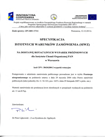 Specyfikacja Istotnych Warunków Zamówienia na dostawę rotacyjnych wyparek próżniowych 1. Informacje wprowadzające 1.1 Dane Zamawiającego: Instytut Chemii Organicznej Polskiej Akademii Nauk NIP: 525-000-89-33 REGON: 000325848 Dokładny adres do korespondencji: ul. Kasprzaka 44/52, 01-224 Warszawa Faks do korespondencji w sprawie Zamówienia: 22 632-66-81 E-mail do korespondencji w sprawie Zamówienia: [email protected] Znak Postępowania: ZP-2401-17/11 Strona, na której znajduje się SIWZ: http://www.icho.edu.pl/przetargi.php 1.2 Użyte w Specyfikacji terminy mają następujące znaczenie: 1.2.1 „Instytut”, „IChO PAN” lub „Zamawiający” – Instytut Chemii Organicznej PAN. 1.2.2 „Postępowanie” – postępowanie prowadzone przez Zamawiającego na podstawie niniejszej Specyfikacji. 1.2.3 „SIWZ” – niniejsza Specyfikacja Istotnych Warunków Zamówienia. 1.2.4 „Ustawa” lub „Pzp” - ustawa z dnia 29 stycznia 2004 r. - Prawo zamówień publicznych. 1.2.5 „Zamówienie” – należy przez to rozumieć zamówienie publiczne, którego przedmiot został w sposób szczegółowy opisany w punkcie 3 SIWZ. 1.2.6 „Wykonawca” – podmiot, który ubiega się o wykonanie Zamówienia, złoży ofertę na wykonanie Zamówienia lub zawrze z Zamawiającym umowę w sprawie wykonania Zamówienia. 1.3 W szczególnie uzasadnionych przypadkach Zamawiający ma prawo do zmiany treści Specyfikacji Istotnych Warunków Zamówienia. Zmiana może nastąpić w każdym czasie, przed upływem terminu do składania ofert. W przypadku wprowadzenia takiej zmiany, informacja o tym zostanie niezwłocznie zamieszczona na stronie Zamawiającego, oraz przekazana wszystkim podmiotom, które pobrały od Zamawiającego Specyfikację i będzie dla nich wiążąca. 2. Tryb udzielenia Zamówienia: 2.1. Postępowanie o udzielenie Zamówienia prowadzone jest w trybie Przetargu nieograniczonego na podstawie ustawy z dnia 29 stycznia 2004 roku Prawo zamówień publicznych (tekst jednolity Dz. U. Nr 223, poz. 1655 z dnia 29 listopada 2007 z późniejszymi zmianami), przepisów wykonawczych wydanych na jej podstawie oraz niniejszej Specyfikacji Istotnych Warunków Zamówienia. 2 Specyfikacja Istotnych Warunków Zamówienia na dostawę rotacyjnych wyparek próżniowych 3. Opis przedmiotu Zamówienia: 3.1. Przedmiotem zamówienia jest dostawa czterech rotacyjnych wyparek próżniowych wraz z pompami i kontrolerami próżni dla Instytutu Chemii Organicznej PAN w Warszawie, ich instalacja i uruchomienie w siedzibie Zamawiającego oraz przeszkolenie użytkowników w zakresie obsługi i eksploatacji urządzeń. UWAGA! Ze względu na różne źródła finansowania przedmiotu zamówienia, Zamawiający wymaga aby Wykonawca zawarł w ofercie wyszczególnienie cenowe dla poszczególnych pomp oraz kontrolera. Wymagane będzie również wystawienie osobnych faktur dla wskazanych pozycji, które Zamawiający określi po podpisaniu umowy. Wszystkie dostarczone wyparki mają być urządzeniami fabrycznie nowymi, kompletnymi, gotowym do użytkowania bez dodatkowych zakupów i inwestycji. Jeśli Zamawiający pominął w specyfikacji jakiś element, który jest niezbędny do funkcjonowania zestawów, Wykonawca uwzględni go w swojej ofercie. 3.2. Szczegółowy opis przedmiotu Zamówienia: Przedmiotem Zamówienia jest dostawa czterech rotacyjnych wyparek próżniowych wyposażonych w kontrolery próżni a trzy dodatkowo wyposażone w pompy próżniowe. Przedmiot Zamówienia obejmuje dostawę, instalację oraz uruchomienie zestawów we wskazanych pomieszczeniach w siedzibie Zamawiającego oraz przeszkolenie użytkowników w zakresie ich obsługi i eksploatacji. Parametry wymagane: Rotacyjna wyparka próżniowa 3 szt. - Konfiguracja chłodnicy: szklana chłodnica, pionowa , ze zgrupowanym układem króćców przyłączeniowych dla przewodów doprowadzających medium chłodzące oraz źródła próżni. - Powierzchnia kondensacji: min. 1500 cm2 - Pokrętło do ustawiania szybkości obrotowej na słupku powyżej kolby destylacyjnej, w celu ergonomicznej obsługi wyparki (brak możliwości przypadkowego zachlapania). - Prędkość obrotowa: płynna regulacja w zakresie nie mniejszym niż 20 – 280 min-1 - Porty komunikacyjne: 2x RS-485 3 Specyfikacja Istotnych Warunków Zamówienia na dostawę rotacyjnych wyparek próżniowych - Mocowanie kolby destylacyjnej: system Combi-clip do szybkiego mocowania i zdejmowania kolby destylacyjnej. - Cichobieżny napęd obrotowy kolby destylacyjnej, sterowany elektronicznie. - Podnoszenie kolby: elektryczne. Automatyczne podniesienie kolby destylacyjnej w przypadku zaniku zasilania. - Rozmiar kolb destylacyjnych: do 4000 ml - W zestawie kolba destylacyjna oraz odbieralnik o pojemności 1 litra każda - Butelka Woulff’a z nakręcaną głowicą, z minimum 3 króćcami przyłączeniowymi - Zasilanie: 230 V/50 Hz - Zużycie mocy: poniżej 1400 W z łaźnią - Masa: nie więcej niż 18kg - IP klasa: 21 - Deklaracja zgodności CE - Okres gwarancji: min. 12 miesięcy Rotacyjna wyparka próżniowa 1 szt. - Konfiguracja chłodnicy: szklana chłodnica, pionowa , pokryta warstwą antyimplozyjną , ze zgrupowanym układem króćców przyłączeniowych dla przewodów doprowadzających medium chłodzące oraz źródła próżni. - Powierzchnia kondensacji: min. 1500 cm2 - Pokrętło do ustawiania szybkości obrotowej na słupku powyżej kolby destylacyjnej, w celu ergonomicznej obsługi wyparki (brak możliwości przypadkowego zachlapania). - Prędkość obrotowa: płynna regulacja w zakresie nie mniejszym niż 20 – 280 min-1 - Porty komunikacyjne: 2x RS-485 - Mocowanie kolby destylacyjnej: system Combi-clip do szybkiego mocowania i zdejmowania kolby destylacyjnej. - Cichobieżny napęd obrotowy kolby destylacyjnej, sterowany elektronicznie. 4 Specyfikacja Istotnych Warunków Zamówienia na dostawę rotacyjnych wyparek próżniowych - Podnoszenie kolby: elektryczne. Automatyczne podniesienie kolby de