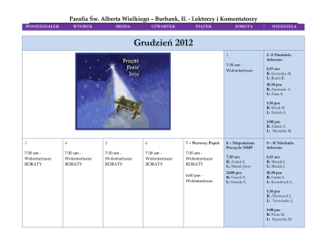 Parafia Św. Alberta Wielkiego – Burbank, IL - Lektorzy i Komentatorzy PONIEDZIAŁEK WTOREK ŚRODA CZWARTEK PIĄTEK SOBOTA NIEDZIELA Grudzień 2012 1 7:30 am Wolontariusze 2 –I Niedziela Adwentu 6:15 am K: Gromska M. L: Rusin R. 10:30 pm K: Zacherek A. L: Ziaja E. 1:30 pm K: Kwak B. L: Stekala S. 5:00 pm K: Zubek S. L: Maturlak M. 3 4 5 6 7 – Pierwszy Piątek 8 – Niepokalane Poczęcie NMP 9 – II Niedziela Adwentu 7:30 am Wolontariusze RORATY 7:30 am Wolontariusze RORATY 7:30 am Wolontariusze RORATY 7:30 am Wolontariusze RORATY 7:30 am Wolontariusze RORATY 7:30 am K: Zubek S. L: Mariak Jerzy 6:15 am K: Mariak J. L: Mariak J. 6:00 pm Wolontariusze 12:00 pm K: Ciszek E. L: Stekala S. 10:30 pm K: Ciesla S. L: Kowalczyk L. 1:30 pm K:. Pietraszek J. L: Troscianko J. 5:00 pm K: Fiuta M. L: Kawecka M. Parafia Św. Alberta Wielkiego – Burbank, IL - Lektorzy i Komentatorzy PONIEDZIAŁEK WTOREK ŚRODA CZWARTEK PIĄTEK SOBOTA NIEDZIELA 10 11 12 – Matki Bożej Guadalupe 13 – Św. Łucji REKOLEKCJE 14 – Św. Jana od Krzyża 15 16 – III Niedziela Adventu 7:30 am Wolontariusze RORATY 7:30 am Wolontariusze RORATY 7:30 am Wolontariusze RORATY 7:30 am - RORATY Wolontariusze 7:30 am - RORATY Wolontariusze 7:30 am - RORATY Wolontariusze 6:15 am K: Kowalczyk W. L: Rusin R. 12:00 pm L: Kowalczyk W. 12:00 pm L: Ciszek E. 12:00 pm L: Gromska M. 10:30 pm K/L: Polska Szkoła im. Ks. Posadzego 7:00 pm L: Mariak J. 7:00 pm L: Stekala S. 7:00 pm L: Zubek REKOLEKCJE ADWENTOWE 17 18 19 20 21 22 7:30 am Wolontariusze RORATY 7:30 am Wolontariusze RORATY 7:30 am Wolontariusze RORATY 7:30 am Wolontariusze RORATY 7:30 am Wolontariusze RORATY 7:30 am Wolontariusze RORATY 1:30 pm K:. Maturlak M. L: Polska Szkoła M. Rej. 5:00 pm K: Zacherek A L: Gromska M. 23 – IV Niedziela Adwentu 6:15 am K: Zubek S. L: Gromska M. 10:30 pm K: Ziaja E. L: Ciszek E 1:30 pm K:. Fiuta M. L: Gut S. 5:00 pm K: Pietraszek J. L: Ciesla S. Parafia Św. Alberta Wielkiego – Burbank, IL - Lektorzy i Komentatorzy PONIEDZIAŁEK 24 – Wigilia 7:30 am – RORATY Wolontariusze 8:00 pm – Pasterka dla dzieci K: E. Ciszek L: B. Kwak 10:00 pm - Pasterka dla dorosłych K: Zubek S. L: Kowalczyk W. 31 7:30 am Wolontariusze 7:00 pm Msza Św. Na zakończenie starego roku Wolontariusze WTOREK ŚRODA CZWARTEK PIĄTEK SOBOTA 25 – Boże Narodzenie 26 – Św. Szczepana 27 – Św. Jana 28 – Św. Młodzianków 29 6:15 am K: Zacherek A L: Rusin R. 7:30 am K/L: Wolontariusze 7:30 am Wolontariusze 7:30 am Wolontariusze 7:30 am Wolontariusze 10:30 pm K: Fiuta M. L: Kupiec L. 1:30 pm K:. Mariak J. L: Mariak. J. 5:00 pm K: Ciesla S. L: Kawecka M. 12:00 pm K: Maturlak M. L: Stekala S. 7:00 pm K: Zacherek A L: Pietraszek J. NIEDZIELA 30 – Niedziela Świętej Rodziny 6:15 am K: B. Kwak L: Rusin R. 10:30 pm K: Mariak J. L: Mariak J. 1:30 pm K:. Kupiec L. L: Stekala S. 5:00 pm K: Kowalczyk W. L: Zubek S. Parafia Św. Alberta Wielkiego – Burbank, IL - Lektorzy i Komentatorzy PONIEDZIAŁEK WTOREK ŚRODA CZWARTEK PIĄTEK SOBOTA NIEDZIELA Styczeń 2013 1 – Nowy Rok 2 3 4 – Pierwszy Piątek 5 6 – Trzech Króli 6:15 am K/L: Wolontariusze 7:30 am Wolontariusze 7:30 am Wolontariusze 7:30 am Wolontariusze 7:30 am Wolontariusze 6:15 am K: Gromska M. L: Zacherek A. 10:30 pm K: Ciszek E. L: Ziaja E 10:30 pm K: Kowalczyk W. L: Ciszek E. 6:00 pm Wolontariusze 1:30 pm K: Zubek S. L: Kwak B. 1:30 pm K:. Kupiec L. L: Gut S. 5:00 pm K:. Mariak J. L: Mariak. J 5:00 pm K: Fiuta M. L: Ciesla S. 7 8 9 10 11 12 7:30 am Wolontariusze 7:30 am Wolontariusze 7:30 am Wolontariusze 7:30 am Wolontariusze 7:30 am Wolontariusze 7:30 am Wolontariusze 13 – Niedziela Chrztu Pańskiego 6:15 am K: Kwak B. L: Rusin R. 10:30 pm K: Maturlak M. L: Kaczmarczyk L. 1:30 pm K:. Mariak J. L: Mariak. J 5:00 pm K: Pietraszek J. L: Stekala S. Parafia Św. Alberta Wielkiego – Burbank, IL - Lektorzy i Komentatorzy PONIEDZIAŁEK WTOREK ŚRODA CZWARTEK PIĄTEK SOBOTA 14 15 16 17 18 19 7:30 am Wolontariusze 7:30 am Wolontariusze 7:30 am Wolontariusze 7:30 am Wolontariusze 7:30 am Wolontariusze 7:30 am Wolontariusze NIEDZIELA 20 – II Niedziela Zwykła 6:15 am K:. Mariak J. L: Mariak. J 10:30 pm K/L: Polska Szkoła im. Ks. Posadzego 1:30 pm K:. Zacherek A. L: Polska Szkoła M. Rej. 5:00 pm K: Zubek S. L: Kawecka M. 21 22 23 24 25 26 7:30 am Wolontariusze 7:30 am Wolontariusze 7:30 am Wolontariusze 7:30 am Wolontariusze 7:30 am Wolontariusze 7:30 am Wolontariusze 27 – III Niedziela Zwykła 6:15 am K: Kowalczyk W. L: Kupiec L. 10:30 pm K: Ciszek E. L: Ziaja E. 1:30 pm K:. Fiuta M. L: Troscianko J. 5:00 pm K: Ciesla S L: Gromska M. Parafia Św. Alberta Wielkiego – Burbank, IL - Lektorzy i Komentatorzy PONIEDZIAŁEK WTOREK ŚRODA CZWARTEK 28 29 30 31 7:30 am Wolontariusze 7:30 am Wolontariusze 7:30 am Wolontariusze 7:30 am Wolontariusze PIĄTEK SOBOTA NIEDZIELA Drodzy Lektorzy! Z okazji nadchodzących Świąt Bożego Narodzenia składamy Wam moc najserdeczniejszych życzeń. Niech Boże Dziecię wpłynie na Wasze życie doczesne, byście mogli doskonale rozumieć czego pragnie od Was Bóg. Niech Boże Dziecię sprawi, byście kochali dobro i czuli tęsknotę, by dać z siebie wszystko dla Boga i najbliższych. Składając Wam najserdeczniejsze życzenia jednocześnie dziękujemy za Waszą postawę wiary, życzliwości, miłości oraz za wszelką pomoc w czytaniu podczas Mszy Świętej. Niech Boże Dziecię błogosławi Wam w Nowym Roku, a Matka Najświętsza otacza opieką i broni od złego. Wesołych Świąt! Ks. Michael Zoufal, Ks. Ryszard Czerniak Sch, Ks. Antoni Brooks Sch Parafia Św. Alberta Wielkiego – Burbank, IL - Lektorzy i Komentatorzy PONIEDZIAŁEK WTOREK ŚRODA CZWARTEK PIĄTEK SOBOTA NIEDZIELA Drodzy Lektorzy Prosimy aby każdy lektor zgłosił się w zakrystii przed Mszą Święta, aby ksiądz wiedział że jesteście obecni. Bycie lektorem, komentatorem, ministrem Eucharystii zobowiązuje nas do systematyczności w tych posłuchach. Przychodzimy 15 minut przed Mszą Święt
