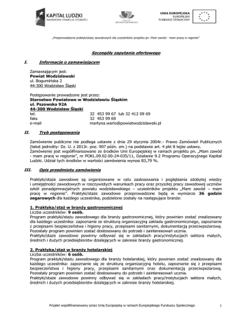 „Przeprowadzenie praktyk/staży zawodowych dla uczestników projektu pn. Mam zawód - mam pracę w regionie” Szczegóły zapytania ofertowego I. Informacje o zamawiającym Zamawiającym jest: Powiat Wodzisławski ul. Bogumińska 2 44-300 Wodzisław Śląski Postępowanie prowadzone jest przez: Starostwo Powiatowe w Wodzisławiu Śląskim ul. Pszowska 92A 44-300 Wodzisław Śląski tel. 32 453 99 67 lub 32 412 09 69 faks 32 453 99 69 e-mail [email protected] II. Tryb postępowania Zamówienie publiczne nie podlega ustawie z dnia 29 stycznia 2004r.- Prawo Zamówień Publicznych (tekst jednolity: Dz. U. z 2013r. poz. 907 późn. zm.) na podstawie art. 4 pkt 8 tejże ustawy. Zamówienie jest współfinansowane ze środków Unii Europejskiej w ramach projektu pn. „Mam zawód - mam pracę w regionie”, nr POKL.09.02.00-24-035/11, Działanie 9.2 Programu Operacyjnego Kapitał Ludzki. Udział tych środków w wartości zamówienia wynosi 83,79 %. III. Opis przedmiotu zamówienia Praktyki/staże zawodowe są organizowane w celu zastosowania i pogłębiania zdobytej wiedzy i umiejętności zawodowych w rzeczywistych warunkach pracy oraz przyszłej pracy zawodowej uczniów szkół ponadgimnazjalnych powiatu wodzisławskiego – uczestników projektu „Mam zawód – mam pracę w regionie”. Praktyki/staże zawodowe przeprowadzone będą w wymiarze 36 godzin zegarowych dla każdego uczestnika, podzielone zostały na następujące branże: 1. Praktyka/staż w branży gastronomicznej Liczba uczestników: 9 osób. Program praktyki/stażu zawodowego dla branży gastronomicznej, który powinien zostać zrealizowany dla każdego uczestnika: zapoznanie ze strukturą organizacyjną zakładu gastronomicznego, zapoznanie z przepisami bezpieczeństwa i higieny pracy, przepisami sanitarnymi, dokumentacją przeciwpożarową. Pozostały program powinien zostać dostosowany do potrzeb i zainteresowań ucznia. Praktyki/staże zawodowe powinny odbywać się w zakładach pracy/instytucjach sektora małych, średnich i dużych przedsiębiorstw działających w zakresie branży gastronomicznej. 2. Praktyka/staż w branży hotelarskiej Liczba uczestników: 6 osób. Program praktyki/stażu zawodowego dla branży hotelarskiej, który powinien zostać zrealizowany dla każdego uczestnika: zapoznanie się ze strukturą organizacyjną hotelu, zapoznanie się z przepisami bezpieczeństwa i higieny pracy, przepisami sanitarnymi oraz dokumentacją przeciwpożarową. Pozostały program powinien zostać dostosowany do potrzeb i zainteresowań ucznia. Praktyki/staże zawodowe powinny odbywać się w zakładach pracy/instytucjach sektora małych, średnich i dużych przedsiębiorstw działających w zakresie branży hotelarskiej. Projekt współfinansowany przez Unię Europejską w ramach Europejskiego Funduszu Społecznego 1 3. Praktyka/staż w branży ekonomiczno-administracyjnej Liczba uczestników: 7 osób. Program praktyki/stażu zawodowego dla branży ekonomiczno-administracyjnej, który powinien zostać zrealizowany: zapoznanie się ze strukturą organizacyjną jednostki, zakładu pracy/instytucji, zapoznanie się z przepisami bezpieczeństwa i higieny pracy, przepisami sanitarnymi oraz dokumentacją przeciwpożarową. Pozostały program powinien zostać dostosowany do potrzeb i zainteresowań ucznia. Praktyki/staże zawodowe powinny odbywać się w zakładach pracy/instytucjach sektora małych, średnich i dużych przedsiębiorstw działających w zakresie branży ekonomiczno-administracyjnej. 4. Praktyka/staż w branży informatycznej Liczba uczestników: 8 osób. Program praktyki/stażu zawodowego dla branży ekonomiczno-administracyjnej, który powinien zostać zrealizowany: zapoznanie się ze strukturą organizacyjną jednostki, zakładu pracy/instytucji, zapoznanie się z przepisami bezpieczeństwa i higieny pracy, przepisami sanitarnymi oraz dokumentacją przeciwpożarową. Pozostały program powinien zostać dostosowany do potrzeb i zainteresowań ucznia. Praktyki/staże zawodowe powinny odbywać się w zakładach pracy/instytucjach sektora małych, średnich i dużych przedsiębiorstw działających w zakresie branży informatycznej. 5. Praktyka/staż w branży handlowej Liczba uczestników: 3 osoby. Program praktyki/stażu zawodowego dla branży handlowej, który powinien zostać zrealizowany: zapoznanie się ze strukturą organizacyjną zakładu pracy, zapoznanie się z przepisami bezpieczeństwa i higieny pracy, przepisami sanitarnymi oraz dokumentacją przeciwpożarową. Pozostały program powinien zostać dostosowany do potrzeb i zainteresowań ucznia. Praktyki/staże zawodowe powinny odbywać się w zakładach pracy/instytucjach sektora małych, średnich i dużych przedsiębiorstw działających w zakresie branży handlowej. 6. Praktyka/staż w branży mechatronicznej Liczba uczestników: 6 osób. Program praktyki/stażu zawodowego dla branży mechatronicznej, który powinien zostać zrealizowany: zapoznanie się ze strukturą organizacyjną zakładu pracy, zapoznanie się z przepisami bezpieczeństwa i higieny pracy, przepisami sanitarnymi, dokumentacją przeciwpożarową oraz obsługa tokarki CNC. Pozostały program powinien zostać dostosowany do potrzeb i zainteresowań ucznia. Praktyki/staże zawodowe powinny odbywać się w zakładach pracy/instytucjach sektora małych, średnich i dużych przedsiębiorstw działających w zakresie branży mechatronicznej. 7. Praktyka/staż w branży budowlanej Liczba uczestników: 24 osoby. Program praktyki/stażu zawodowego dla branży budowanej, który powinien zostać zrealizowany: zapoznanie się ze strukturą organizacyjną zakładu pracy, zapoznanie się z przepisami bezpieczeństwa i higieny pracy, przepisami sanitarnymi, dokumentacją przeciwpożarową. Pozostały program powinien zostać dostosowany do potrzeb i zainteresowań ucznia, którzy zgłosi chęć poszerzenia wiedzy z projektowania, geodezji oraz robót wykończeniowych. Praktyki/staże zawo