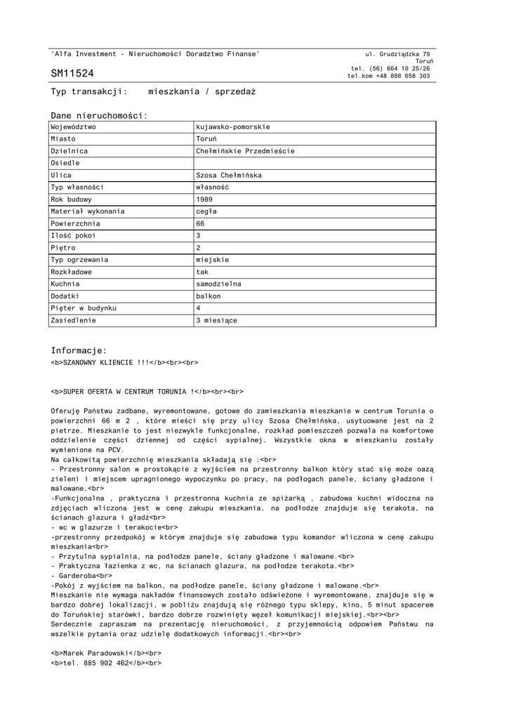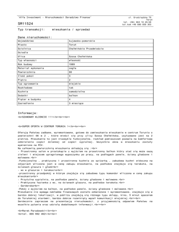'Alfa Investment - Nieruchomości Doradztwo Finanse' SM11524 Typ transakcji: ul. Grudziądzka 79 Toruń tel. (56) 664 10 25/26 tel.kom +48 888 658 303 mieszkania / sprzedaż Dane nieruchomości: Województwo kujawsko-pomorskie Miasto Toruń Dzielnica Chełmińskie Przedmieście Osiedle Ulica Szosa Chełmińska Typ własności własność Rok budowy 1989 Materiał wykonania cegła Powierzchnia 66 Ilość pokoi 3 Piętro 2 Typ ogrzewania miejskie Rozkładowe tak Kuchnia samodzielna Dodatki balkon Pięter w budynku 4 Zasiedlenie 3 miesiące Informacje: <b>SZANOWNY KLIENCIE !!!</b><br><br> <b>SUPER OFERTA W CENTRUM TORUNIA !</b><br><br> Oferuję Państwu zadbane, wyremontowane, gotowe do zamieszkania mieszkanie w centrum Torunia o powierzchni 66 m 2 , które mieści się przy ulicy Szosa Chełmińska, usytuowane jest na 2 pietrze. Mieszkanie to jest niezwykle funkcjonalne, rozkład pomieszczeń pozwala na komfortowe oddzielenie części dziennej od części sypialnej. Wszystkie okna w mieszkaniu zostały wymienione na PCV. Na całkowitą powierzchnię mieszkania składają się :<br> - Przestronny salon w prostokącie z wyjściem na przestronny balkon który stać się może oazą zieleni i miejscem upragnionego wypoczynku po pracy, na podłogach panele, ściany gładzone i malowane.<br> -Funkcjonalna , praktyczna i przestronna kuchnia ze spiżarką , zabudowa kuchni widoczna na zdjęciach wliczona jest w cenę zakupu mieszkania, na podłodze znajduje się terakota, na ścianach glazura i gładź<br> - wc w glazurze i terakocie<br> -przestronny przedpokój w którym znajduje się zabudowa typu komandor wliczona w cenę zakupu mieszkania<br> - Przytulna sypialnia, na podłodze panele, ściany gładzone i malowane.<br> - Praktyczna łazienka z wc, na ścianach glazura, na podłodze terakota.<br> - Garderoba<br> -Pokój z wyjściem na balkon, na podłodze panele, ściany gładzone i malowane.<br> Mieszkanie nie wymaga nakładów finansowych zostało odświeżone i wyremontowane, znajduje się w bardzo dobrej lokalizacji, w pobliżu znajdują się różnego typu sklepy, kino, 5 minut spacerem do Toruńskiej starówki, bardzo dobrze rozwinięty węzeł komunikacji miejskiej.<br><br> Serdecznie zapraszam na prezentację nieruchomości, z przyjemnością odpowiem Państwu na wszelkie pytania oraz udzielę dodatkowych informacji.<br><br> <b>Marek Paradowski</b><br> <b>tel. 885 902 462</b><br> <b>e-mail: [email protected]</b><br><br> Pośrednik odpowiedzialny zawodowo: Paweł Dawidowicz licencja pośrednika w obrocie nieruchomościami 7432 Andrzej Pamin licencja pośrednika w obrocie nieruchomościami 1145<br><br> UWAGA!!! BEZPŁATNIE POMAGAMY W UZYSKANIU KREDYTU NA ZAKUP NIERUCHOMOŚCI. WSPÓŁPRACUJEMY Z WIELOMA BANKAMI.<br><br> Treść niniejszego ogłoszenia nie stanowi oferty handlowej w rozumieniu przepisów Kodeksu Cywilnego.<br><br> Więcej ofert na www.alfa-investment.pl ZAPRASZAMY!!! Cena: 304 000 PLN Dokument wygenerowany ze strony www.alfa-investment.pl Strona 2