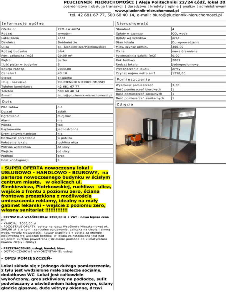 PŁUCIENNIK NIERUCHOMOŚCI | Aleja Politechniki 22/24 Łódź, lokal 201 pośrednictwo | obsługa transakcji | doradztwo | kredyty | opinie | analizy | administrowani _______________ www.pluciennik-nieruchomosci.pl _______________ tel. 42 681 67 77, 500 60 40 14, e-mail: [email protected] Informacje ogólne Nieruchomość Oferta nr PRO-LW-6624 Standard 4 Rodzaj wynajem Opłaty w czynszu CO, woda Lokalizacja Łódź Opłaty wg liczników prąd Dzielnica Śródmieście Stan lokalu Do wprowadzenia Ulica ok. Sienkiewicza/Piotrkowskiej Mies. czynsz admin. 360,00 Rodzaj budynku blok Okna nowe drewniane Pow. całkowita [m2] 29.00 m² Powierzchnia działki [m2] 0.00 Piętro parter Rok budowy 2009 Ilość pięter w budynku 5 Rodzaj lokalu jednopoziomowy Kaucja zabezp. 2000,00 Przeznaczenie lokalu Array Cena/m2 43.10 Czynsz najmu netto /m2 1250,00 Status aktualna Imię i nazwisko PŁUCIENNIK NIERUCHOMOŚCI Telefon komórkowy 42 681 67 77 Telefon E-mail 500 60 40 14 [email protected] Opis Plac zabaw nie Dojazd asfalt Ogrzewanie miejskie Alarm nie Winda tak Usytuowanie jednostronne Drzwi antywłamaniowe nie Możliwość parkowania w pobliżu Położenie lokalu ruchliwa ulica Witryna wystawowa od ulicy Wejście od ulicy Podłogi gres Ilość kondygnacji 5 - SUPER OFERTA nowoczesny lokal USŁUGOWO - HANDLOWO - BIUROWY, na parterze nowoczesnego budynku w ścisłym centrum miasta, w okolicach ul. Sienkiewicza, Piotrkowskiej, ruchliwa ulica, wejście z frontu z poziomu zero, ściana frontowa przeszklona z możliwością umieszczenia reklamy, idealny na mały gabinet lekarski - wejście z poziomu zero, własny sanitariat !!!!!!!!!!!!! - CZYNSZ DLA WŁAŚCICIELA: 1250,00 zł + VAT - nowa lepsza cena !!!! - KAUCJA: 2000,00 zł - POZOSTAŁE OPŁATY: opłaty na rzecz Wspólnoty Mieszkaniowej ok. 360,00 zł ( w tym : centralne ogrzewanie, zaliczka na ciepłą i zimną wodę, wywóz nieczystości, koszty wspólne ) + opłata za energię elektryczną wg wskazań licznika w lokalu zainstalowana jest nad wejściem kurtyna powietrzna ( działanie podobne do klimatyzatora nawiew ciepły i zimny) - PRZEZNACZENIE: usługi, handel, biuro - DOTYCHCZASOWE WYKORZYSTANIE: usługi - OPIS POMIESZCZEŃLokal składa się z jednego dużego pomieszczenia, z tyłu jest wydzielone małe zaplecze socjalne, dodatkowo WC Lokal jest całkowicie wykończony, gres szkliwiony na podłodze, sufit podwieszany z oświetleniem halogenowym, ściany gładzie gipsowe, duże witryny okienne, drzwi Pomieszczenia Wysokość pomieszczeń 3,50 Ilość pomieszczeń biurowych 1 Ilość pomieszczeń socjalnych 1 Ilość pomieszczeń sanitarnych 1 Zdjęcia wejściowe z ulicy przeszklone, dodatkowo drzwi z klatki schodowej - SALA GŁÓWNA ok. 25 m, podłoga gres szkliwiony , ściany gładzie , osiwietlenie halogenowe - WC OK. 2 m, umywalka z szafką, sedes, podłoga gres szkliwiony, ściany gladzie i glazura - ZAPLECZE ok. 2 m oddzielone od sali głównej ścianką z luksferów - RODZAJ I WYKOŃCZENIE BUDYNKU: elegancki budynek, na parterze działalność gospodarcza, na wyższych kondygnacjach eleganckie mieszkania - WEJŚCIE: 2 wejścia jedno z ulicy, drugie z klatki - OKNA/DRZWI: PCV na ulicę, drzwi przeszklone wejście z ulicy - OŚWIETLENIE: halogenowe - MEDIA/INSTALACJE: miejskie, co miejskie, dodatkowo kurtyna powietrzna nad wejściem - ZABEZPIECZENIA/SYSTEMY ALARMOWE/DOZóR: całodobowa ochrona budynku - PARKING/WJAZD DLA SAMOCHODóW: możliwe parkowanie na płatnym parkingu w pobliżu budynku - UWAGA! Oferty prezentowane na naszych stronach nie stanowią oferty w rozumieniu Kodeksu Cywilnego, a są jedynie zaproszeniem do rokowań. Podane dane mają charakter wyłącznie informacyjny i mogą odbiegać od stanu faktycznego. Opis obiektu został sporządzony na podstawie informacji przekazanych przez Oferującego. Oferta może być już nieaktualna. Prosimy o telefon. Klientom chcemy poświęcać odpowiednią ilość czasu, prosimy o umawianie spotkań. PŁUCIENNIK NIERUCHOMOŚCI | Aleja Politechniki 22/24 Łódź, lokal 201 pośrednictwo | obsługa transakcji | doradztwo | kredyty | opinie | analizy | administrowani _______________ www.pluciennik-nieruchomosci.pl _______________ tel. 42 681 67 77, 500 60 40 14, [email protected]