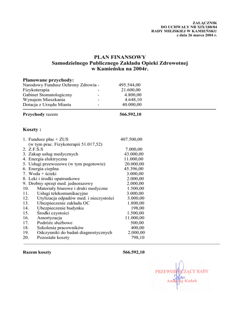 ZAŁĄCZNIK DO UCHWAŁY NR XIX/188/04 RADY MIEJSKIEJ W KAMIEŃSKU z dnia 26 marca 2004 r. PLAN FINANSOWY Samodzielnego Publicznego Zakładu Opieki Zdrowotnej w Kamieńsku na 2004r. Planowane przychody: Narodowy Fundusz Ochrony Zdrowia Fizykoterapia Gabinet Stomatologiczny Wynajem Mieszkania Dotacja z Urzędu Miasta - 495.544,00 21.600,00 4.800,00 4.648,10 40.000,00 Przychody razem 566.592,10 Koszty : 1. Fundusz płac + ZUS (w tym prac. Fizykoterapii 51.017,52) 2. Z.F.Ś.S 3. Zakup usług medycznych 4. Energia elektryczna 5. Usługi przewozowe (w tym pogotowie) 6. Energia cieplna 7. Woda + ścieki 8. Leki i środki opatrunkowe 9. Drobny sprzęt med. jednorazowy 10. Materiały biurowe i druki medyczne 11. Usługi telekomunikacyjne 12. Utylizacja odpadów med. i nieczystości 13. Ubezpieczenie zakładu OC 14. Ubezpieczenie budynku 15. Środki czystości 16. Amortyzacja 17. PodróŜe słuŜbowe 18. Szkolenia pracowników 19. Odczynniki do badań diagnostycznych 20. Pozostałe koszty Razem koszty 407.500,00 7.000,00 43.000,00 11.000,00 20.000,00 45.396,00 3.000,00 2.000,00 2.000,00 1.500,00 3.000,00 3.000,00 1.800,00 198,00 1.500,00 11.000,00 500,00 400,00 2.000,00 798,10 566.592,10 Rozliczenie dotacji otrzymanej z Urzędu Miasta w 2003 r. Kwota przekazanej dotacji 40.000,00 1 Wynagrodzenie pracowników 42.388,33 Faktyczne poniesione koszty Fizykoterapii w 2003 r. 1. Wynagrodzenia pracowników 42.388,33 2. Projekt zmiany sposobu uŜytkowania Fizykoterapii 2.440,00 3. Zakupione materiały do remontu 6.134,00 4. Energia elektryczna 320,00 Razem 51.282,33 Planowane koszty związane z Fizykoterapią w 2004 r. 1. Wynagrodzenie 2. Naprawa Lasera 3. Materiały i koszt wykonania remontu 4. Energia Elektryczna Razem 51.017,52 1. 464,00 19.000,00 400,00 75.481,52
