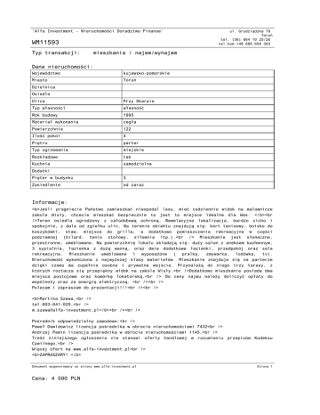 'Alfa Investment - Nieruchomości Doradztwo Finanse' WM11593 Typ transakcji: ul. Grudziądzka 79 Toruń tel. (56) 664 10 25/26 tel.kom +48 888 658 303 mieszkania / najem/wynajem Dane nieruchomości: Województwo kujawsko-pomorskie Miasto Toruń Dzielnica Osiedle Ulica Przy Skarpie Typ własności własność Rok budowy 1995 Materiał wykonania cegła Powierzchnia 122 Ilość pokoi 4 Piętro parter Typ ogrzewania miejskie Rozkładowe tak Kuchnia samodzielna Dodatki Pięter w budynku 3 Zasiedlenie od zaraz Informacje: <b>Jeśli pragniecie Państwo zamieszkać nieopodal lasu, mieć codziennie widok na malownicze zakole Wisły, chcecie mieszkać bezpiecznie to jest to miejsce idealne dla Was. </b><br />Teren osiedla ogrodzony z całodobową ochroną. Rewelacyjna lokalizacja, bardzo cicho i spokojnie, z dala od zgiełku ulic. Na terenie obiektu znajdują się: kort tenisowy, boisko do koszykówki, staw, miejsce do grilla, a dodatkowo pomieszczenia rekreacyjne w części podziemnej (bilard, tenis stołowy, siłownia itp.).<br /> Mieszkanie jest słoneczne, przestronne, umeblowane. Na powierzchnię lokalu składają się: duży salon z aneksem kuchennym, 3 sypialnie, łazienka z dużą wanną, oraz dwie dodatkowe łazienki, przedpokój oraz sala rekreacyjna. Mieszkanie umeblowane i wyposażone ( pralka, zmywarka, lodówka, tv). Nieruchomość wykończona z najwyższej klasy materiałów. Mieszkanie znajduje się na parterze dzięki czemu ma zupełnie osobne i prywatne wejście. Przynależą do niego trzy tarasy, z których roztacza się przepiękny widok na zakole Wisły.<br />Dodatkowo mieszkanie posiada dwa miejsca postojowe oraz komórkę lokatorską.<br /> Do ceny najmu należy doliczyć opłaty do wspólnoty oraz za energię elektryczną. <br /><br /> Polecam i zapraszam do prezentacji!!!<br /><br /> <b>Martika Szewa,<br /> tel.603-641-025,<br /> [email protected]</b><br /><br /> Pośrednik odpowiedzialny zawodowo:<br /> Paweł Dawidowicz licencja pośrednika w obrocie nieruchomościami 7432<br /> Andrzej Pamin licencja pośrednika w obrocie nieruchomościami 1145.<br /> Treść niniejszego ogłoszenia nie stanowi oferty handlowej w rozumieniu przepisów Kodeksu Cywilnego.<br /> Więcej ofert na www.alfa-investment.pl<br /> <b>ZAPRASZAMY! </b> Dokument wygenerowany ze strony www.alfa-investment.pl Cena: 4 500 PLN Strona 1