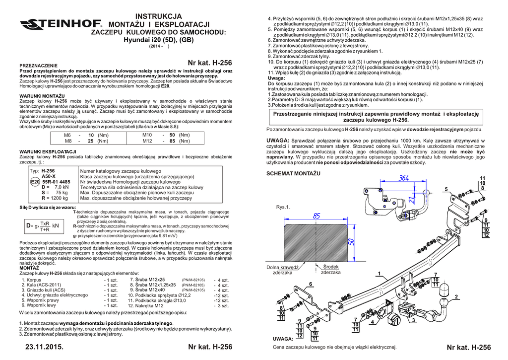 ZACZEPU KULOWEGO DO SAMOCHODU: Hyundai i20 (5D), (GB) (2014 - ®) Nr kat. H-256 PRZEZNACZENIE Przed przyst¹pieniem do monta¿u zaczepu kulowego nale¿y sprawdziæ w instrukcji obs³ugi oraz dowodzie rejestracyjnym pojazdu, czy samochód przystosowany jest do holowania przyczepy. Zaczep kulowy H-256 jest przeznaczony do holowania przyczepy. Zaczep ten posiada aktualne Œwiadectwo Homologacji uprawniaj¹ce do oznaczenia wyrobu znakiem homologacji E20. WARUNKI MONTA¯U Zaczep kulowy H-256 mo¿e byæ u¿ywany i eksploatowany w samochodzie o w³aœciwym stanie technicznym elementów nadwozia. W przypadku wystêpowania masy izolacyjnej w miejscach przylegania elementów zaczepu nale¿y j¹ usun¹æ. Zaczep musi byæ zamontowany i eksploatowany w samochodzie zgodnie z niniejsz¹ instrukcj¹. Wszystkie œruby i nakrêtki wystêpuj¹ce w zaczepie kulowym musz¹ byæ dokrêcone odpowiednim momentem obrotowym (Mo) o wartoœciach podanych w poni¿szej tabeli (dla œrub w klasie 8.8): M6 M8 - 10 (Nm) 25 (Nm) M10 M12 - 50 (Nm) 85 (Nm) WARUNKI EKSPLOATACJI Zaczep kulowy H-256 posiada tabliczkê znamionow¹ okreœlaj¹c¹ prawid³owe i bezpieczne obci¹¿enie zaczepu, tj. : Typ: H-256 A50-X E20 55R-01 4485 D = 7,0 kN S = 75 kg R = 1200 kg Numer katalogowy zaczepu kulowego Klasa zaczepu kulowego (urz¹dzenia sprzêgaj¹cego) Nr œwiadectwa Homologacji zaczepu kulowego Teoretyczna si³a odniesienia dzia³aj¹ca na zaczep kulowy Max. Dopuszczalne obci¹¿enie pionowe kuli zaczepu Max. dopuszczalne obci¹¿enie holowanej przyczepy Przestrzeganie niniejszej instrukcji zapewnia prawid³owy monta¿ i eksploatacjê zaczepu kulowego H-256. Po zamontowaniu zaczepu kulowego H-256 nale¿y uzyskaæ wpis w dowodzie rejestracyjnym pojazdu. UWAGA: Sprawdzaæ po³¹czenia œrubowe po przejechaniu 1000 km. Kulê zawsze utrzymywaæ w czystoœci i smarowaæ smarem sta³ym. Stosowaæ os³onê kuli. Wszystkie uszkodzenia mechaniczne zaczepu kulowego wykluczaj¹ dalsz¹ jego eksploatacjê. Uszkodzony zaczep nie mo¿e byæ naprawiany. W przypadku nie przestrzegania opisanego sposobu monta¿u lub niew³aœciwego jego u¿ytkowania producent nie ponosi odpowiedzialnoœci za powsta³e szkody. SCHEMAT MONTA¯U 11 10 8 5 T-technicznie dopuszczalna maksymalna masa, w tonach, pojazdu ci¹gn¹cego (tak¿e ci¹gników holuj¹cych) ³¹cznie, jeœli wystêpuje, z obci¹¿eniem pionowym przyczepy z osi¹ centraln¹. R-technicznie dopuszczalna maksymalna masa, w tonach, przyczepy samochodowej z dyszlem ruchomym w p³aszczyŸnie pionowej lub naczepy. g- przyspieszenie ziemskie (przyjmowane jako 9,81 m/s2) W celu zamontowania zaczepu kulowego nale¿y przestrzegaæ poni¿szego opisu: 85 Œrodek zderzaka Dolna krawêdŸ zderzaka 1 7 10 11 6 2 8 10 11 1. Monta¿ zaczepu wymaga demonta¿u i podcinania zderzaka tylnego. 2. Zdemontowaæ zderzak tylny, oraz uchwyty zderzaka (œrodkowy nie bêdzie ponownie wykorzystany). 3. Zdemontowaæ plastikow¹ os³onê z lewej strony. UWAGA: Nr kat. H-256 9 11 10 12 50 Podczas eksploatacji poszczególne elementy zaczepu kulowego powinny byæ utrzymane w nale¿ytym stanie technicznym i zabezpieczone przed dzia³aniem korozji. W czasie holowania przyczepa musi byæ z³¹czona dodatkowym elastycznym z³¹czem o odpowiedniej wytrzyma³oœci (linka, ³añcuch). W czasie eksploatacji zaczepu kulowego nale¿y okresowo sprawdzaæ po³¹czenia œrubowe, a w przypadku poluzowania nakrêtek nale¿y je dokrêciæ. MONTA¯ Zaczep kulowy H-256 sk³ada siê z nastêpuj¹cych elementów: 7. Œruba M12x25 (PN/M-82105) 1. Korpus - 1 szt. - 4 szt. 8. Œruba M12x1,25x35 (PN/M-82105) 2. Kula (ACS-2011) - 1 szt. - 4 szt. 9. Œruba M12x40 (PN/M-82105) 3. Gniazdo kuli (ACS) - 1 szt. - 4 szt. 4. Uchwyt gniazda elektrycznego 10. Podk³adka sprê¿ysta Ø12,2 - 1 szt. -12 szt. 5. Wspornik prawy - 1 szt. -12 szt. 11. Podk³adka okr¹g³a Ø13,0 6. Wspornik lewy - 1 szt. - 3 szt. 12. Nakrêtka M12 23.11.2015. 364 Rys.1. Si³ê D wylicza siê ze wzoru: D= gx TxR kN T+R 4. Przy³o¿yæ wsporniki (5, 6) do zewnêtrznych stron pod³u¿nic i skrêciæ œrubami M12x1,25x35 (8) wraz z podk³adkami sprê¿ystymi Ø12,2 (10) i podk³adkami okr¹g³ymi Ø13,0 (11). 5. Pomiêdzy zamontowane wsporniki (5, 6) wsun¹æ korpus (1) i skrêciæ œrubami M12x40 (9) wraz z podk³adkami okr¹g³ymi Ø13,0 (11), podk³¹dkami sprê¿ystymi Ø12,2 (10) i nakrêtkami M12 (12). 6. Zamontowaæ zewnêtrzne uchwyty zderzaka. 7. Zamontowaæ plastikow¹ os³onê z lewej strony. 8. Wykonaæ podciêcie zderzaka zgodnie z rysunkiem 1. 9. Zamontowaæ zderzak tylny. 10. Do korpusu (1) dokrêciæ gniazdo kuli (3) i uchwyt gniazda elektrycznego (4) œrubami M12x25 (7) wraz z podk³adkami sprê¿ystymi Ø12,2 (10) i podk³adkami okr¹g³ymi Ø13,0 (11). 11. Wpi¹æ kulê (2) do gniazda (3) zgodnie z za³¹czon¹ instrukcj¹. Uwaga: Do korpusu zaczepu (1) mo¿e byæ zamontowana kula (2) o innej konstrukcji ni¿ podano w niniejszej instrukcji pod warunkiem, ¿e: 1.Zastosowana kula posiada tabliczkê znamionow¹ z numerem homologacji. 2.Parametry D i S maj¹ wartoœæ wiêksz¹ lub równ¹ od wartoœci korpusu (1). 3.Po³o¿enia œrodka kuli jest zgodne z rysunkiem. 21 INSTRUKCJA MONTA¯U I EKSPLOATACJI 9 11 10 12 9 10 11 7 10 11 4 Cena zaczepu kulowego nie obejmuje wi¹zki elektrycznej. 3 Nr kat. H-256 TOWBAR FOR Hyundai i20 (5D), (GB) (2014 - ®) FITTING AND OPERATION MANUAL Cat. No.H-256 DESTINATION Before the towbar assembly please refer to the manual and vehicle registration document whether car is adjusted for towing a trailer. Towbar H-256 is designed for towing a trailer. This towbar has a current certification of approval authorizing the product with E20 certification sign. FITTING CONDITIONS Towbar H-256 can be used and operated in a car with proper technical conditions of body elements. Those parts cannot be mechanically damaged. Remove the insulating mass of the sealing from surface mounting. The towbar has to be installed and operated in a car according to this ins