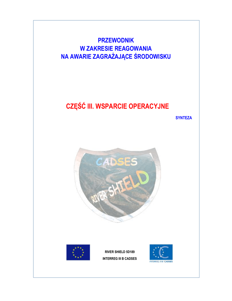 PRZEWODNIK W ZAKRESIE REAGOWANIA NA AWARIE ZAGRAŻAJĄCE ŚRODOWISKU CZĘŚĆ III. WSPARCIE OPERACYJNE SYNTEZA RIVER SHIELD 5D189 INTERREG III B CADSES SPIS TREŚCI Str. 1. PRZEDMOWA ..................................................................................................................3 2. TYMCZASOWE MAGAZYNOWANIE ODPADÓW.......................................................3 3. GOSPODAROWANIE ODPADAMI POAWARYJNYMI................................................4 4. SZKOLENIA W ZAKRESIE REAGOWANIA..................................................................5 5. ZAGADNIENIA OCHRONY ZDROWIA I BEZPIECZENSTWA....................................6 6. WSPARCIE ADMINISTRACYJNE ..................................................................................8 1. PRZEDMOWA Niniejsza synteza Przewodnika w zakresie reagowania na awarie zagrażające środowisku została opracowana zgodnie z harmonogramem projektu RIVER SHIELD, który jest współfinansowany w ramach inicjatywy wspólnotowej INTERREG III B Program CADSES, na podstawie umowy nr 5D189. Celem projektu RIVER SHIELD ochrona rzek przed zanieczyszczeniami spowodowanymi przez awarie przemysłowe. Projekt jest realizowany w wyniku współpracy instytucji związanych z ochroną środowiska z Grecji, Węgier, Polski, Czech, Słowenii i Bułgarii. Podstawowym zadaniem jednostki RIVER SHIELD jest wymiana doświadczeń, transfer „know-how”, a także działalność informacyjno-popularyzatorska. W ramach projektu zaplanowano opracowanie przewodników dobrej praktyki i raportów końcowych. Główne zadania projektu i dokumenty sprawozdawcze upowszechniane są na stronie Internetowej www.rivershield.org1. Przygotowano trzy przewodniki2 w zakresie reagowania na awarie w kontekście ochrony płynących wód powierzchniowych. Pierwszy z nich odnosi się do zagadnień gotowości i reagowania, drugi dotyczy technik kontroli zanieczyszczeń, a trzeci – wsparcia operacyjnego. Wspomniane wyżej trzy przewodniki zawierają ogólne wytyczne dla służb publicznych i jednostek bezpieczeństwa włączonych w proces reagowania na awarie zagrażające środowisku. Zostały one opracowane przez partnerów greckich, dlatego też odnoszą się przede wszystkim do greckich uwarunkowań reagowania na wypadek awarii. Jednakże warunki w innych państwach członkowskich UE nie różnią się w sposób znaczący od warunków greckich, stąd przedstawione w przewodniku uwagi i rekomendacje znajdują zastosowanie także w tych krajach. Wszystko, co zaprezentowano w przewodnikach i we wszelkich dokumentach sprawozdawczych projektu odzwierciedla opinie partnerów projektu RIVER SHIELD. W żadnym wypadku nie są to opinie Komisji Europejskiej, która tylko współfinansuje projekt w ramach inicjatywy INTERREG IIIB CADSES. 2. TYMCZASOWE MAGAZYNOWANIE ODPADÓW Awaria przemysłowa może prowadzić do wycieku niebezpiecznych substancji chemicznych do środowiska. Z tego powodu konieczne jest tymczasowe magazynowanie odpadów poawaryjnych i zanieczyszczeń środowiska. Wybór lokalizacji obszaru do tymczasowego magazynowania zależy od ukształtowania terenu, od możliwości dostępu środków transportu, a także od statusu obszaru ze względu na wymagania ochrony środowiska. Sposób tymczasowego magazynowania odpadów zależy od ilości i rodzaju zanieczyszczenia, czasu tymczasowego magazynowania i obecności innych zanieczyszczonych materiałów. 1 Dokumentacja głównie części polskiej projektu dostępna jest także na portalu Internetowym Instytutu Ochrony Środowiska (http://www.ios.edu.pl/pol/river). 2 Dostępne jedynie w języku greckim. 3 Tymczasowe osadniki gnilne, duże plastikowe worki, beczki lub samochody ciężarowe mogą być wykorzystane do potrzeb tymczasowego magazynowania odpadów poawaryjnych. W przypadku, gdy wyciek substancji ropopochodnych zanieczyszcza odbiornik wodny lub gdy zbierany materiał musi być transportowany drogami wodnymi, zaleca się użycie jednostek pływających. Typowe jednostki pływające wykorzystywane do tymczasowego magazynowania to małe łodzie (np. typu John Boats), o pojemności równej 2 m3. Wyposażone są one w plastikowe pokrywy. 3. GOSPODAROWANIE ODPADAMI POAWARYJNYMI W celu ograniczenia ilości odpadów powstających w trakcie reagowania na awarię przemysłową, należy wziąć pod uwagę co następuje: • użycie środków reagowania powinno być wyważone i ostrożne, • sprzęt i środki zwalczania wycieków powinny być odpowiednio dostosowane do rodzaju zdarzenia z możliwością ich wielokrotnego użycia, • zastosowanie nieodzyskiwalnych materiałów i detergentów powinno być uzasadnione, • zaleca się unieszkodliwianie odpadów in-situ. W przypadku odpadów stałych zaleca się przestrzeganie następujących zasad: • nie mieszać odpadów olejowych z innymi, • obszar, na którym są unieszkodliwiane lub są przechowywane odpady ropopochodnych musi być chroniony przez zastosowanie plastikowych pokryć, • w przypadku, gdy gromadzona jest zanieczyszczona gleba, to zbierane w tym samym czasie ilości substancji zanieczyszczającej powinny być tak małe, jak to możliwe, • konieczne jest zidentyfikowanie źródła odpadów, przed ich ostatecznym unieszkodliwieniem. W przypadku odpadów ciekłych zaleca się: • unieszkodliwienie całkowitej ilość substancji chemicznej zmagazynowanej na jednostkach pływających, • zabezpieczenie całej jednostki pływającej w celu uniknięcia akumulacji wody deszczowej, • preferowanie biodegradowalnych detergentów chemicznych, • racjonalne korzystanie z wody do mycia zanieczyszczonych materiałów, • trzymanie bliżej nieokreślonych odpadów oddzielnie, aż do momentu ich zidentyfikowania. Procedury operacyjne • Gromadzenie Separację odpadów przeprowadza się u źródła. Stałe odpady ropopochodnych są gromadzone w przezroczystych plastikowych workach w celu możliwości sprawdzenia ich zawartości. Nieropopochodne odpady 