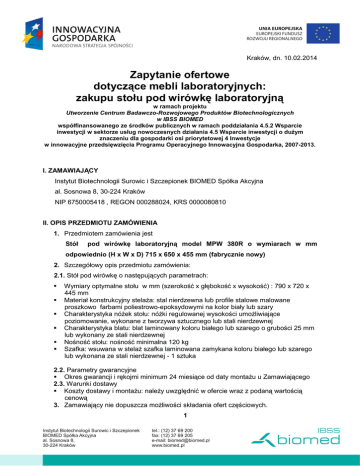 Kraków, dn. 10.02.2014 Zapytanie ofertowe dotyczące mebli laboratoryjnych: zakupu stołu pod wirówkę laboratoryjną w ramach projektu Utworzenie Centrum Badawczo-Rozwojowego Produktów Biotechnologicznych w IBSS BIOMED współfinansowanego ze środków publicznych w ramach poddziałania 4.5.2 Wsparcie inwestycji w sektorze usług nowoczesnych działania 4.5 Wsparcie inwestycji o duŜym znaczeniu dla gospodarki osi priorytetowej 4 Inwestycje w innowacyjne przedsięwzięcia Programu Operacyjnego Innowacyjna Gospodarka, 2007-2013. I. ZAMAWIAJĄCY Instytut Biotechnologii Surowic i Szczepionek BIOMED Spółka Akcyjna al. Sosnowa 8, 30-224 Kraków NIP 6750005418 , REGON 000288024, KRS 0000080810 II. OPIS PRZEDMIOTU ZAMÓWIENIA 1. Przedmiotem zamówienia jest Stół pod wirówkę laboratoryjną model MPW 380R o wymiarach w mm odpowiednio (H x W x D) 715 x 650 x 455 mm (fabrycznie nowy) 2. Szczegółowy opis przedmiotu zamówienia: 2.1. Stół pod wirówkę o następujących parametrach: Wymiary optymalne stołu w mm (szerokość x głębokość x wysokość) : 790 x 720 x 445 mm Materiał konstrukcyjny stelaŜa: stal nierdzewna lub profile stalowe malowane proszkowo farbami poliestrowo-epoksydowymi na kolor biały lub szary Charakterystyka nóŜek stołu: nóŜki regulowanej wysokości umoŜliwiające poziomowanie, wykonane z tworzywa sztucznego lub stali nierdzewnej Charakterystyka blatu: blat laminowany koloru białego lub szarego o grubości 25 mm lub wykonany ze stali nierdzewnej Nośność stołu: nośność minimalna 120 kg Szafka: wsuwana w stelaŜ szafka laminowana zamykana koloru białego lub szarego lub wykonana ze stali nierdzewnej - 1 sztuka 2.2. Parametry gwarancyjne Okres gwarancji i rękojmi minimum 24 miesiące od daty montaŜu u Zamawiającego 2.3. Warunki dostawy Koszty dostawy i montaŜu: naleŜy uwzględnić w ofercie wraz z podaną wartością cenową 3. Zamawiający nie dopuszcza moŜliwości składania ofert częściowych. 1 4. Zamawiający dopuszcza moŜliwości powierzenia części lub całości zamówienia podwykonawcom. III. TERMIN WYKONANIA ZAMÓWIENIA Termin wykonania przedmiotu zamówienia: nie dłuŜej niŜ 2 tygodnie. IV. OPIS SPOSOBU PRZYGOTOWANIA OFERTY Oferta powinna być: - opatrzona pieczątką firmową, - posiadać datę sporządzenia, - zawierać adres lub siedzibę oferenta, numer telefonu, numer NIP, - podpisana czytelnie przez wykonawcę. V. MIEJSCE ORAZ TERMIN SKŁADANIA OFERT 1. Oferta powinna być złoŜona do dnia 14.02.2014 za pośrednictwem: poczty elektronicznej na adres: [email protected], faksem na nr: +12 37 69 205, poczty, kuriera lub teŜ dostarczona osobiście na adres: al. Sosnowa 8, 30-224 Kraków do dnia 14.02.2014 wraz z załączoną: a) kopią wypisu z rejestru przedsiębiorców lub zaświadczenia z ewidencji działalności gospodarczej, wystawione w dacie nie wcześniejszej niŜ sześć miesięcy przed datą złoŜenia oferty. 2. Ocena ofert zostanie dokonana w dniu 17.02.2014, a wyniki i wybór najkorzystniejszej oferty zostanie ogłoszony w siedzibie Zamawiającego oraz na stronie internetowej pod adresem www.biomed.pl. 3. Oferty złoŜone po terminie nie będą rozpatrywane 4. Oferent moŜe przed upływem terminu składania ofert zmienić lub wycofać swoją ofertę. 5. W toku badania i oceny ofert Zamawiający moŜe Ŝądać od oferentów wyjaśnień dotyczących treści złoŜonych ofert. 6. Zapytanie ofertowe zamieszczono na stronie: www.biomed.pl. VI. KRYTERIA OCENY OFERT Zamawiający dokona oceny waŜnych ofert na podstawie następujących kryteriów: 1. cena – 90% 2. czas realizacji zamówienia – 10%. 2 VII. INFORMACJE DOTYCZĄCE WYBORU NAJKORZYSTNIEJSZEJ OFERTY O wyborze najkorzystniejszej oferty Zamawiający zawiadomi oferentów pośrednictwem strony internetowej znajdującej się pod adresem www.biomed.pl VIII. DODATKOWE INFORMACJE Dodatkowych informacji udziela p. Dagmara Ochwat pod numerem telefonu +12 37 69 248 oraz adresem email: [email protected] IX. ZAŁĄCZNIKI Nie dotyczy 3 za