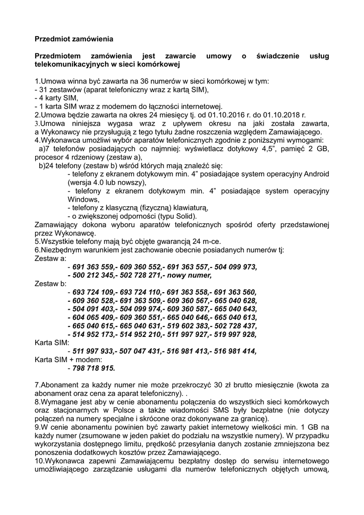 Przedmiot zamówienia Przedmiotem zamówienia jest zawarcie telekomunikacyjnych w sieci komórkowej umowy o świadczenie usług 1.Umowa winna być zawarta na 36 numerów w sieci komórkowej w tym: - 31 zestawów (aparat telefoniczny wraz z kartą SIM), - 4 karty SIM, - 1 karta SIM wraz z modemem do łączności internetowej. 2.Umowa będzie zawarta na okres 24 miesięcy tj. od 01.10.2016 r. do 01.10.2018 r. 3.Umowa niniejsza wygasa wraz z upływem okresu na jaki została zawarta, a Wykonawcy nie przysługują z tego tytułu żadne roszczenia względem Zamawiającego. 4.Wykonawca umożliwi wybór aparatów telefonicznych zgodnie z poniższymi wymogami: a)7 telefonów posiadających co najmniej: wyświetlacz dotykowy 4,5”, pamięć 2 GB, procesor 4 rdzeniowy (zestaw a), b)24 telefony (zestaw b) wśród których mają znaleźć się: - telefony z ekranem dotykowym min. 4” posiadające system operacyjny Android (wersja 4.0 lub nowszy), - telefony z ekranem dotykowym min. 4” posiadające system operacyjny Windows, - telefony z klasyczną (fizyczną) klawiaturą, - o zwiększonej odporności (typu Solid). Zamawiający dokona wyboru aparatów telefonicznych spośród oferty przedstawionej przez Wykonawcę. 5.Wszystkie telefony mają być objęte gwarancją 24 m-ce. 6.Niezbędnym warunkiem jest zachowanie obecnie posiadanych numerów tj: Zestaw a: - 691 363 559,- 609 360 552,- 691 363 557,- 504 099 973, - 500 212 345,- 502 728 271,- nowy numer, Zestaw b: - 693 724 109,- 693 724 110,- 691 363 558,- 691 363 560, - 609 360 528,- 691 363 509,- 609 360 567,- 665 040 628, - 504 091 403,- 504 099 974,- 609 360 587,- 665 040 643, - 604 065 409,- 609 360 551,- 665 040 646,- 665 040 613, - 665 040 615,- 665 040 631,- 519 602 383,- 502 728 437, - 514 952 173,- 514 952 210,- 511 997 927,- 519 997 928, Karta SIM: - 511 997 933,- 507 047 431,- 516 981 413,- 516 981 414, Karta SIM + modem: - 798 718 915. 7.Abonament za każdy numer nie może przekroczyć 30 zł brutto miesięcznie (kwota za abonament oraz cena za aparat telefoniczny). . 8.Wymagane jest aby w cenie abonamentu połączenia do wszystkich sieci komórkowych oraz stacjonarnych w Polsce a także wiadomości SMS były bezpłatne (nie dotyczy połączeń na numery specjalne i skrócone oraz dokonywane za granicę). 9.W cenie abonamentu powinien być zawarty pakiet internetowy wielkości min. 1 GB na każdy numer (zsumowane w jeden pakiet do podziału na wszystkie numery). W przypadku wykorzystania dostępnego limitu, prędkość przesyłania danych zostanie zmniejszona bez ponoszenia dodatkowych kosztów przez Zamawiającego. 10.Wykonawca zapewni Zamawiającemu bezpłatny dostęp do serwisu internetowego umożliwiającego zarządzanie usługami dla numerów telefonicznych objętych umową, dostęp do dokumentów finansowych itp. 11.Wykonawca zobowiązuje się do realizacji przedmiotu zamówienia w sposób ciągły tj. przez 24 godziny na dobę, przy zachowaniu najwyższej jakości usług, na warunkach opisanych i zawartych w ofercie, zgodnie z obowiązującym prawem, w tym zgodnie z ustawą z dnia 16 lipca 2004 r. Prawo telekomunikacyjne. Wykonawca będzie świadczył usługi telekomunikacyjne zgodnie z regulaminem świadczenia usług telekomunikacyjnych stanowiącym załącznik do umowy, przy czym postanowienia regulaminu niezgodne z niniejszymi postanowieniami, ofertą nie wiążą stron umowy i tym samym nie mają zastosowania. Przedmiot umowy – tożsamy z przedmiotem zamówienia (opis – oferta) Wykonawca zobowiązuje się do rozpoczęcia świadczenia usług telekomunikacyjnych objętych niniejszym zamówieniem publicznym z dniem udzielenia zamówienia (zawarcia umowy). 12.W przypadku zmiany operatora Wykonawca dokona przeniesienia numerów w sposób natychmiastowy. Zmiana operatora nie może mieć wpływu na możliwość wykonywania połączeń. 13. Przy zawieraniu umowy winne być zawarte wszystkie w/w wymagania. ISTOTNE POSTANOWIENIA UMOWY dot. świadczenia usług telekomunikacyjnych 1) Wykonawca zobowiązuje się do realizacji przedmiotu zamówienia w sposób ciągły tj. przez 24 godziny na dobę, przy zachowaniu najwyższej jakości usług, na warunkach opisanych i zawartych w ofercie, zgodnie z obowiązującym prawem, w tym zgodnie z ustawą z dnia 16 lipca 2004 r. Prawo telekomunikacyjne. Wykonawca będzie świadczył usługi telekomunikacyjne zgodnie z regulaminem świadczenia usług telekomunikacyjnych stanowiącym załącznik do umowy, przy czym postanowienia regulaminu niezgodne z niniejszymi postanowieniami, ofertą nie wiążą stron umowy i tym samym nie mają zastosowania. Przedmiot umowy – tożsamy z przedmiotem zamówienia (opis – oferta) Wykonawca zobowiązuje się do rozpoczęcia świadczenia usług telekomunikacyjnych objętych niniejszym zamówieniem publicznym z dniem udzielenia zamówienia (zawarcia umowy) 2)Załącznikami do umowy są: 2.oferta wykonawcy stanowi integralną część umowy. 3) Umowa zostaje zawarta na okres 24 miesięcy licząc od dnia podpisania umowy (udzielenia zamówienia). Umowa niniejsza wygasa wraz z upływem okresu na jaki została zawarta i nie mają w tym przypadku zastosowania postanowienia innych aktów, a w szczególności regulaminów świadczenia usług telekomunikacyjnych Wykonawcy dotyczące przedłużania umów na dalszy okres zamknięty lub na czas nieoznaczony. 4) W przypadku wystąpienia awarii rozumianej jako każdy przypadek nie działania lub nieprawidłowego (wadliwego) działania usług, Wykonawca jest zobowiązany do ich niezwłocznego wyeliminowania na swój koszt. Wszelkie awarie usług Zamawiający każdorazowo zgłasza na Wykonawcy za pośrednictwem faxu na nr ..................................... 5) Wynagrodzenie całkowite (maksymalne) wykonawcy z tytułu niniejszej umowy w okresie je trwania nie może przekroczyć kwoty ..............................brutto (słownie).............................zł brutto, zgodnie z ofertą . Wynagrodzenie całkowite zawiera ws