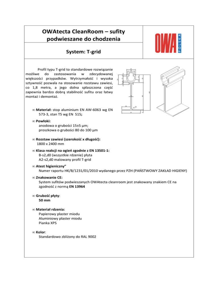 OWAtecta CleanRoom – sufity podwieszane do chodzenia System: T-grid 23 9 15 105 24 • Materiał: stop aluminium EN AW-6063 wg EN 573-3, stan T5 wg EN 515; 80 3 ,25 R1 51 2 29 14 4 24 18 11 6 4 Profil typu T-grid to standardowe rozwiązanie możliwe do zastosowania w zdecydowanej większości przypadków. Wytrzymałość i wysoka sztywność pozwala na stosowanie rozstawu zawiesi, co 1,8 metra, a jego dolna spłaszczona część zapewnia bardzo dobrą stabilność sufitu oraz łatwy montaż i demontaż. • Powłoki: anodowa o grubości 15±5 μm; proszkowa o grubości 80 do 100 μm • Rozstaw zawiesi (szerokość x długość): 1800 x 2400 mm • Klasa reakcji na ogień zgodnie z EN 13501-1: B-s2,d0 (wszystkie rdzenie) płyta A2-s2,d0 malowany profil T-grid • Atest higieniczny” Numer raportu HK/B/1231/01/2010 wydanego przez PZH (PAŃSTWOWY ZAKŁAD HIGIENY) • Znakowanie CE: System sufitów podwieszanych OWAtecta cleanroom jest znakowany znakiem CE na zgodność z normą EN 13964 • Grubość płyty: 50 mm • Materiał rdzenia: Papierowy plaster miodu Aluminiowy plaster miodu Pianka XPS • Kolor: Standardowo zbliżony do RAL 9002 OWAtecta CleanRoom – sufity podwieszane do chodzenia System: T-grid Model sufitu na profilu typu T-grid i powiększenia najważniejszych elementów 18 0 00 24 0 18 00 24 00 OWAtecta CleanRoom – sufity podwieszane do chodzenia System: T-grid T-grid - siatka 1800 w w 1800 w w w A C B B w w w A 2400 2400 2400 T-grid przekroje i wykończenia 1800 1800 A-A 2400 2400 50 3 2400 2400 B-B C-C OWAtecta CleanRoom – sufity podwieszane do chodzenia System: T-grid System sufitów podwieszanych OWAtecta cleanroom został zaprojektowany tak, aby umożliwić bezpieczny dostęp do urządzeń zamontowanych w panelach sufitowych. W związku z powyższym panele bez względu na to czy posiadają fabrycznie wykonane otwory montażowe czy nie, muszą nadawać się do chodzenia. Wszystkie otwory wzmacniane są dodatkowymi kształtownikami stalowymi, dzięki którym panel nie traci swojej wytrzymałości pomimo osadzonych w nim elementów takich jak lampy, nawiewniki, jednostki FFU itd. Otwory w płytach sufitowych przeznaczonych do chodzenia mogą być wykonywane tylko i wyłącznie fabrycznie. Nie dopuszcza się wykonywania otworów na budowie.