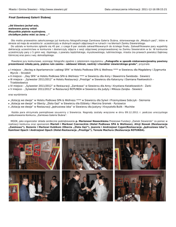 Miasto i Gmina Siewierz - http://www.siewierz.pl/ Data umieszczenia informacji: 2011-12-16 09:15:21 Finał Zamkowej Galerii Ślubnej „Od Siewierz jechał wóz, malowane panny wiózł. Wszystkie pięknie wystrojone, chciałbym jedna mieć za żonę …” Oto motto przewodnie zakończonego już konkursu fotograficznego Zamkowa Galeria Ślubna, skierowanego do „Młodych par|”, które w okresie od maja do września br. uczestniczyły w ślubnych sesjach zdjęciowych w ruinach i na błoniach Zamku Siewierskiego. Do udziału w konkursie zgłosiło się 45 par, z czego 8 par zostało zakwalifikowanych do ścisłego finału. Zakwalifikowane pary wypełniły deklarację uczestnictwa w konkursie i dostarczyły zdjęcia z sesji zdjęciowej przeprowadzonej na Zamku Siewierskim w br. W konkursie uczestniczyły pary z 5 gmin woj. śląskiego, z powiatu będzińskiego, myszkowskiego, lublinieckiego, miasta (na prawach powiatu) Dąbrowy Górniczej oraz para z woj. dolnośląskiego. Powołane jury konkursowe, oceniając fotografie zgodnie z założeniem regulaminu: „Fotografie w sposób niekonwencjonalny powinny prezentować młodą parę, piękno ruin zamku – oddawać klimat, nastrój i charakter siewierskiego grodu”, przyznało: ■ ■ ■ ■ ■ I miejsce - „Nocleg w Apartamencie i zabiegi SPA” w Hotelu Podkowa SPA & Wellness **** w Siewierzu dla Magdaleny i Zygmunta Myrcik – Strzebiń II miejsce - „Day SPA” w Hotelu Podkowa SPA & Wellness **** w Siewierzu dla Anny i Sławomira Świeboda - Siewierz III miejsce - „Sylwester 2011/2012” w Hotelu Restauracji „Prestige” w Siewierzu dla Katarzyny i Damiana Pawłowskich – Trzebiesławice IV miejsce - „Sylwester 2011/2012” w Restauracji „Zamkowa” w Siewierzu dla Anny i Krystiana Kwiatkowskich - Żarki V miejsce - „Sylwester 2011/2012” w Restauracji ROTUNDA w Siewierzu dla Judyty i Miłosza Zaręba - Siewierz oraz wyróżnienia ■ ■ ■ „Kolację we dwoje” w Hotelu Podkowa SPA & Wellness **** w Siewierzu dla Sylwii i Przemysława Sobczyk - Siemonia „Kolację we dwoje” w Oberży „Złota Gęś” w Siewierzu dla Elżbiety i Marcina Sromek - Pyrzowice „Kolację we dwoje” w Restauracji „Jędrusiowa Izba” w Siewierzu dla Justyny i Krzysztofa Bulik - Muchów Każda para otrzymała pamiątkowe souveniry z Siewierza. Nagrody zostały wręczone w dniu 09.12.2011 r. podczas uroczystego podsumowania Konkursu „Zamkowa Galeria Ślubna”. MGOK, jako organizator składa serdeczne podziękowania p. Marianowi Nowackiemu Prezesowi Fundacji „Zamek Siewierski” za pomoc w realizacji konkursu oraz sponsorom Marioli i Markowi Czerneckim (Hotel Podkowa SPA & Wellness), Alicji Nowak (Restauracja „Zamkowa”), Bożenie i Markowi Kubikom (Oberża „Złota Gęś”), Joannie i Andrzejowi Cygan(Restauracja „Jędrusiowa Izba”), Kamilowi Opach i Andrzejowi Opach (Hotel-Restauracja „Prestige”), Teresie Machura (Restauracja ROTUNDA). Urząd Miasta i Gminy Siewierz, 42-470 Siewierz, ul. Żwirki i WIgury 16, tel. 32 64 99 400, e-mail: [email protected] Burmistrz Miasta i Gminy Siewierz mgr Zdzisław Banaś
