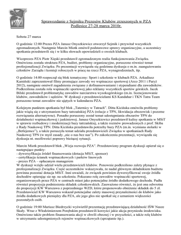 Sprawozdanie z Sejmiku Prezesów Klubów zrzeszonych w PZA Podlesice 27-28 marca 2010r. Sobota 27 marca O godzinie 12:00 Prezes PZA Janusz Onyszkiewicz otworzył Sejmik i przywitał wszystkich zgromadzonych. Następnie Marcin Miotk omówił podstawowe sprawy organizacyjne, a uczestnicy spotkania przedstawili się i w kilku słowach opowiedzieli o swoich klubach. Wiceprezes PZA Piotr Xięski przedstawił zgromadzonym realia funkcjonowania Związku. Omówiona została struktura PZA, budżet, problemy organizacyjne, poruszono również temat profesjonalizacji Związku. Po prezentacji wywiązała się godzinna dyskusja o m.in. zaangażowaniu członków Zarządu i komisji roboczych w pracę na rzecz PZA, wynagrodzeniach, itp. O godzinie 14:00 rozpoczął się blok tematyczny: Sport i szkolenie w klubach PZA. Arkadiusz Kamiński zaprezentował filmy promujące zawody we wspinaczce sportowej (Arco 2011 i Paryż 2012), następnie omówił zagadnienia związane z dofinansowaniami i stypendiami dla zawodników. Podkreślona została rola wspinaczki sportowej jako reklamy wszystkich sportów górskich. Jacek Bilski przedstawił problematykę zawodów narciarstwa wysokogórskiego (m.in. licencjonowanie klubów, zawodników i sędziów. W dyskusji z przedstawicielami KS Kandahar i TKN Tatra Team poruszono temat zawodów nie ujętych w kalendarzu PZA. Kolejnym punktem spotkania był blok „Taternicy w Tatrach”. Ditta Kicińska omówiła problemy jakie wiążą się z utrzymaniem bazy tatrzańskiej PZA (relacje z TPN, likwidacja obozowisk i pozorne rozwiązania alternatywne). Ponadto poruszony został temat udostępniania obszarów TPN do działalności wspinaczkowej i jaskiniowej. Janusz Onyszkiewicz przedstawił kulisy spotkania w MSiT w sprawie rozbudowy i modernizacji bazy tatrzańskiej, a także rozmów prowadzonych z prof. Skiba z Rady Naukowej TPN. Ditta Kicińska przedstawiła potrzeby bazy PZA (m.in. wymiana stolarki w „Betlejemce”), a także poruszyła temat udziału przedstawicieli Związku w spotkaniach Rady Naukowej TPN (w myśl zasady „nic o nas bez nas”). Po zakończeniu prezentacji, wywiązała się dyskusja nt. możliwości poprawy bieżącej sytuacji. Marcin Miotk przedstawił blok „Wizja rozwoju PZA”. Przedstawiony program dyskusji opierał się o następujące punkty: - dywersyfikacja źródeł finansowania (dotacja MSiT, sponsor) - certyfikacja ścianek wspinaczkowych i parków linowych - prezes PZA – opłacanym managerem W dyskusji wzięło udział wielu przedstawicieli klubów. Ponownie podkreślono zalety płynące z profesjonalizacji Związku. Część uczestników wskazywała, że nadal głównym składnikiem budżetu powinna pozostać dotacja MSiT. Inni uważali, że związek powinien dywersyfikować swoje źródła dochodów opierając sie np. na szkoleniu. Pokazano rolę zawodów wspinaczki sportowej, organizowanych przez PZA w centrach miast jako potencjalne źródło dodatkowego dochodu. Padła również propozycja podniesienia składek członkowskich. Zauważono również, że jest ona odwrotna do propozycji KW Warszawa z poprzedniego WZD, które proponowało obniżenie składek do 5 zł. Przedstawiciel KW Warszawa wskazał potencjalne zalety masowej przynależności do klubów jako źródła dodatkowych pieniędzy dla PZA, ale jego głos nie spotkał się z uznaniem większości pozostałych osób. O godzinie 19:00 Mariusz Biedrzycki wyświetlił prezentację przedstawiającą działalność IŚW Nasze Skały. Wraz z Włodzimierzem Porębskim przedstawili korzyści jakie akcja przyniosła środowisku. Omówiono także problem finansowania akcji w chwili obecnej i w przyszłości, a także rolę klubów w utrzymaniu udostępnionych rejonów wspinaczkowych (sprzątanie itp.). Niedziela 28 marca O godzinie 9:00 Artur Hajzer przedstawił program „Polski Himalaizm Zimowy”. Na początku przedstawił przykładowe warunki atmosferyczne panujące w Karakorum zimą. Zwrócił uwagę na bardzo krótki czas, w którym można przeprowadzić atak szczytowy. Następnie długofalowe założenia projektu i zasady jego finansowania. Został poruszony temat udziału młodych himalaistów w projekcie. W dyskusji, która wywiązała na temat roli himalaizmu w przyszłości PZA udział wzięli m.in. Janusz Onyszkiewicz i Piotr Xięski. Kolejnym punktem spotkania był blok „PZA – związek czterech dyscyplin. Czy i dlaczego chcemy by tak pozostało”. Marek Wierzbowski wyświetlił prezentację przedstawiającą kulisy i konsekwencje podziału UIAA i UIS. Zwrócił uwagę, że w przypadku podziału PZA może być podobnie. W dyskusji nt. konsekwencji ewentualnego podziału wzięli udział m. in. Piotr Xięski i Janusz Onyszkiewicz. Zebrani zgodnie stwierdzili, że poprzez skupianie czterech specjalności Związek jest silniejszy i ma większe możliwości rozwoju. Nowa redaktor „Taternika” Renata Wcisło przedstawiła propozycje nt. przyszłości pisma PZA. Wywiązała się dyskusja, w której udział wzięli m.in. K. Rychlik, W. Porębski, P. Xięski, M. Miotk. Poruszono następujące problemy: - ustalenie grupy docelowej odbiorców - zawartość pisma (sprawozdania, wieści z klubów, polemiki) - częstotliwość ukazywania się pisma, wydawca - działania promocyjne i rola klubów w promocji „Taternika” - wersja anglojęzyczna i strona www - reklamy w taterniku Zebrani zgodnie stwierdzili, że odbiorcami „Taternika” są głównie osoby starsze i kolekcjonerzy, co może negatywnie wpłynąć na przyszłość Taternika jeśli nie pozyska on młodych czytelników. Relacje z wypraw ukazują się po opublikowaniu w innych pismach, przez co są nieaktualne. W pozostałych kwestiach nie osiągnięto porozumienia. Zbigniew Sołtys przedstawił elektroniczną wersję archiwalnych numerów „Taternika”. Bogusław Kowalski – szef komisji szkolenia, przedstawił projekt nowej ustawy o sporcie, w myśl której sport zostanie podzielony na kwalifikowany (współ
