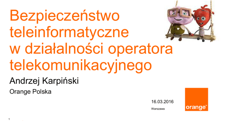 Bezpieczeństwo teleinformatyczne w działalności operatora telekomunikacyjnego Andrzej Karpiński Orange Polska 16.03.2016 Warszawa 1 Orange Restricted O czym będzie ten wykład • Po co bezpieczeństwo u operatora telekomunikacyjnego – niechciany koszt? • Zadania związane z bezpieczeństwem teleinformatycznym u operatora • Nowe zjawiska na rynku – e-Obywatel, IoT, mobilny świat • Przykłady realizacji zadań związanych z bezpieczeństwem • Znaczenie bezpieczeństwa z punktu widzenia klienta 2 Orange Restricted Wyzwania w zakresie bezpieczeństwa po co bezpieczeństwo u operatora • Dane • Użytkownicy i ich zachowania, bezpieczeństwo klientów • Bezpieczeństwo sieci telekomunikacyjnej • Bezpieczeństwo wewnętrzne • Aplikacje i systemy teleinformatyczne • Bezpieczeństwo regulacyjne • Ochrona biznesu • Bezpieczeństwo środowiska (Internetu), cyberbezpieczeństwo 3 Orange Restricted Kategorie zadań związanych z bezpieczeństwem w działalności operatora telekomunikacyjnego • Zarządzanie dostępem • Systemy bezpieczeństwa • Bezpieczne systemy (security by design) • Audyty i kontrole • Obsługa incydentów bezpieczeństwa • Działania związane z wymogami prawnymi i regulacyjnymi • Usługi związane z bezpieczeństwem • Edukacja, współpraca międzyoperatorska i międzynarodowa i RnD 4 Orange Restricted Nowe zjawiska na rynku • Procesy konsolidacji, optymalizacji, zjawisko outsourcingu • Wzrost zagrożeń zewnętrznych i wewnętrznych w związku z sytuacją geopolityczną na świecie • Wzrost pojemności sieci i ilości przesyłanego przez nie ruchu • Migracja sieci z wyspowych światów technologicznych w kierunku „wszystko po IP” • Rozwój segmentu smartfonów • Wzrost znaczenia usług świadczonych drogą elektroniczną • Internet rzeczy, inteligentny dom • Cloudyzacja świata • Konwergencja w zakresie ofert i usług - teraz już nie tylko triple play • Nowe metodyki zarządzania projektami (SCRUM, Agile) •5 Nowe usługi z zakresu bezpieczeństwa, nowe oczekiwania klientów i rynku Orange Restricted Przykłady realizacji zadań związanych z bezpieczeństwem • Filtrowanie portów NetBIOS • Blokada Portu 25 (SMTP) w sieci Neostrada • NBIG - firewall w Internet DSL • AntyVirus as a Service • CERT Orange Polska, Security Operations Center • Blackholing • Tabaluga - parental control • CyberTarcza Orange • DDoS Protection •6 Testy odporności infrastruktury, audyty, bezpieczeństwo as a service Orange Restricted 7 Orange Restricted Znaczenie bezpieczeństwa • • • • • 8 Czy jesteś e-obywatelem? Raport CERT Oragne Polska 2015 Ćwiczenia CyberExe 2015 Doktryna Cyberbezpieczeństwa RP Założenia Strategii Cyberbezpieczeństwa dla Rzeczypospolitej Polskiej Orange Restricted Dziękuję