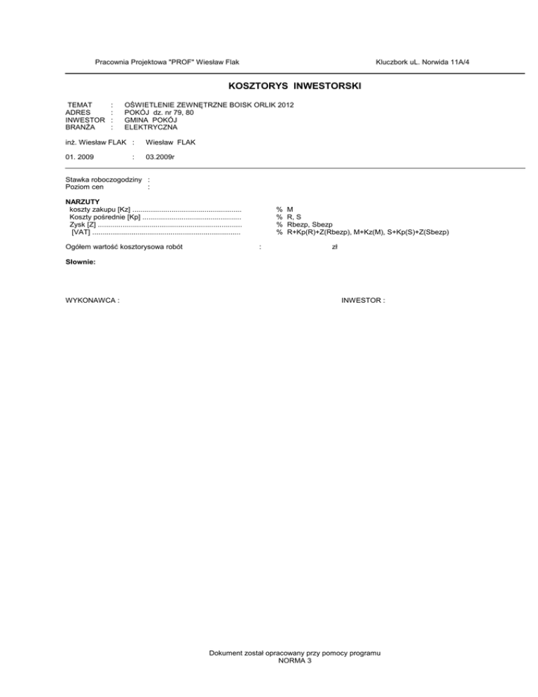 Pracownia Projektowa "PROF" Wiesław Flak Kluczbork uL. Norwida 11A/4 KOSZTORYS INWESTORSKI TEMAT ADRES INWESTOR BRANśA : : : : OŚWIETLENIE ZEWNĘTRZNE BOISK ORLIK 2012 POKÓJ dz. nr 79, 80 GMINA POKÓJ ELEKTRYCZNA inŜ. Wiesław FLAK : Wiesław FLAK 01. 2009 03.2009r : Stawka roboczogodziny : Poziom cen : NARZUTY koszty zakupu [Kz] ..................................................... Koszty pośrednie [Kp] ................................................ Zysk [Z] ...................................................................... [VAT] ........................................................................ Ogółem wartość kosztorysowa robót % % % % : M R, S Rbezp, Sbezp R+Kp(R)+Z(Rbezp), M+Kz(M), S+Kp(S)+Z(Sbezp) zł Słownie: WYKONAWCA : INWESTOR : Dokument został opracowany przy pomocy programu NORMA 3 ORLIK-Pokój- Ośw zew KSIĄśKA PRZEDMIARÓW Lp. Podst Opis i wyliczenia 1 1.1 OŚWIETLENIE ZEWNĘTRZNE CPV 45316110-9 1.1.1 KNR-W 2-01 Ręczne kopanie rowów dla kabli o głębokości do 0.6 m i szer. dna do 0.4 w gruncie 0701-02 1) kat. III 332 j.m. m m 1.1.3 KNR-W 2-01 Ręczne kopanie rowów dla kabli o głębokości do 0.6 m i szer. dna do 0.6 w gruncie 0701-05 1) kat. III 52 m 1.1.4 KNR-W 2-01 Ręczne zasypywanie rowów dla kabli o głębokości do 0.4 m i szer. dna do 0.6 m w 0704-05 1) gruncie kat. III 52 m 1.1.5 KNNR 5 0706-01 2) Nasypanie warstwy piasku na dnie rowu kablowego o szerokości do 0.4 m m 228 m Przewierty ręczne dla rury stalowej o śr.do 100 mm pod obiektami m 4 m Układanie kabli o masie do 0.5 kg/m w rowach kablowych ręcznie m 565 m 1.1.7 KNNR 5 0707-01 2) 1.1.8 KNNR 5 0713-01 2) 1.1.9 KNNR 5 1001-01 2) 1.1.1 KNNR 5 0 0411-05 2) 1.1.1 KNNR 5 1 1001-01 2) m m m 90 m MontaŜ i stawianie słupów oświetleniowych o masie do 100 kg szt. 5 szt. Fundamenty prefabrykowane betonowe w gruncie kat.III o objętości w wykopie do 0.25 m3 pod rozdzielnice 5 szt. MontaŜ i stawianie słupów oświetleniowych o masie do 100 kg szt. 4 szt. szt. m3 1.1.1 KNNR 5 3 1001-02 2) MontaŜ i stawianie słupów oświetleniowych o masie do 300 kg szt. 6 szt. Łączniki świecznikowe szt. 5 szt. MontaŜ projektorów oświetleniowych na wieŜy projektorowej kpl. 12 kpl. MontaŜ projektorów oświetleniowych na wieŜy projektorowej kpl. 8 kpl. MontaŜ przewodów do opraw oświetleniowych - wciąganie w słupy, rury osłonowe i wysięgniki przy wysokości latarń do 10 m 15 kpl.prz ew. kpl.prz ew. MontaŜ opraw oświetlenia zewnętrznego na słupie szt. 5 szt. 1.1.1 KNNR 5 5 1008-05 2) 1.1.1 KNNR 5 6 1008-05 2) 1.1.1 KNNR 5 7 1003-03 2) 332.000 RAZEM 332.000 332.000 RAZEM 332.000 52.000 RAZEM 52.000 52.000 RAZEM 52.000 228.000 RAZEM 228.000 4.000 RAZEM 4.000 565.000 RAZEM 565.000 90.000 RAZEM 90.000 5.000 RAZEM 5.000 5.000 RAZEM 5.000 4.000 RAZEM 4.000 6.500 RAZEM 6.500 6.000 RAZEM 6.000 5.000 RAZEM 5.000 12.000 RAZEM 12.000 8.000 RAZEM 8.000 Układanie kabli o masie do 0.5 kg/m w rurach, pustakach lub kanałach zamkniętych m 1.1.1 KNR-W 2-01 Wykopy ręczne o głębokości do 1.5 m w gruncie kat. III wraz z zasypaniem dla słu2 0707-02 1) pów elektroenergetycznych linii napowietrznych niskiego napiecia 6.5 1.1.1 KNNR 5 4 0307-02 2) m3 15.000 RAZEM 1.1.1 KNNR 5 8 1004-01 2) 1.1.1 KNNR 5 9 0606-04 2) Razem m 1.1.2 KNR-W 2-01 Ręczne zasypywanie rowów dla kabli o głębokości do 0.4 m i szer. dna do 0.4 m w 0704-02 1) gruncie kat. III 332 1.1.6 KNNR 5 0722-01 2) Poszcz Uziomy ze stali profilowanej miedziowane o długości 3 m (metoda wykonania udaro- szt. wa) - grunt kat.III 4 szt. -2- Norma 3.14 Licencja: 13163 dla Pracownia Projektowa "PROF" Wiesław Flak 5.000 RAZEM 4.000 15.000 5.000 ORLIK-Pokój- Ośw zew Lp. Podst KSIĄśKA PRZEDMIARÓW Opis i wyliczenia 1.1.2 KNNR 5 0 1304-01 2) 1.1.2 KNNR 5 1 1203-03 2) 1.1.2 KNNR 5 2 0405-01 2) j.m. Badania i pomiary instalacji uziemiającej (pierwszy pomiar) szt. 4 szt. Podłączenie przewodów pojedynczych o przekroju Ŝyły do 6 mm2 pod zaciski lub bol- szt.Ŝył ce 60 szt.Ŝył Skrzynki i rozdzielnice skrzynkowe o masie do 10 kg wraz z konstrukcją mocowaną do podłoŜa przez zabetonowanie Sterownicza oświetleniem zewnętrznym 1 OPISY PODSTAWY WYCENY Lp. Opis 1 (N.Z.) WACETOB wyd.I 1997, errata z Zeszytu 3/2001 2 Kancelaria Prezesa Rady Ministrów 2001 -3- Norma 3.14 Licencja: 13163 dla Pracownia Projektowa "PROF" Wiesław Flak Poszcz RAZEM Razem 4.000 4.000 RAZEM 4.000 60.000 RAZEM 60.000 1.000 RAZEM 1.000 szt. szt. ORLIK-Pokój- Ośw zew Lp. 1. robocizna ZESTAWIENIE ROBOCIZNY Nazwa Jm r-g Słownie: -4- Norma 3.14 Licencja: 13163 dla Pracownia Projektowa "PROF" Wiesław Flak Ilość Cena jedn. 553.4183 RAZEM Wartość ORLIK-Pokój- Ośw zew Lp. ZESTAWIENIE MATERIAŁÓW Nazwa Jm 1. Rozłącznik FR301 16A 2. wyłaczniki nadprądowe S301C 4A 3. wyłącznik nadmiarowo prądowy S 301 C6A 4. Fundament prefabrykowany FB-W 150 5. wysięgnik dwuramienny P2 6. wysięgnik dwuramienny P2 7. Reduktor do opraw OCP-70 typu R60/48 8. wyłącznik nadprądowy S 301 C 2A 9. Zegar sterujący typu CPA 3.1 "RABBIT" 10. Wyłącznik badprądpwy S301 B 20 A 11. Wyącznik nadprądowy S 301 16 A 12. folia kalandrowana z PCW uplastycznionego grub.po- m2 wyŜej 0.4-0.6 mm gat.I/II 13. piasek m3 14. piasek do betonów m3 15. cement "35" kg 16. płyty drogowe 50x50x10cm szt 17. rury stalowe przewodowe PCV A-75 m 18. skrzynki lub rozdzielnice skrzynkowe RWN-2x12 szt 19. lampa oświetleniowa kompletna OCP-70-PC/II Wilka- kpl sy 20. projektory oświetleniowe 1000 W kpl 21. projektory oświetleniowe 500 W kpl 22. uziom stalowy miedziowany o dług. 1.5 m szt 23. złącza prętów szt 24. grot stalowy szt 25. tabliczka bezpiecznikowa słupowa TZKo szt 26. tabliczka bezpiecznikowa słupowa TZKo szt 27. opaski kablowe typu Oki szt 28. przewody kabelkowe YDY-4x2,5 m 29. kable YKY-4x6 m 30. słupy stalowe CS76-90/4 szt 31. słupy stalowe CS76-110/4 szt 32. słupy stalowe SO (SOO 60/40/3 szt 33. fundament prefabrykowany betonowy F-100 szt 34. materiały pomocnicze zł I